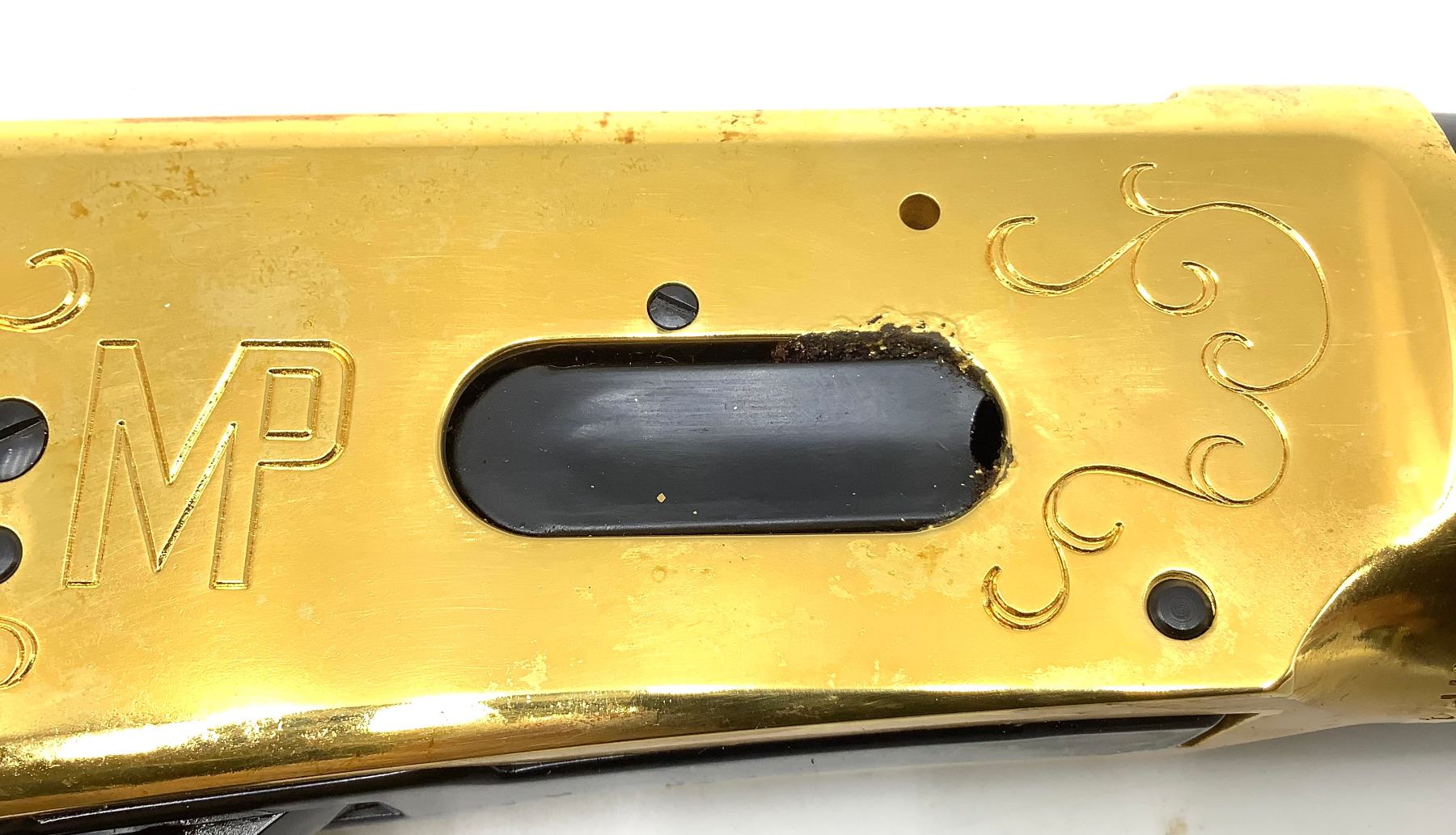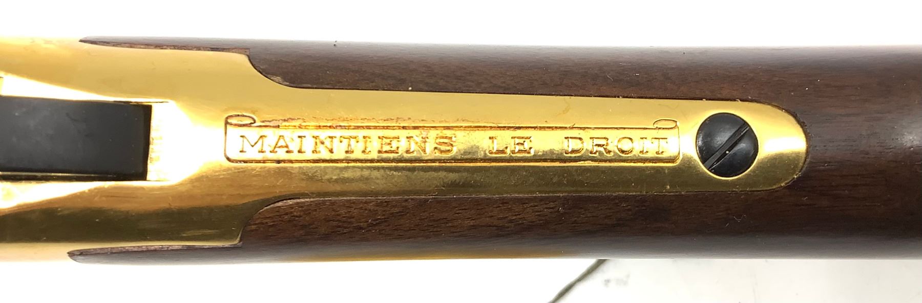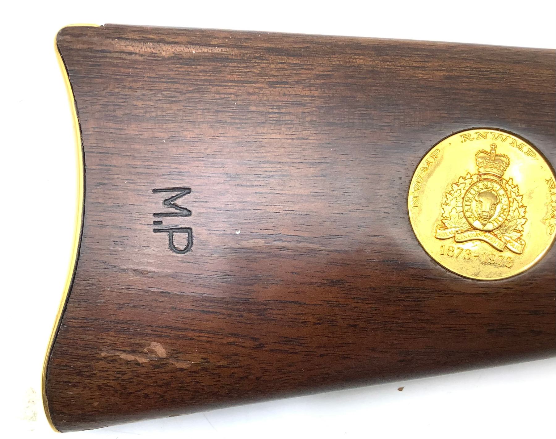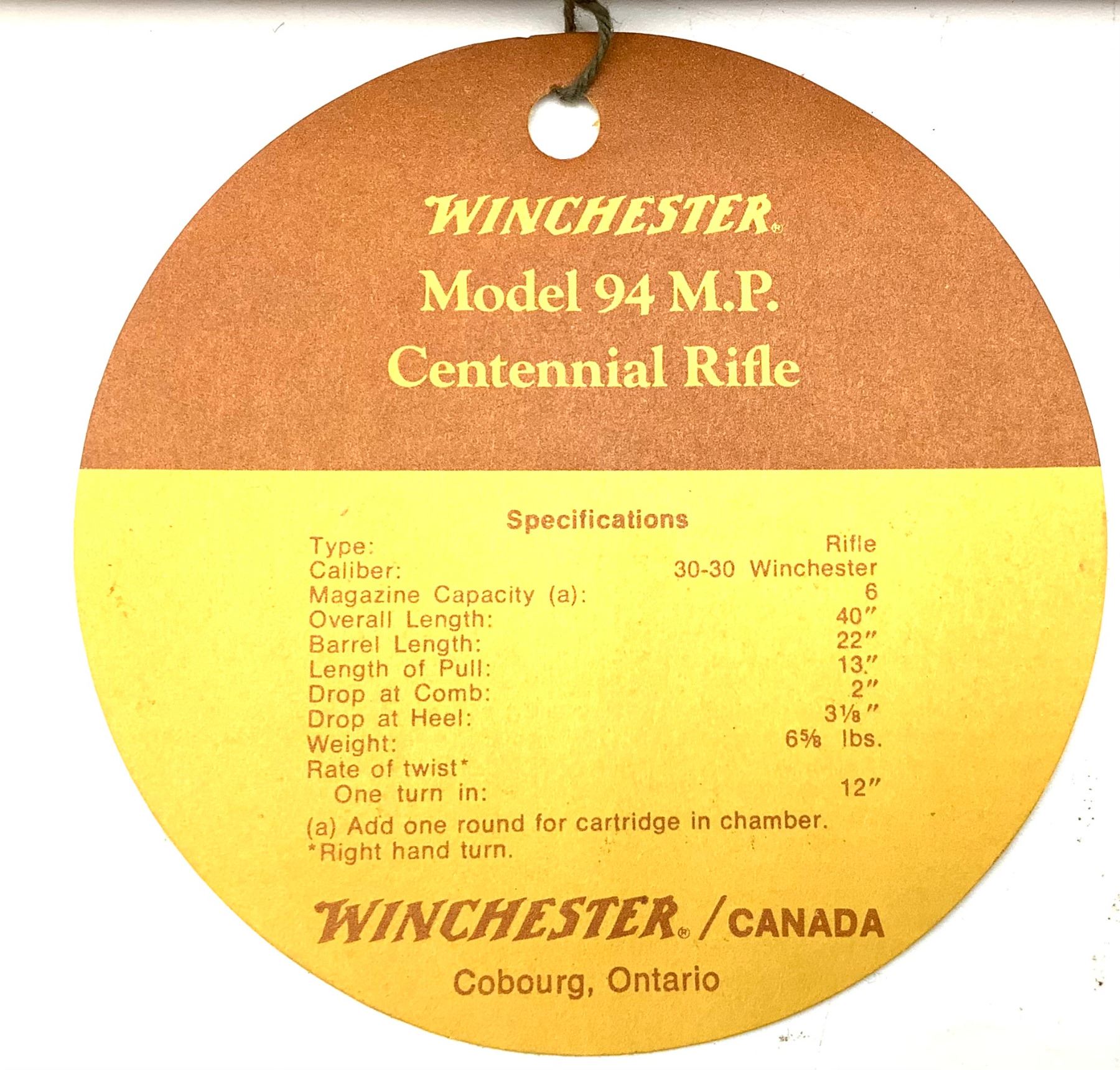 An unfired Centennial Winchester 94 lever-action rifle, 22" barrel chambered in .30-30 Winchester. This rifle has some water damage evident on the buttstock (photos) and rust blistering under the gold finish by the ejection port. The paper sleeve is worn and torn (photos). Otherwise appears to be in good condition.