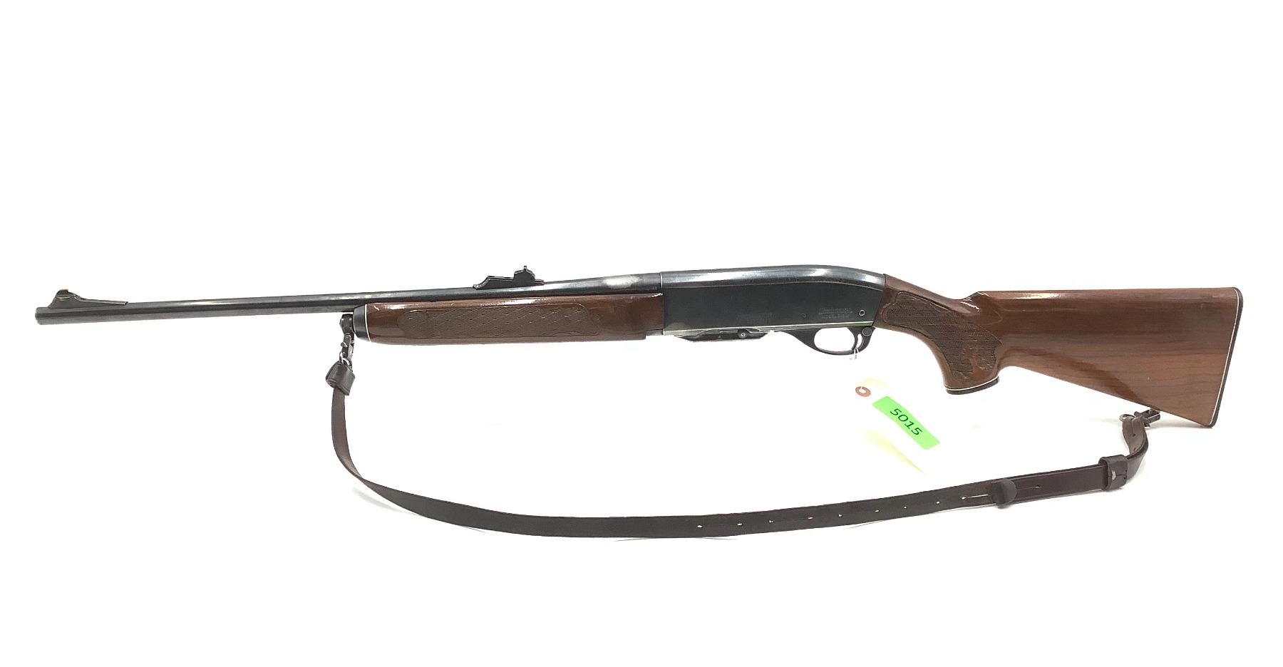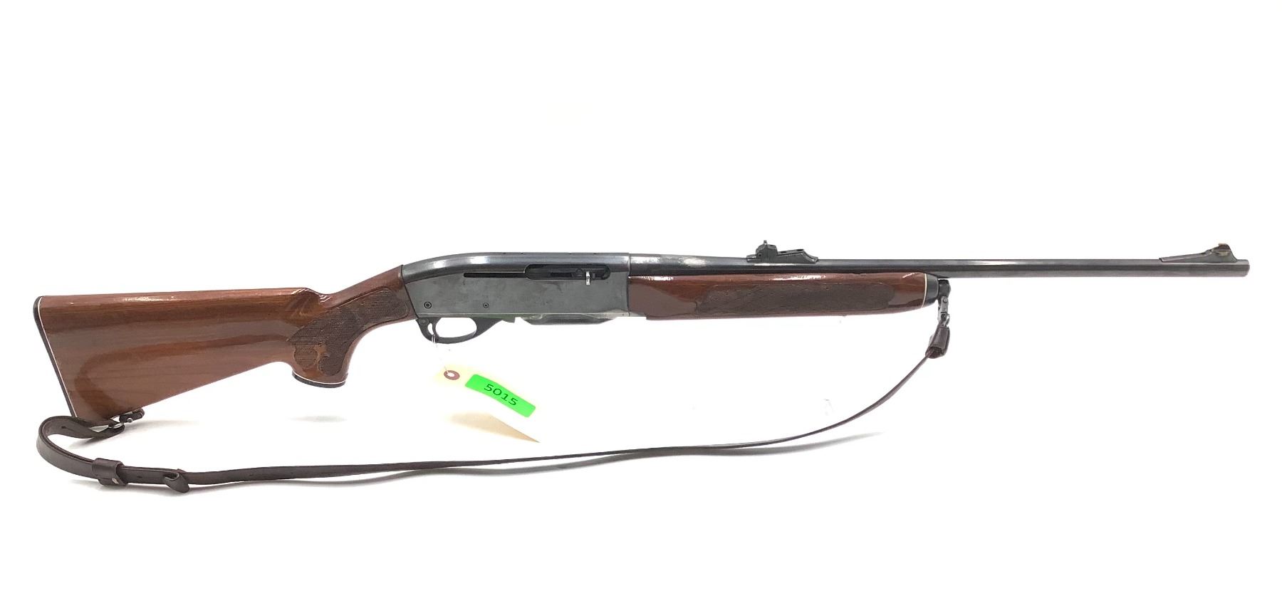 Remington 742 Semi Auto Rifle 308 Win 22" Barrel Wood Stock. Detachable magazine, open sights. Receiver drilled and tapped. Includes leather sling. Wood stock shows scratches and nicks and some wear on front forend; metal finish has wear on receiver and barrel. This is a non-restricted firearm.