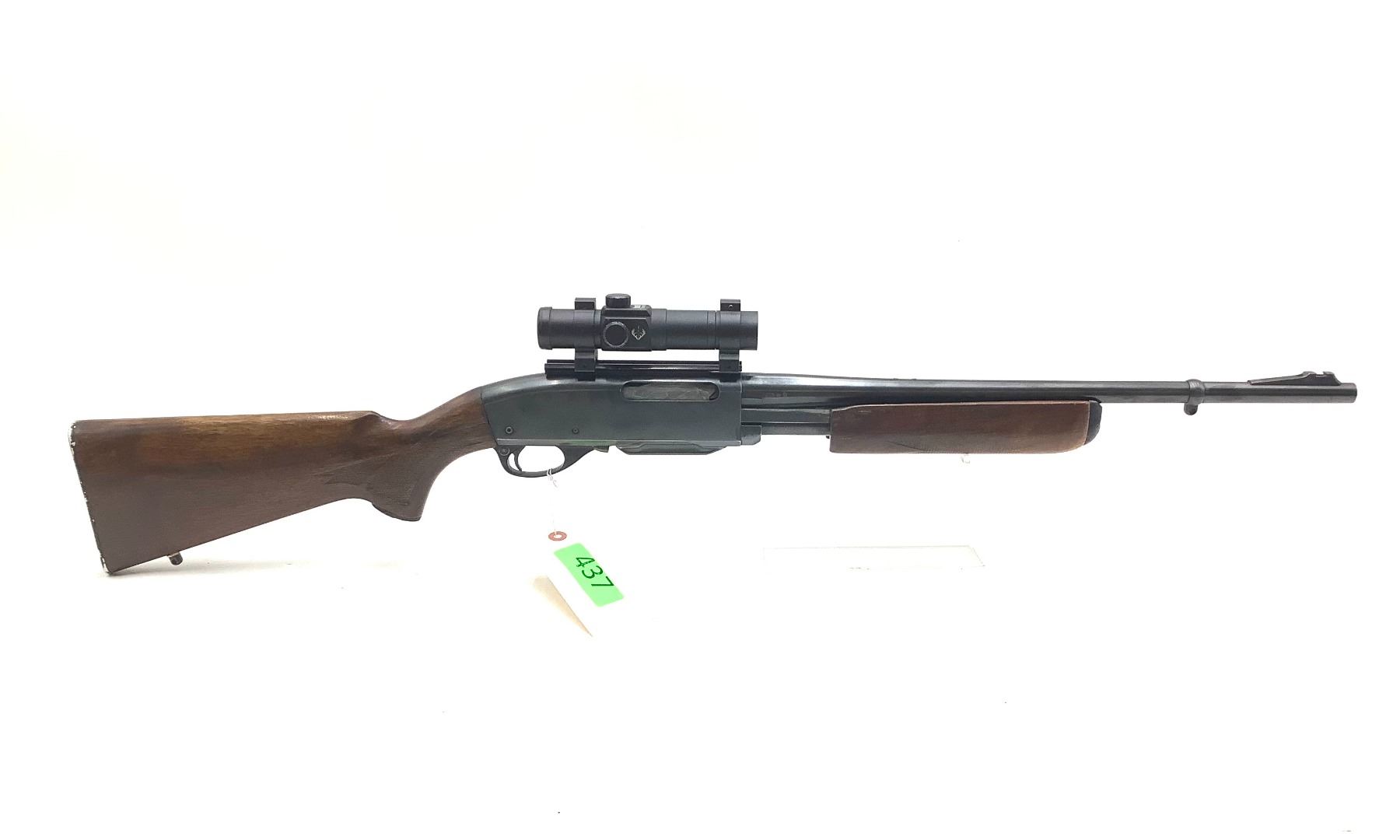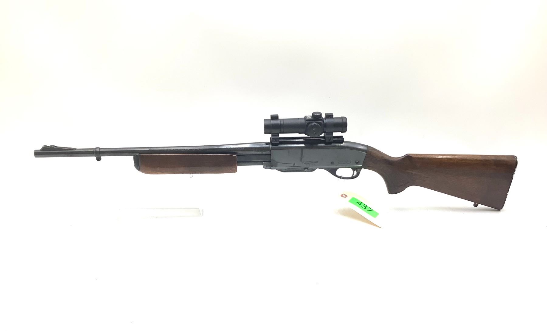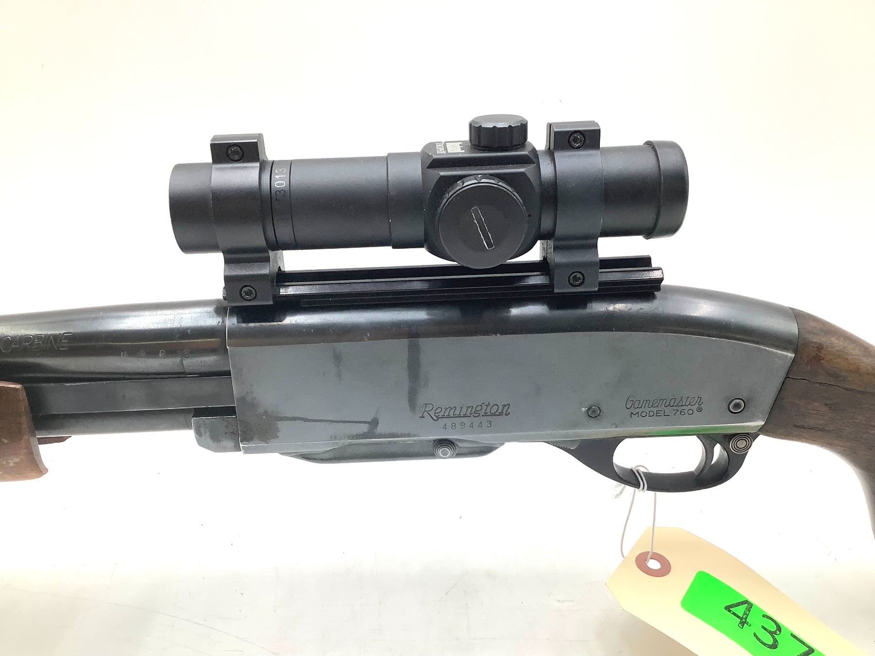 Remington 760 Gamemaster Carbine Pump Action Rifle 30/06 18.5" Barrel Wood Stock With Red Dot. Receiver drilled and tapped with rail installed. Comes with Bushnell Trophy Red Dot. Detachable magazine, includes sling mounts. Wood stock is cracked in several places. This is a non-restricted firearm.