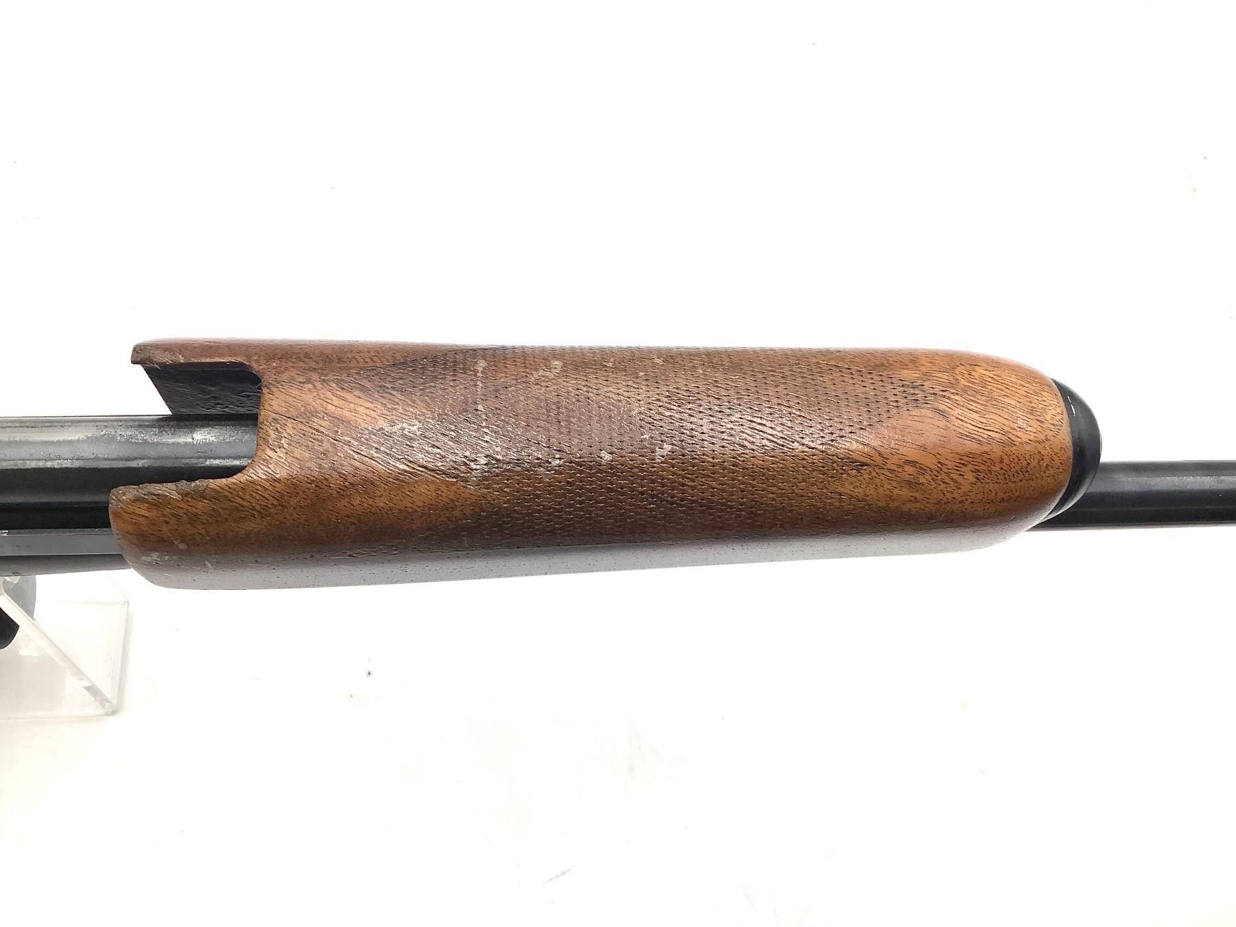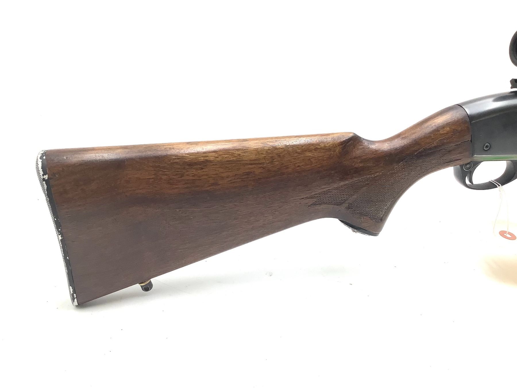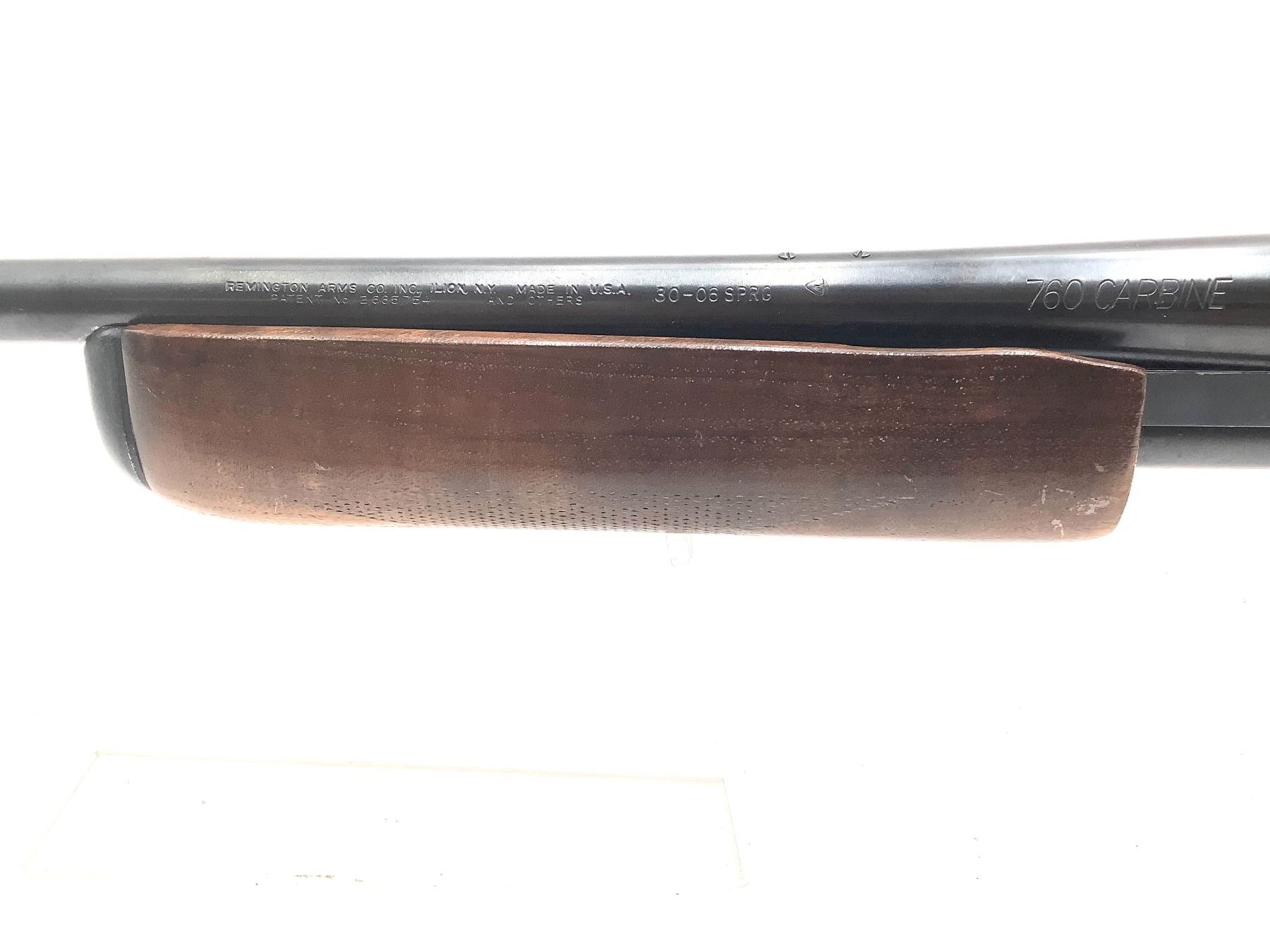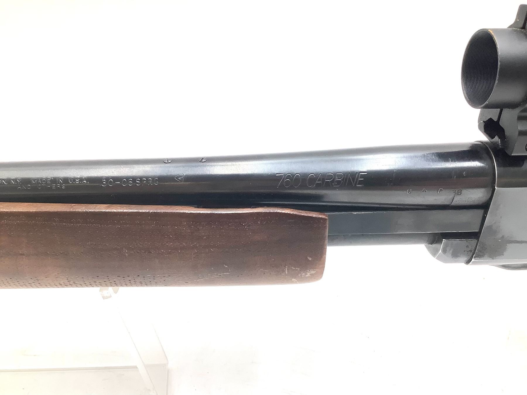 Remington 760 Gamemaster Carbine Pump Action Rifle 30/06 18.5" Barrel Wood Stock With Red Dot. Receiver drilled and tapped with rail installed. Comes with Bushnell Trophy Red Dot. Detachable magazine, includes sling mounts. Wood stock is cracked in several places. This is a non-restricted firearm.