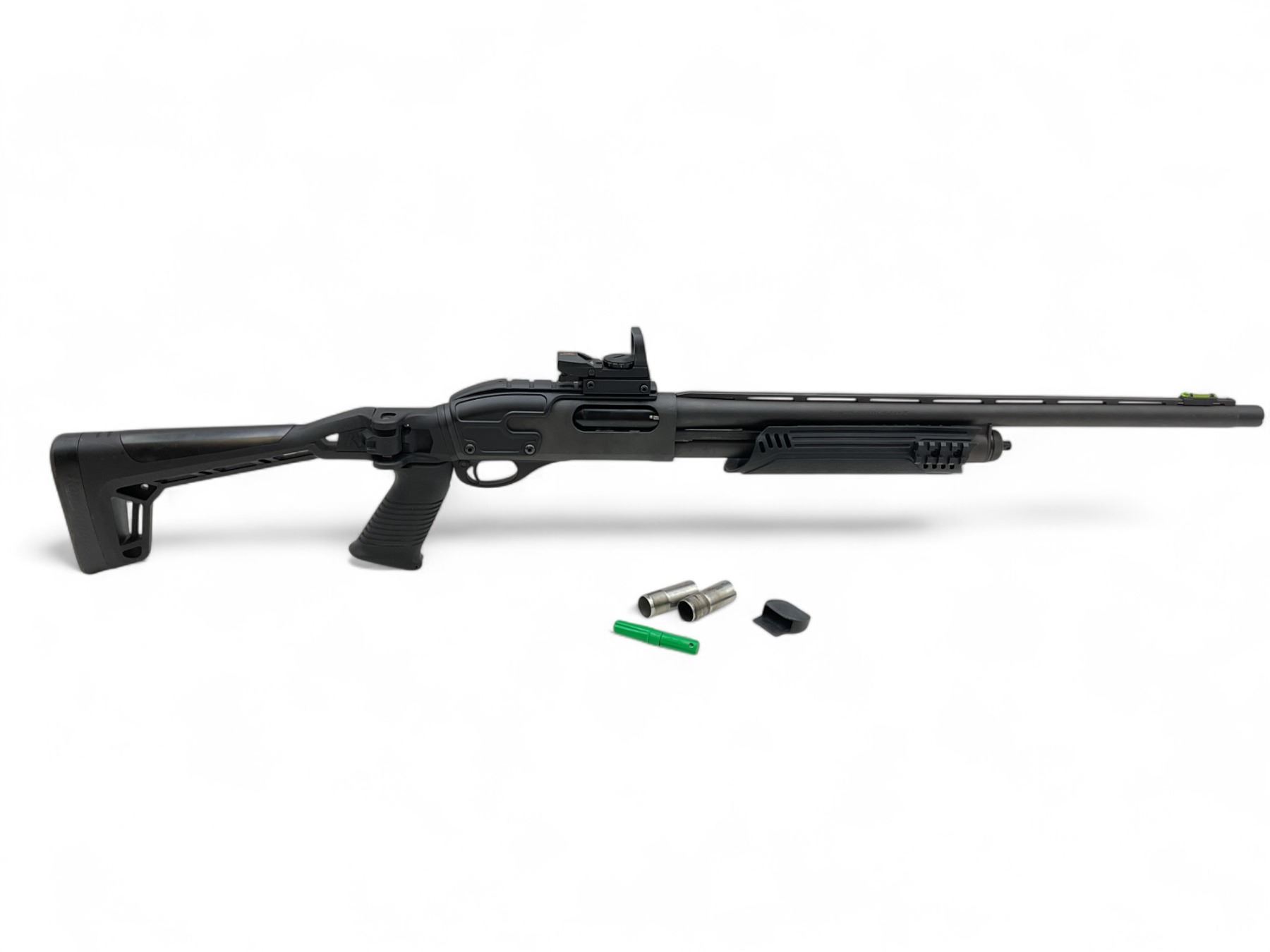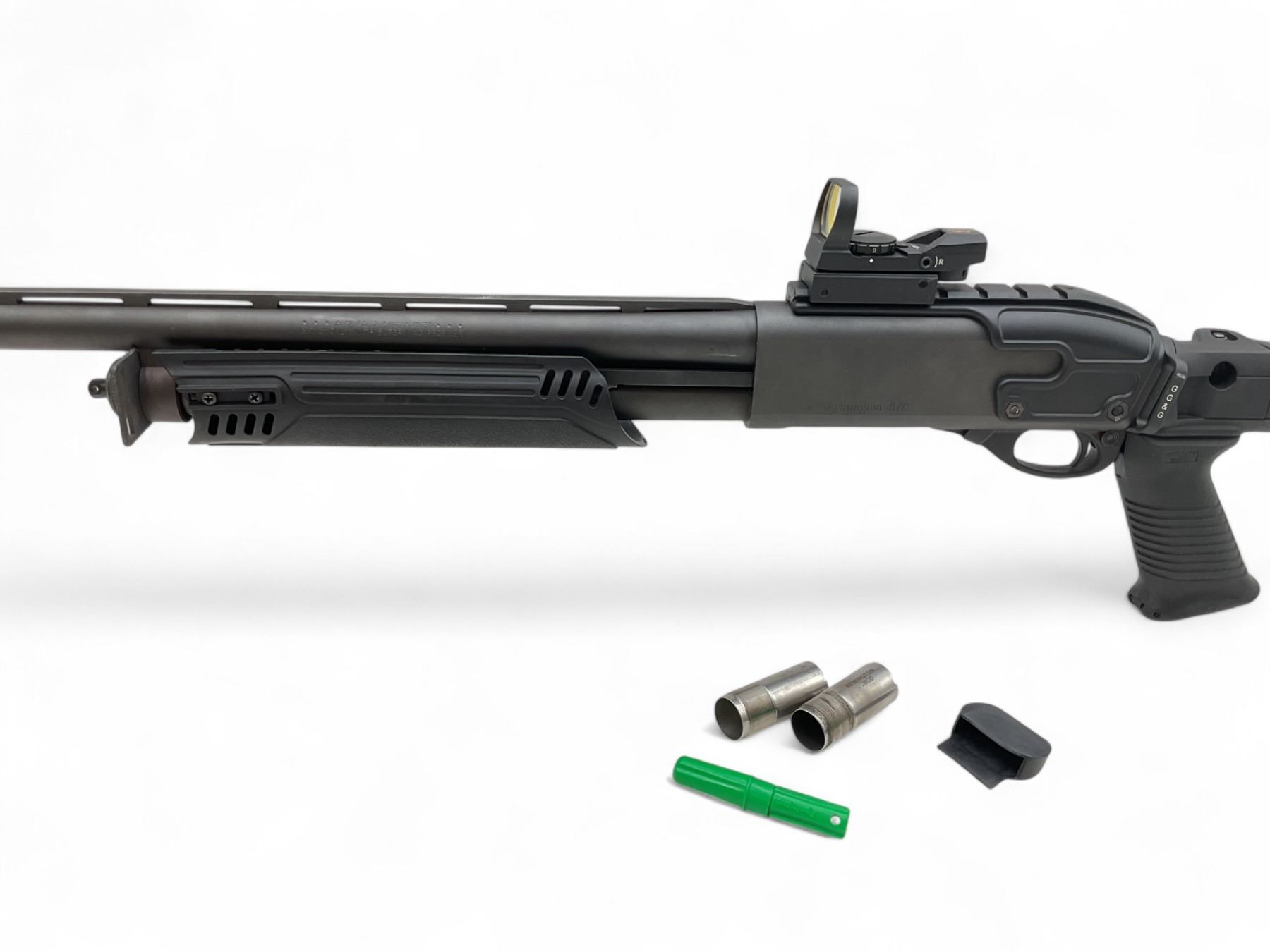 Remington 870 Pump Action Shotgun 12Ga 3" Chamber 21" Vent Rib Barrel Folding Stock With Optic. Fiber optic sight; comes with removable chokes. GG&G sling mounts; saddle mount with Browning Red dot sight. This is a non-restricted firearm.