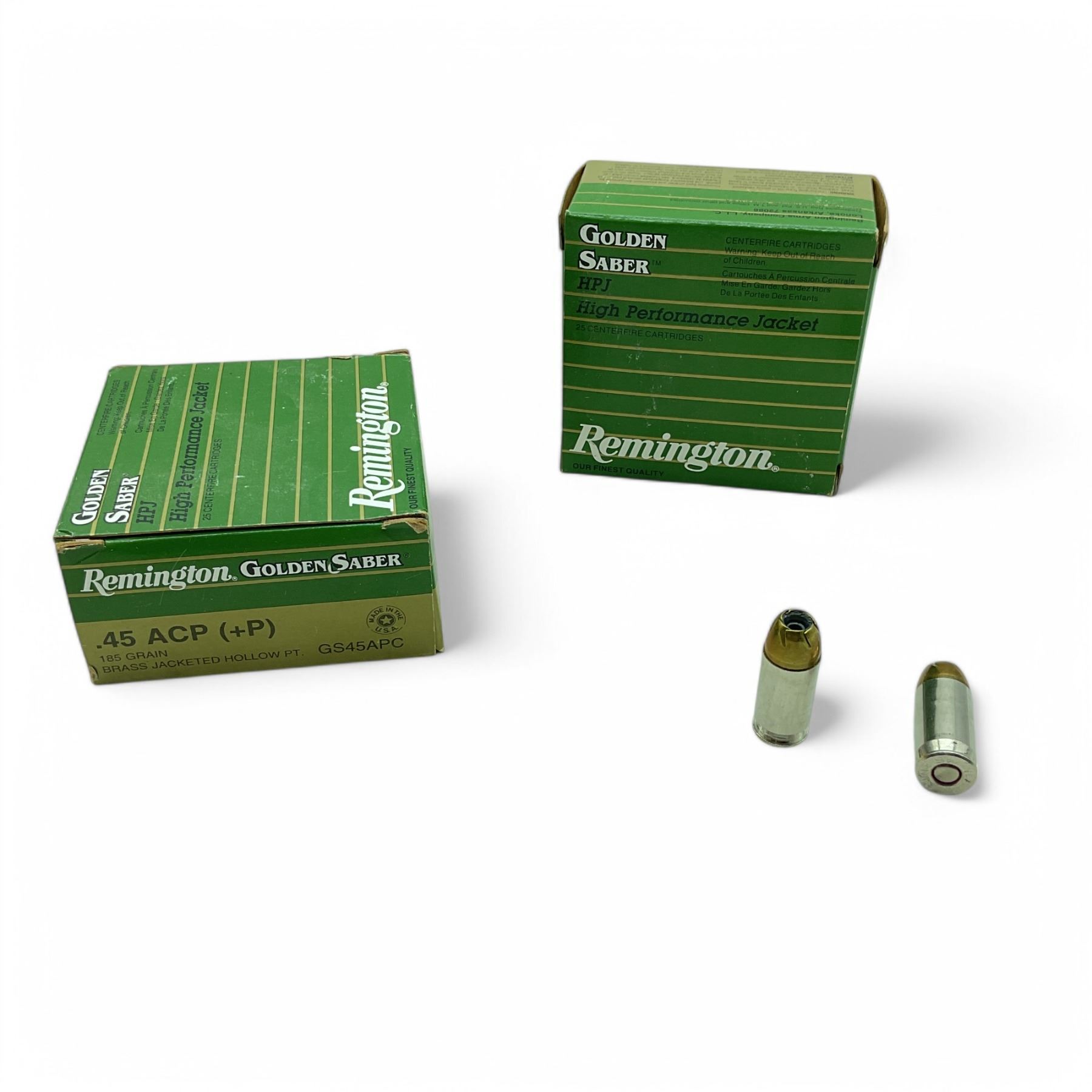 Remington Gold Saber .45 ACP (+P), 185 Grain Brass Jacketed Hollow Point ammunition, 25 Rounds