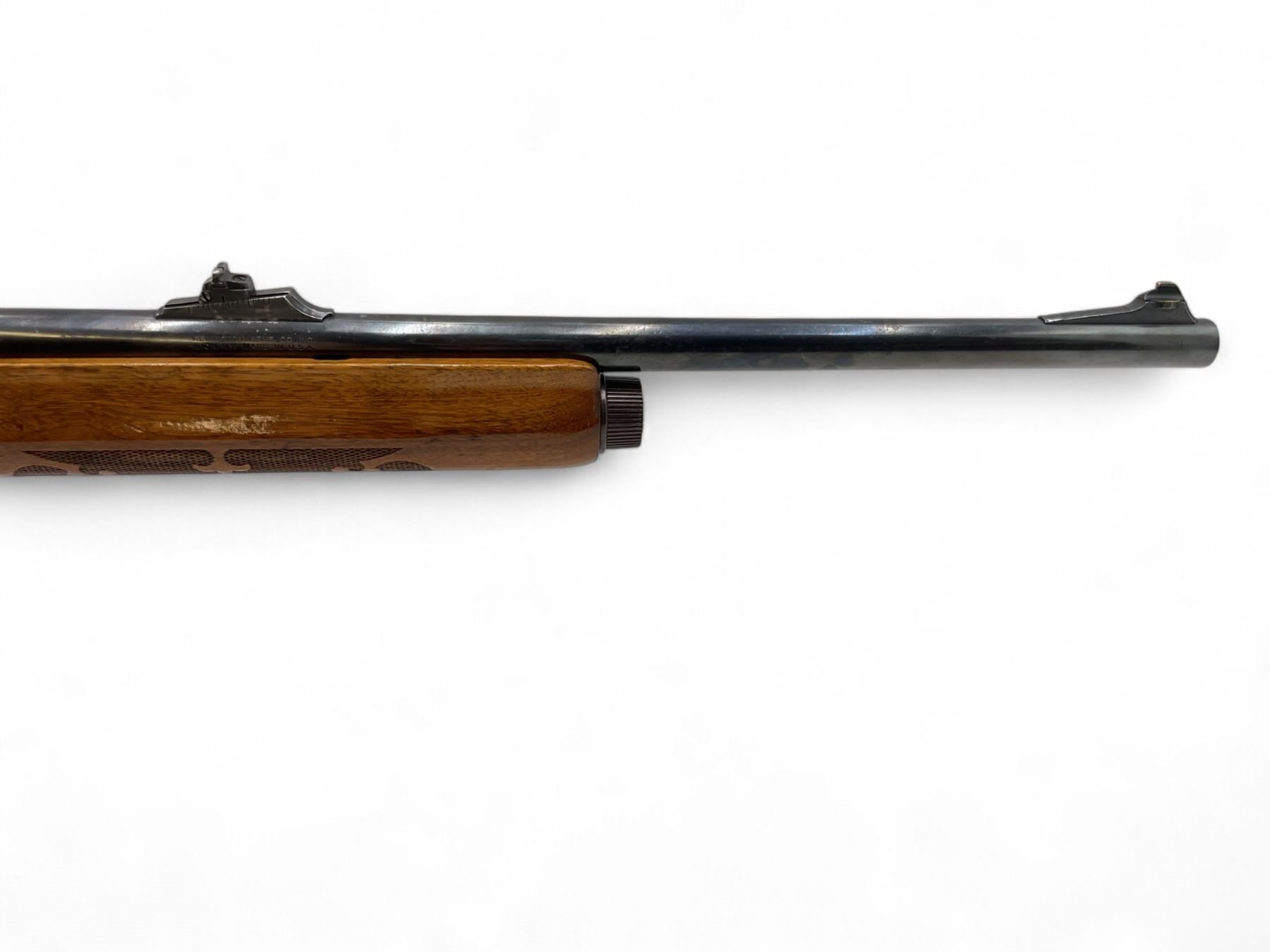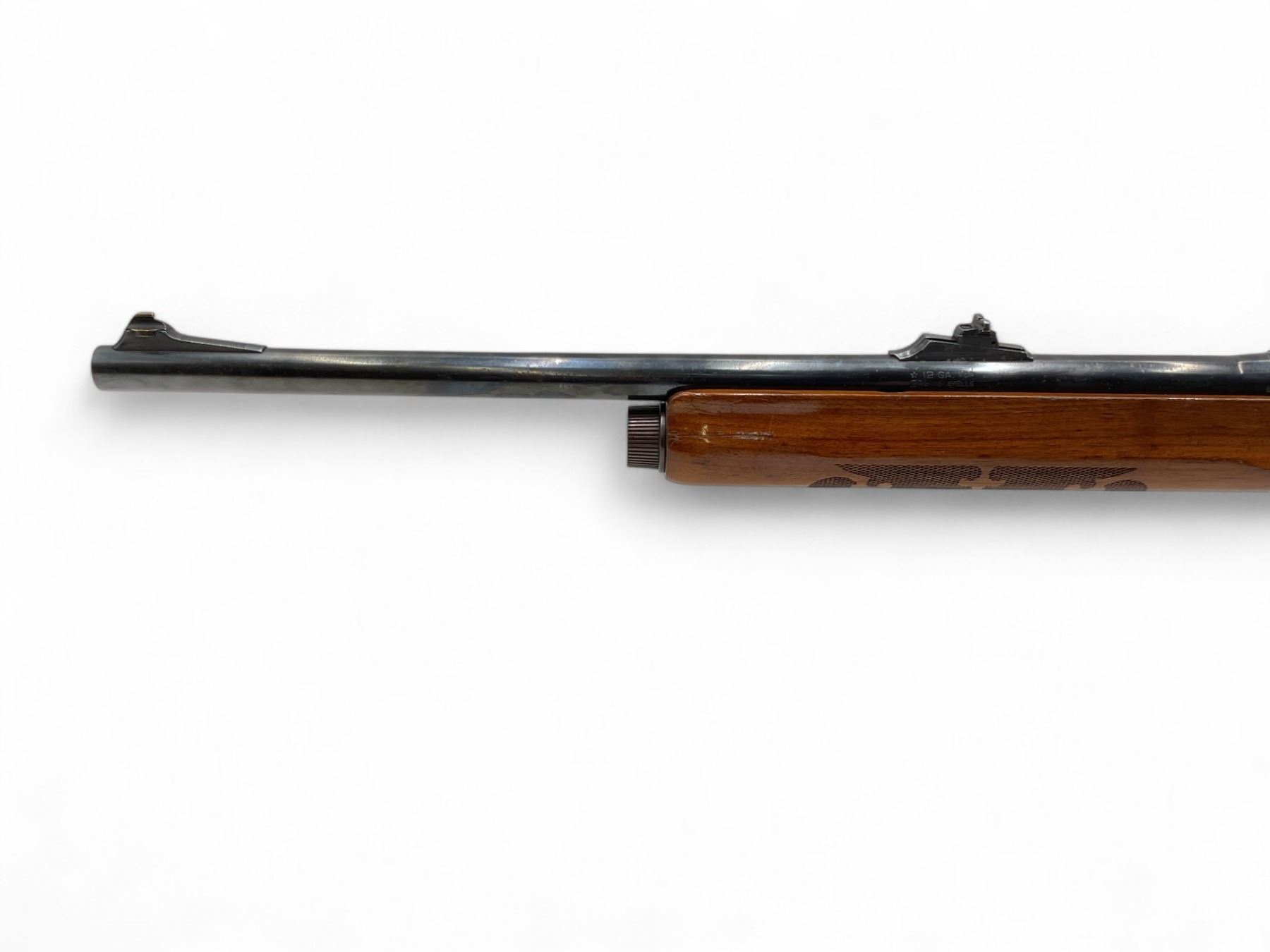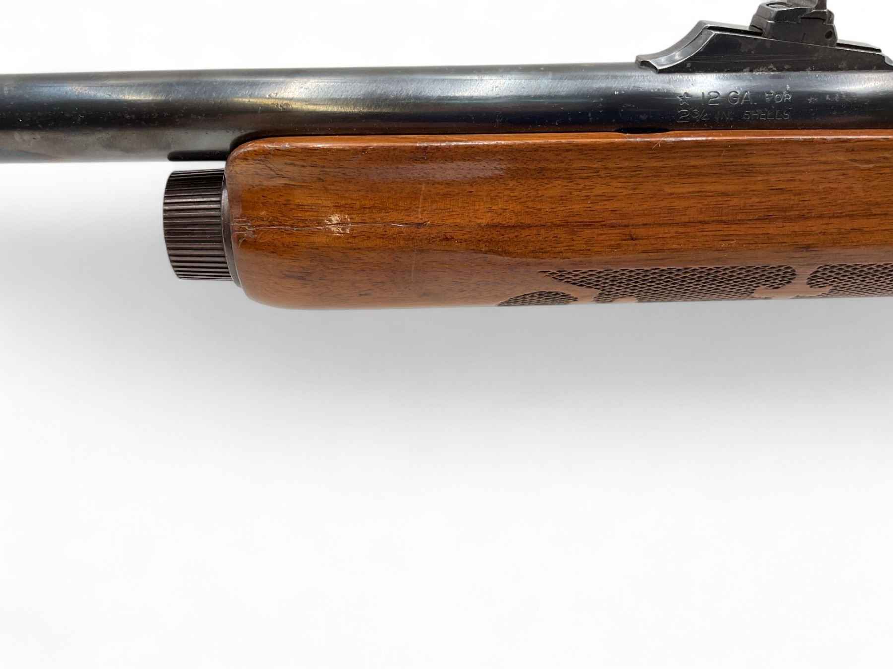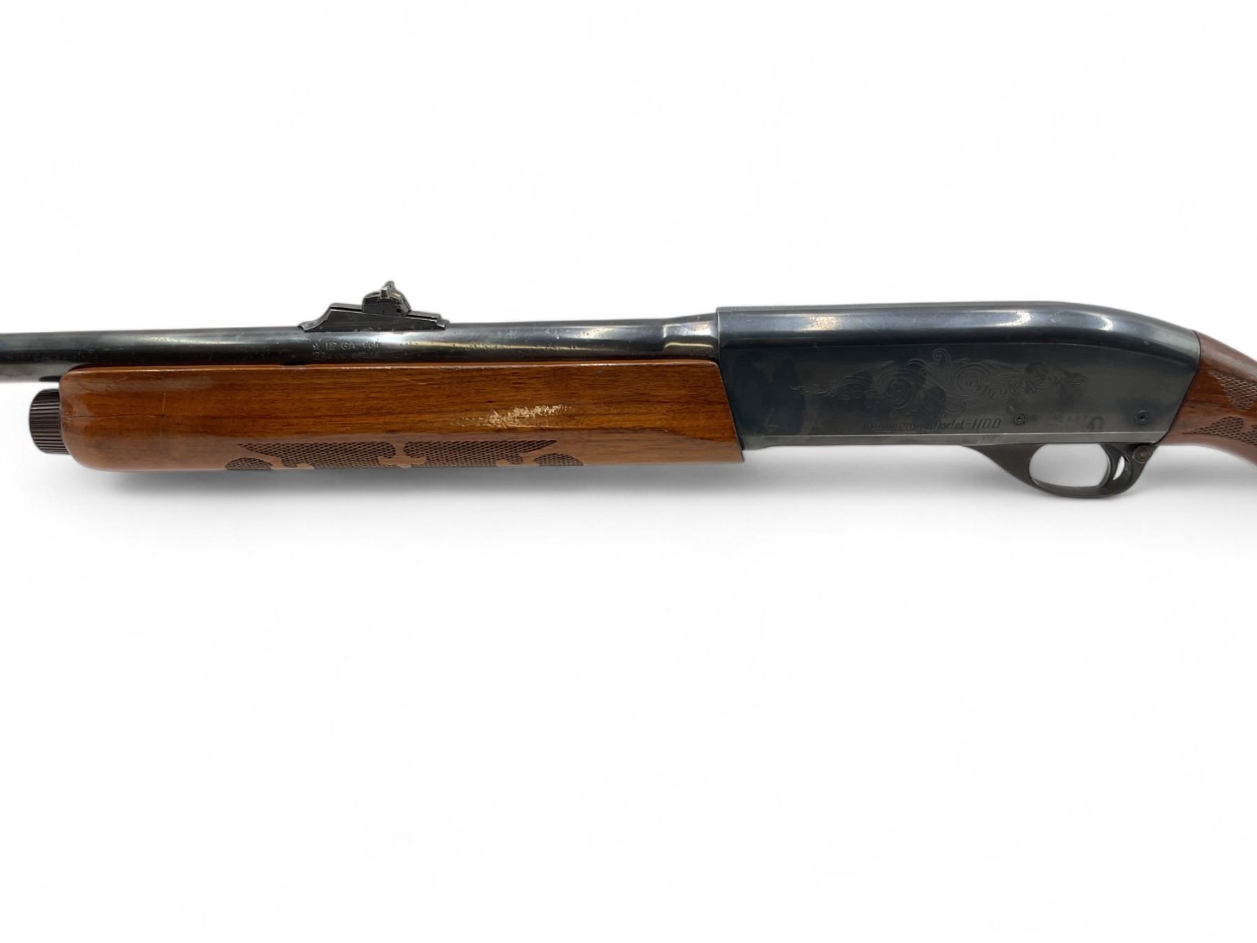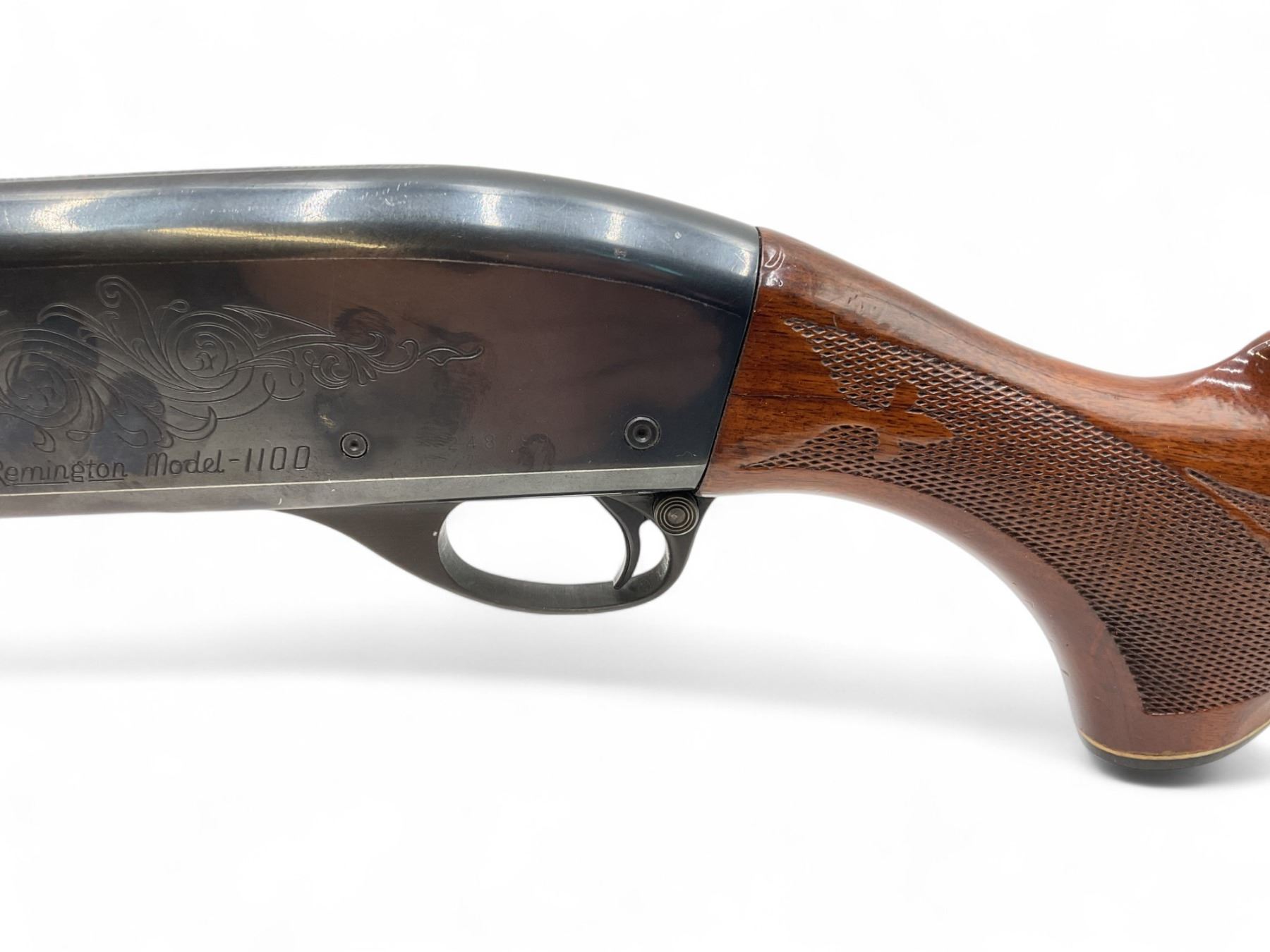 Remington Model 1100 Semi Auto Shotgun 12Ga 2.75" Chamber 22" Barrel Wood Stock. Fixed choke; smooth bore. Ramp front sight with adjustable rear sight. Rear stock has small crack on each side at receiver. This is a non-restricted firearm.