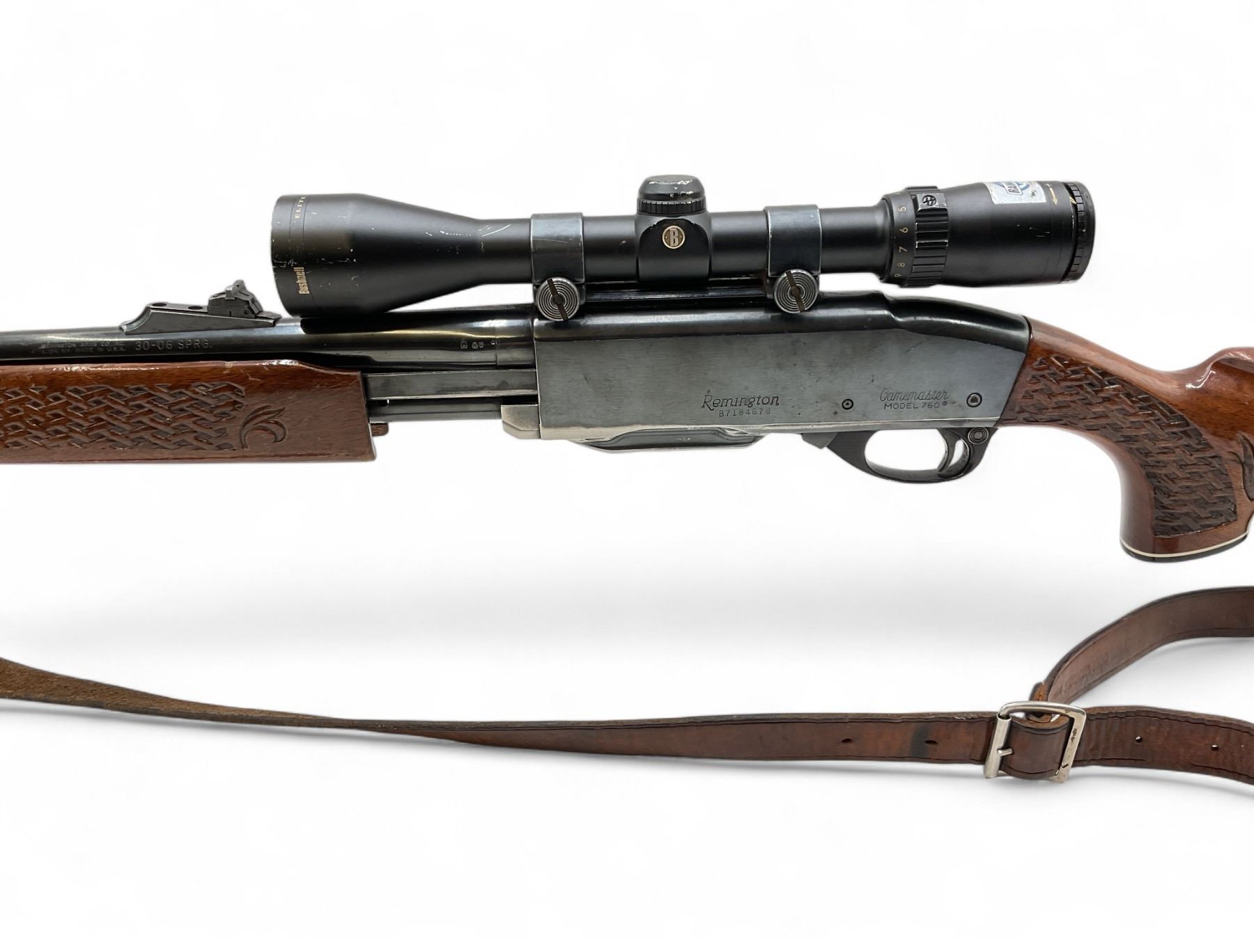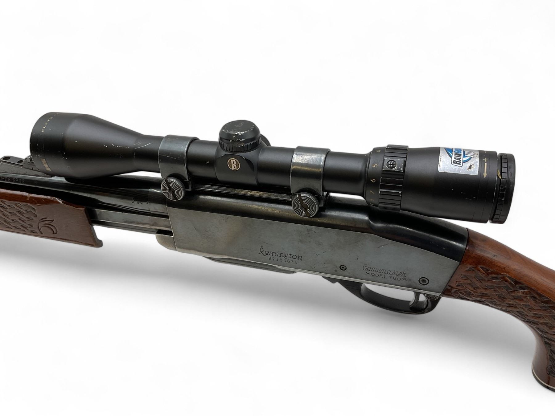 Remington Model 760 Gamemaster Pump Action Rifle 30-06 SPRG 22" Barrel Wood Stock With 3-9X40 Scope. Comes with one detachable magazine. Ramp front sight, adjustable rear sight. Receiver drilled and tapped with Bushnell Elite 3200 3-9X40 Scope. Also includes sling. Serial number B7184678. This is a non-restricted firearm.