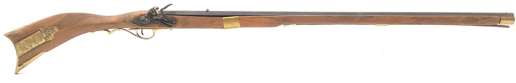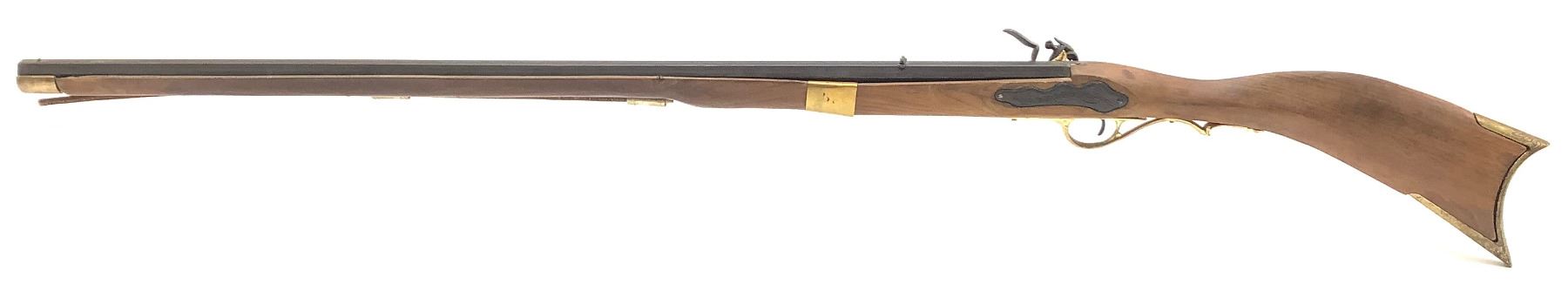 A used replica of an antique Kentucky flintlock long rifle. Most fittings and parts are plastic. It cocks and clicks. 55" long.