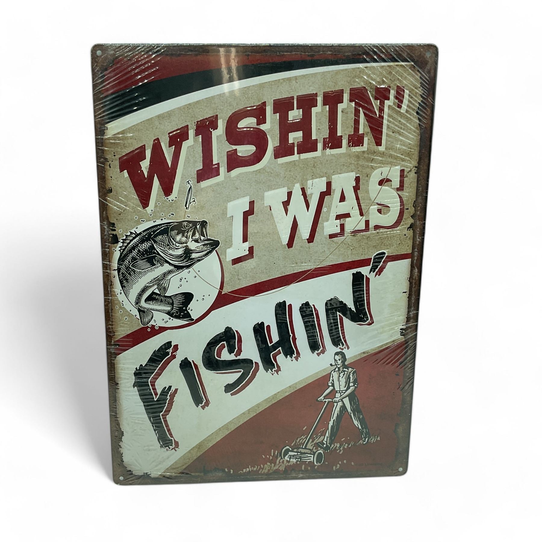 River's Edge 'Wishin' I Was Fishin'' 17" X 12" Metal Sign, New
