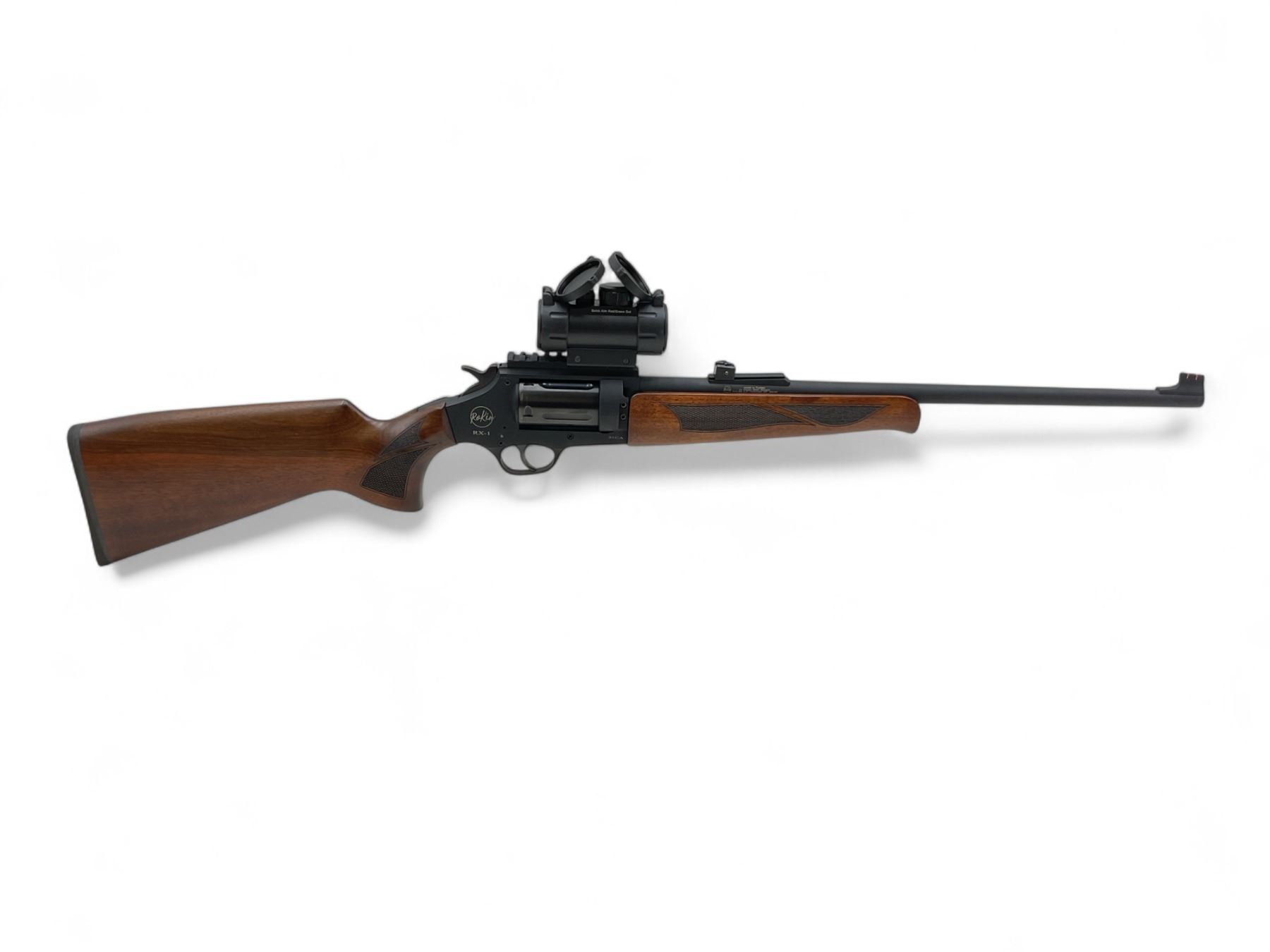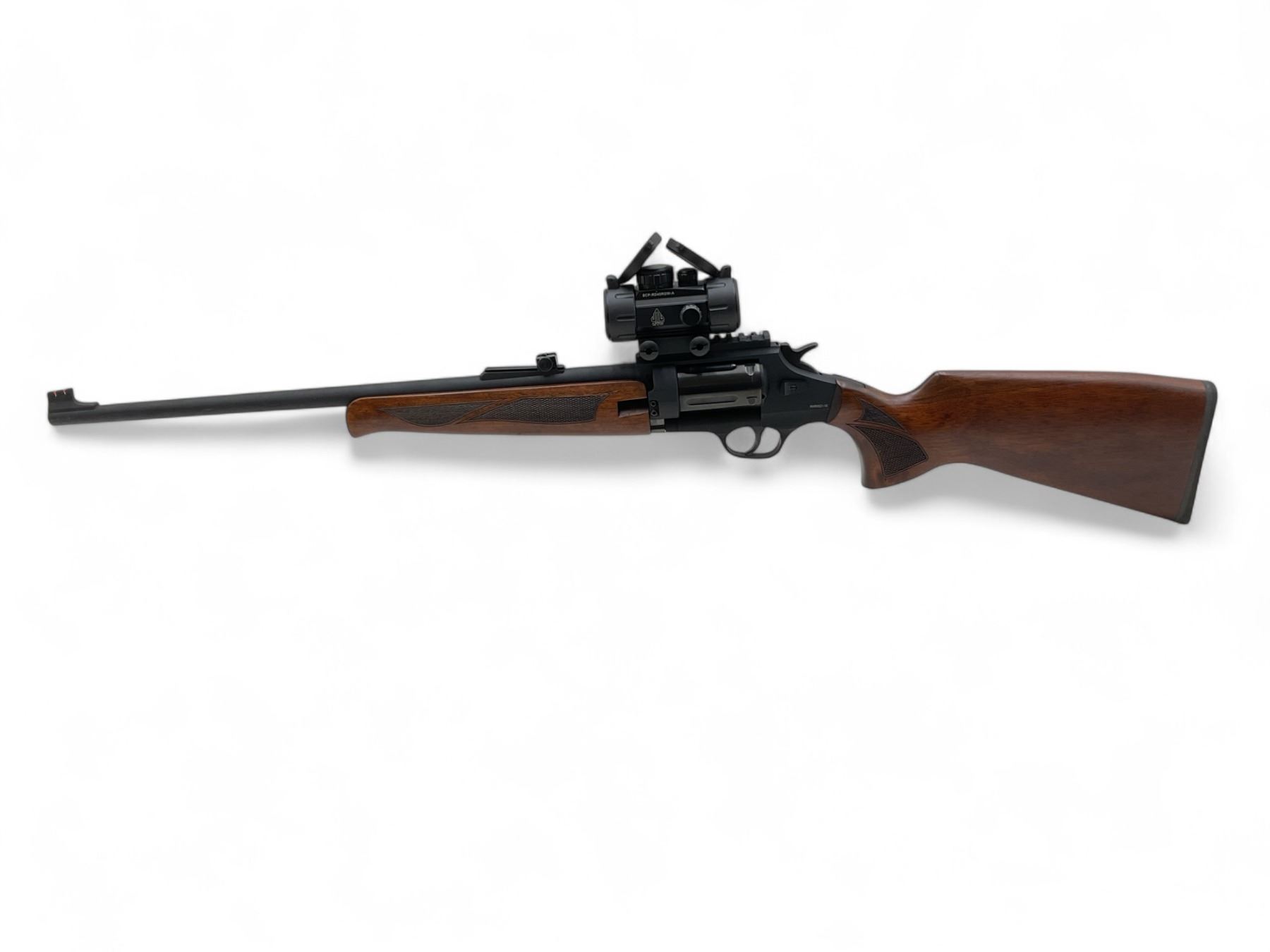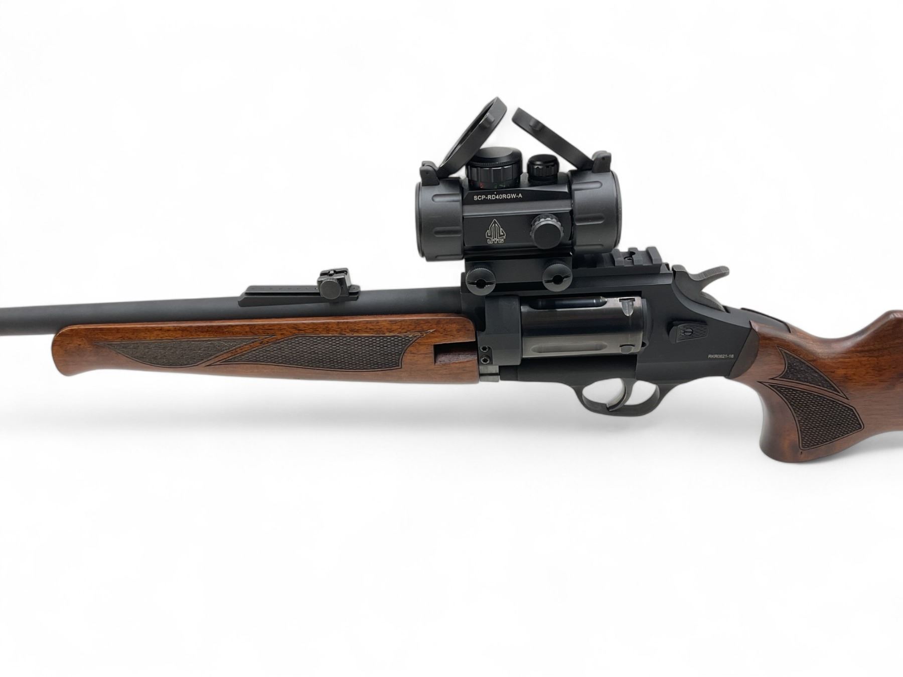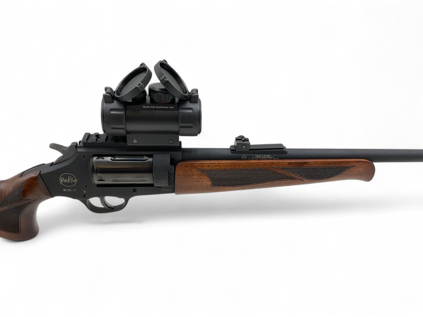 Rokin RX-1 Revolver .410 Shotgun 2.5" Chamber 20" Barrel Wood Stock With UTG Red/Green Dot Optic. 5 round capacity; fixed choke. Fiber optic front sight, adjustable rear sight. Receiver drilled and tapped with one piece rail. Also includes plastic hard case. This is a non-restricted firearm.