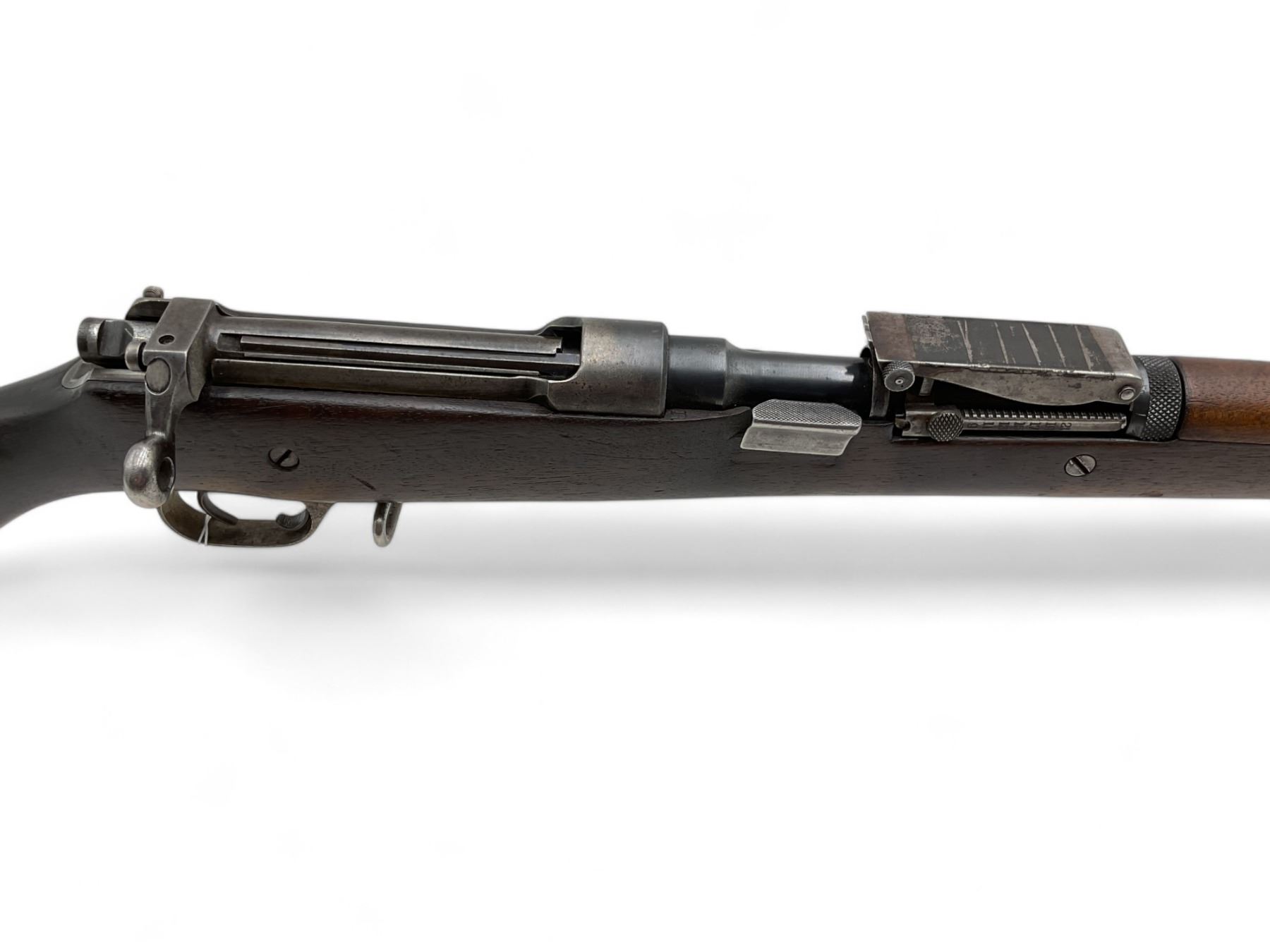 A 1908-manufactured Ross Mark II (1905) straight-pull bolt-action service rifle. 28" barrel with strong rifling and some frosting chambered in .303 British. Wood stock. Internal magazine, factory open sights. This rifle was issued to the 3rd "New Brunswick" Heavy Brigade Canadian Garrison Artillery, now the 3rd Field Artillery Regiment, RCA in St. John, New Brunswick.