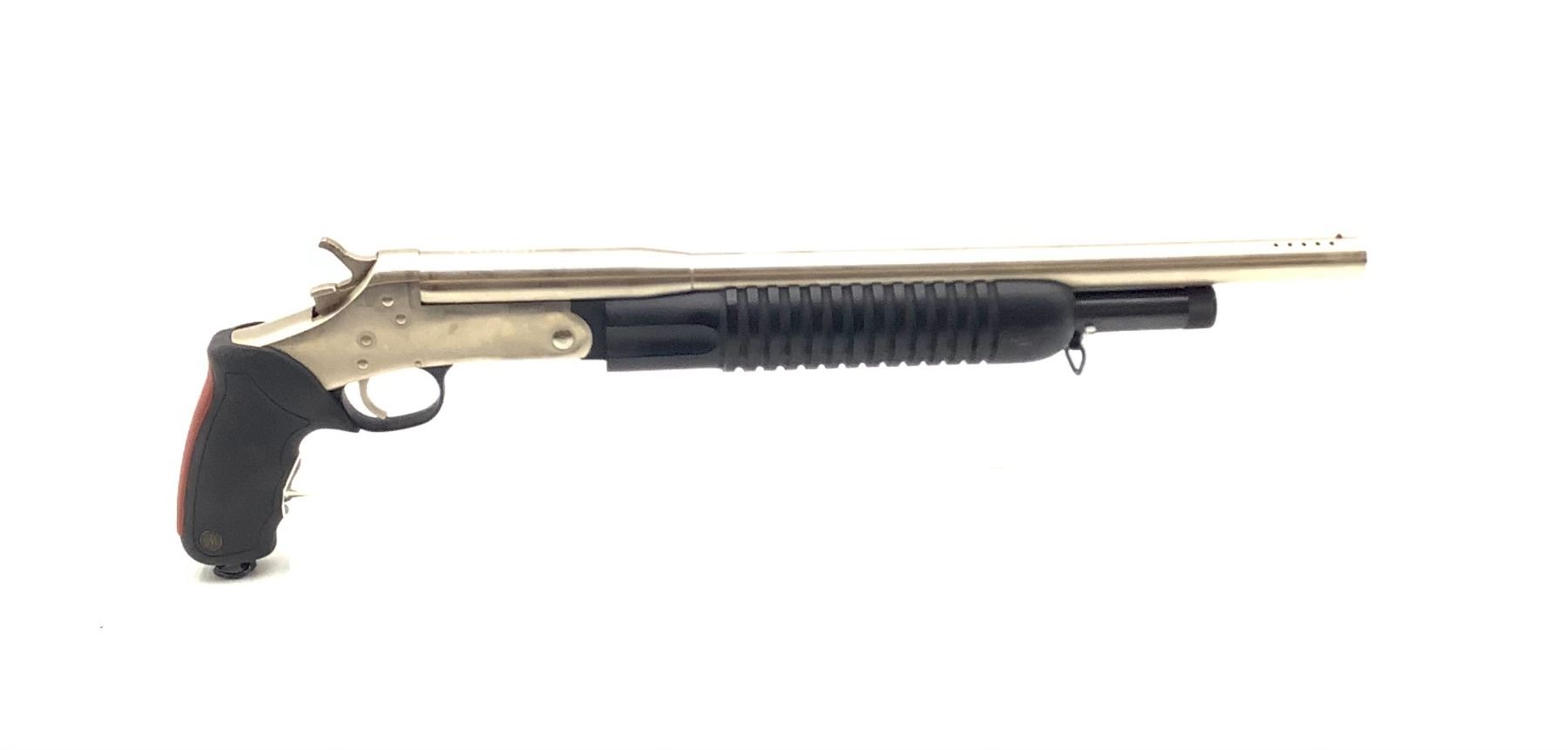 Rossi Single Shot 12 Ga Shotgun Chrome 18" Ported Barrel Rubber Pistol Grip, Restricted. Bead sight. 3" Chamber, cylinder bore. This is a registered as a restricted handgun.