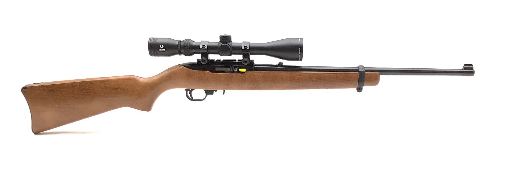 Ruger 10/22 Carbine Semi Auto Rifle 22 LR 18.5" Barrel With Scope, New. Detachable magazine, hardwood stock. Includes Viridian EON 3-9x40 scope and plastic case. This is a non-restricted firearm.