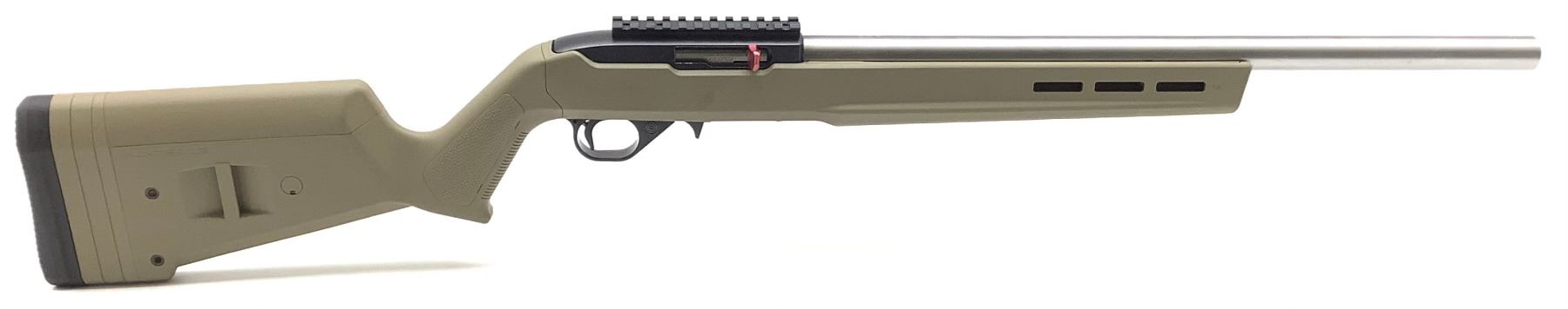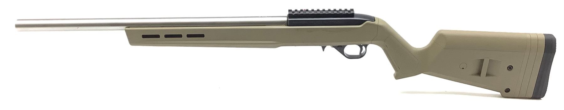 A Ruger 10/22 semi-automatic rifle chambered in .22 Long Rifle. Fully-loaded, heavy-weight stainless iBi barrel, custom cocking handle, after-market trigger and Magpul synthetic stock, scope rail.