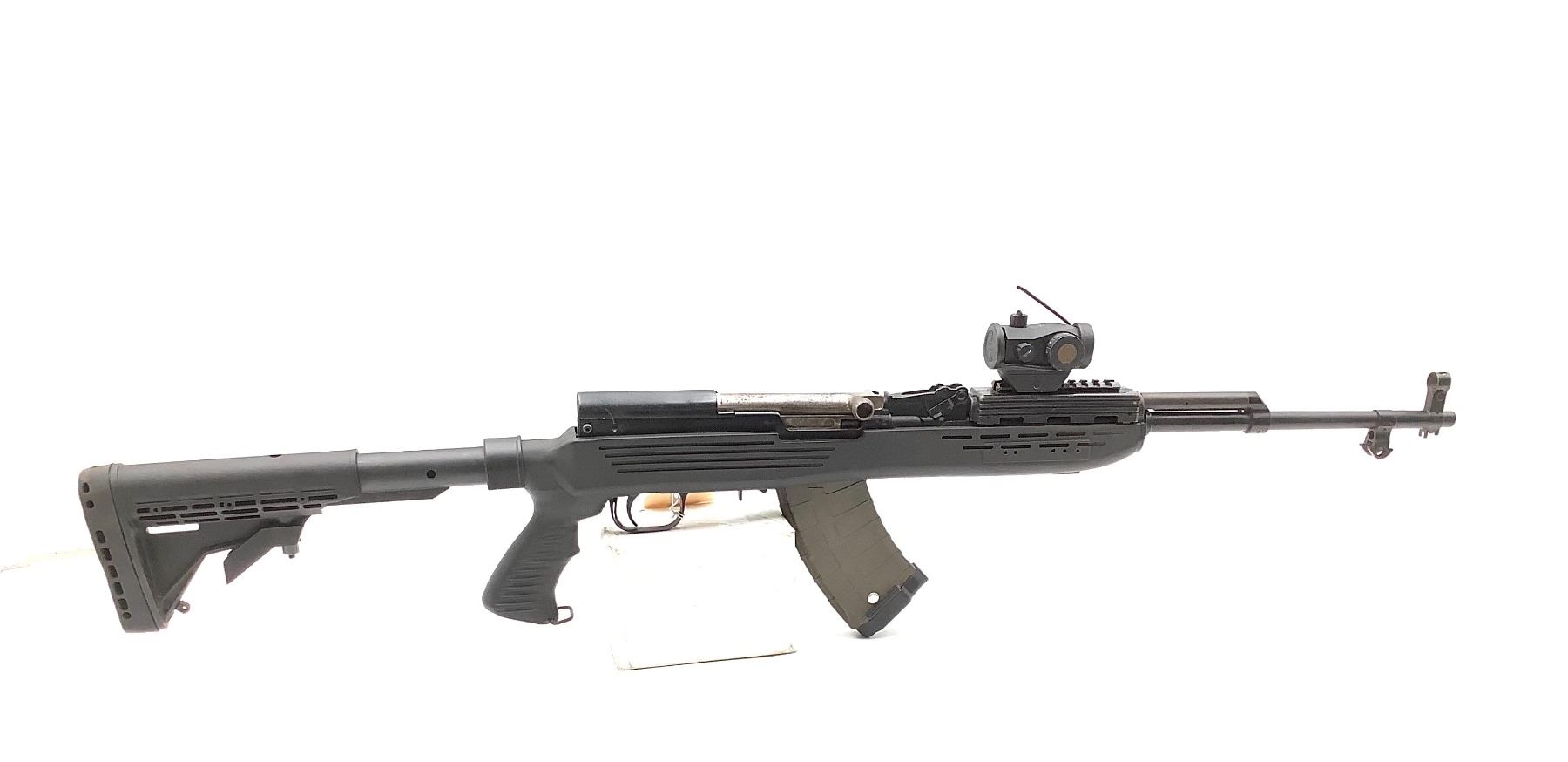 Russian SKS Semi Auto Rifle 7.62X39 20" Barrel Black Synthetic Adjustable Stock With Truglo Red Dot. Includes OD detachable magazine; rail mount on gas tube. Front sight present, rear sight removed. Recoil reducing Kick Lite Stock. This is a non-restricted firearm.