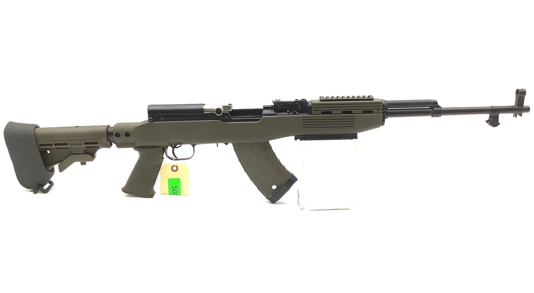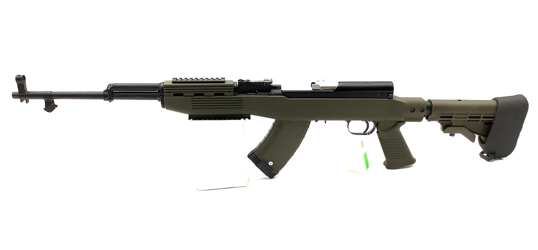 Russian SKS Semi Auto Rifle 7.62X39 Green Tapco Stock Detachable Magazine. Rails on forend. No bayonet, includes rubber butt pad. Fixed sights. This is a non-restricted firearm.