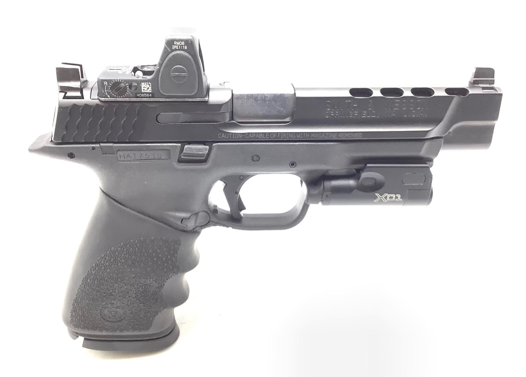 A used S& W M& P 9L semi-automatic pistol chambered in 9mm. This pistol is fully-loaded with a Trijicon RM06 red dot sight and a Surefire XC1 light. Comes with one magazine.