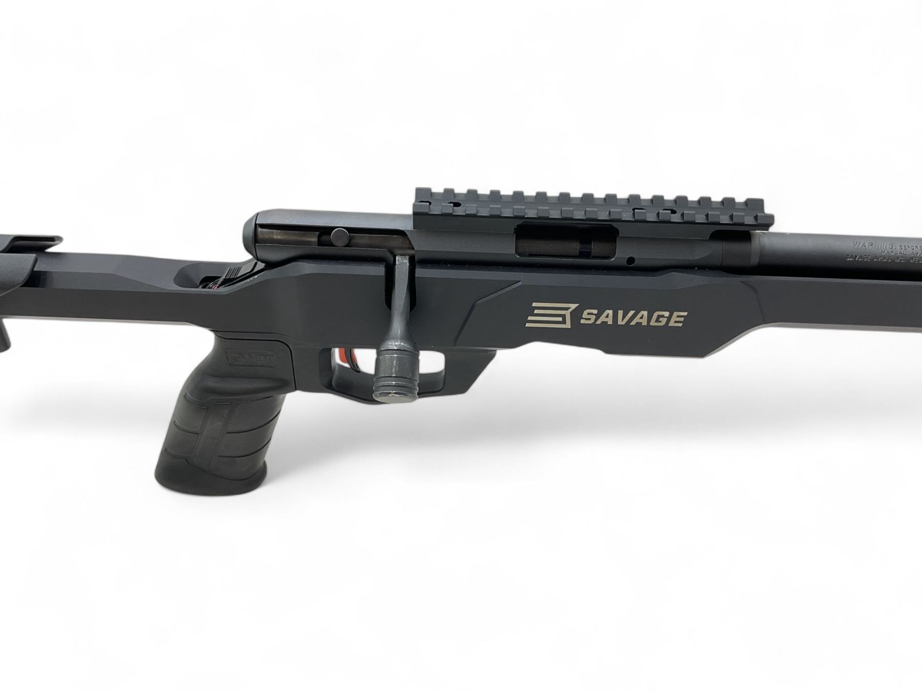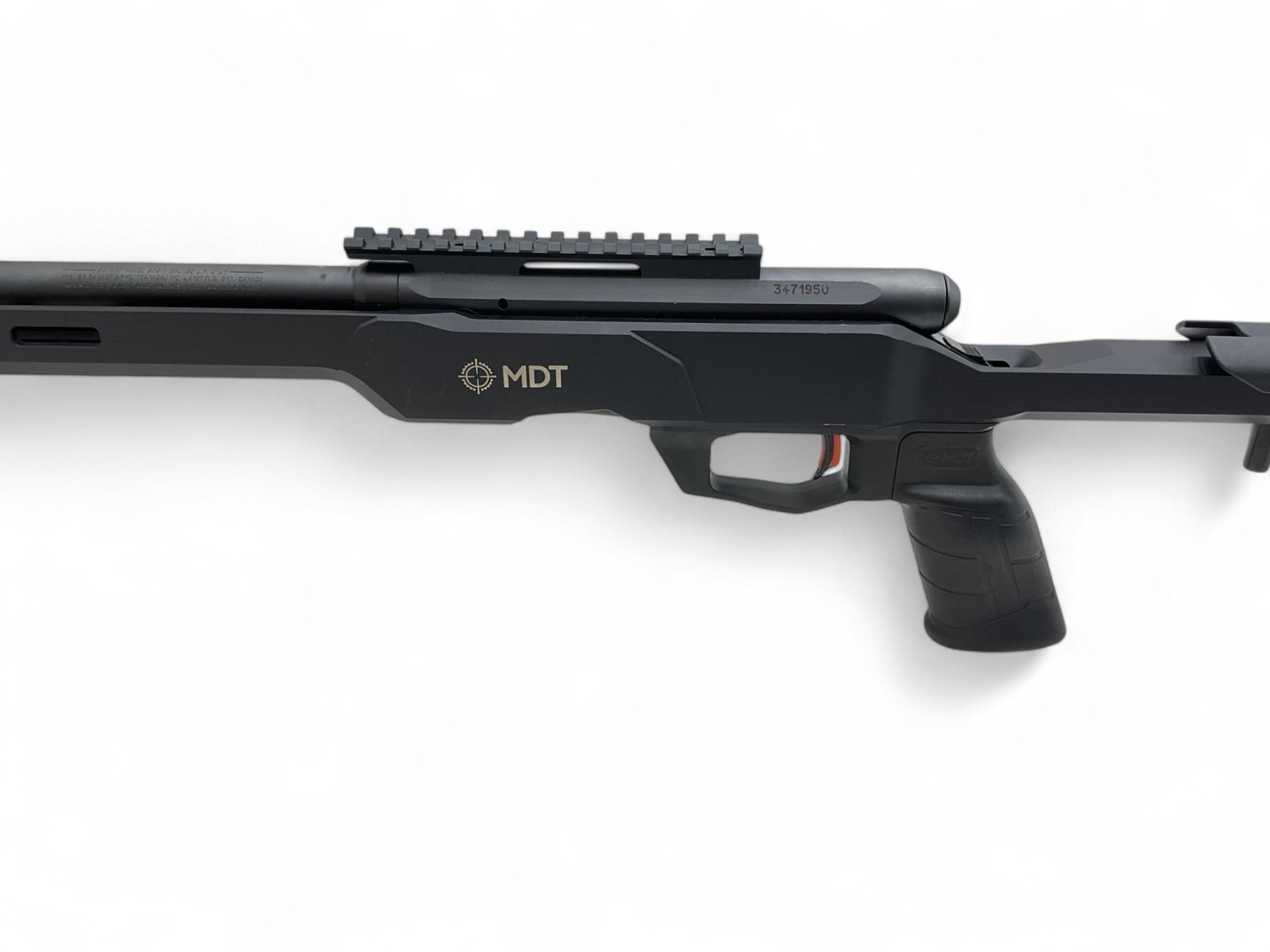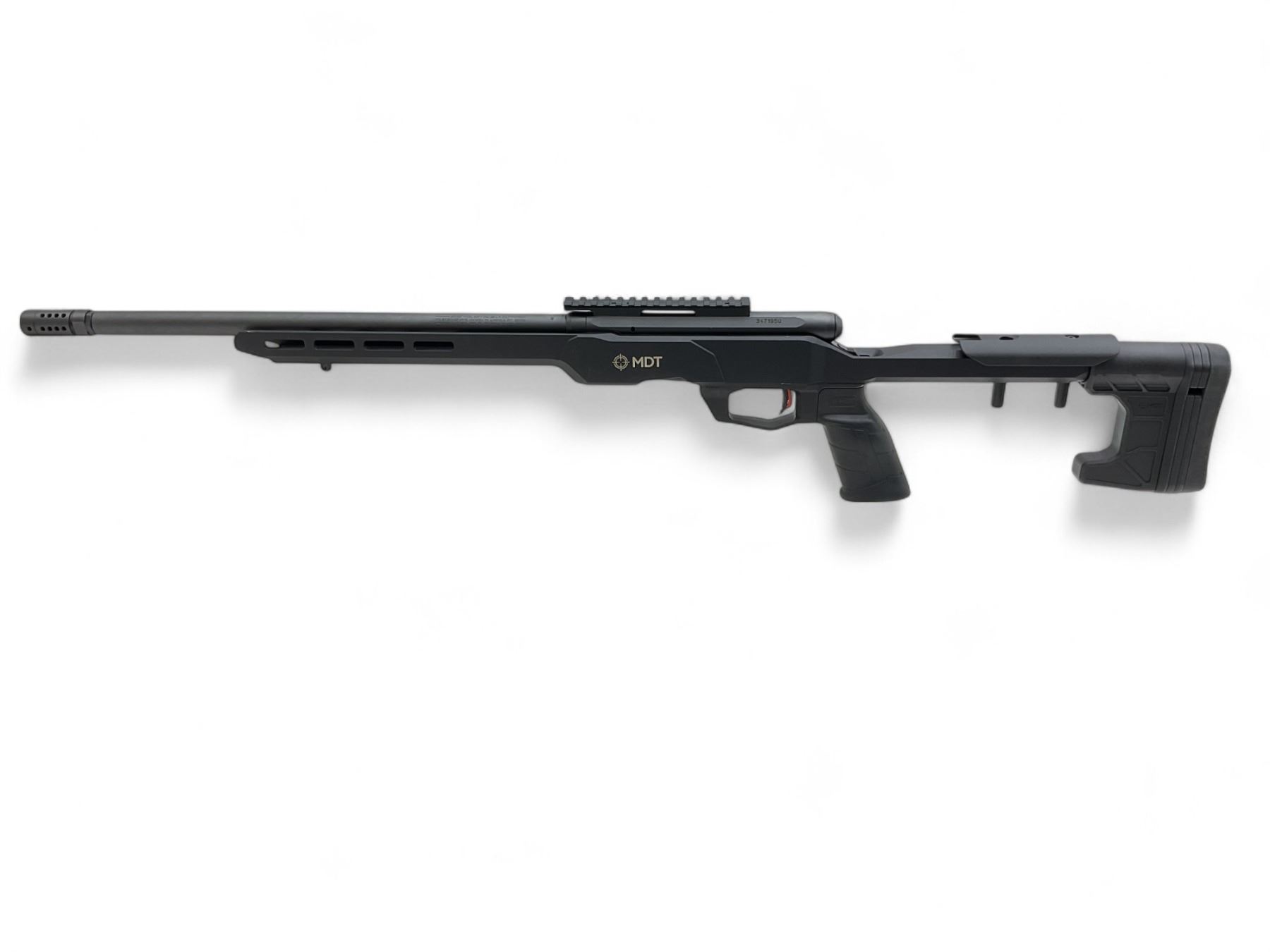 Savage B22 V Bolt Action Rifle .22LR 18" Threaded Barrel MDT Chassis. Comes with one detachable magazine. Over size bolt knob; brake installed on barrel. Receiver drilled and tapped with one piece rail. Adjustable trigger and adjustable cheek rest. This is a non-restricted firearm.