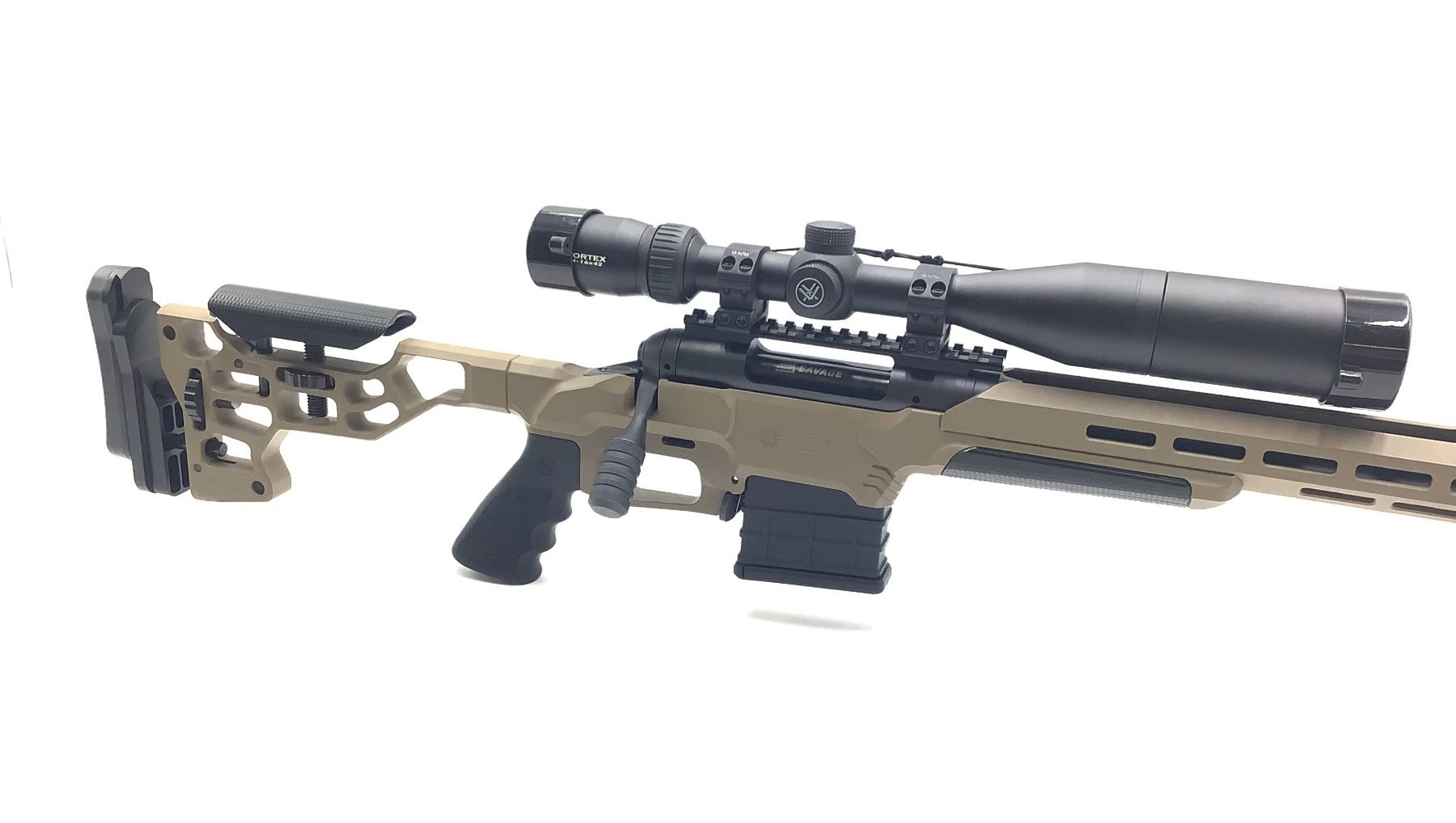 Savage Model 10 308 Win 24" Barrel Bolt Action MDT Chassis. Adjustable stock, bipod, Vortex diamondback HP 4-16x42 scope.