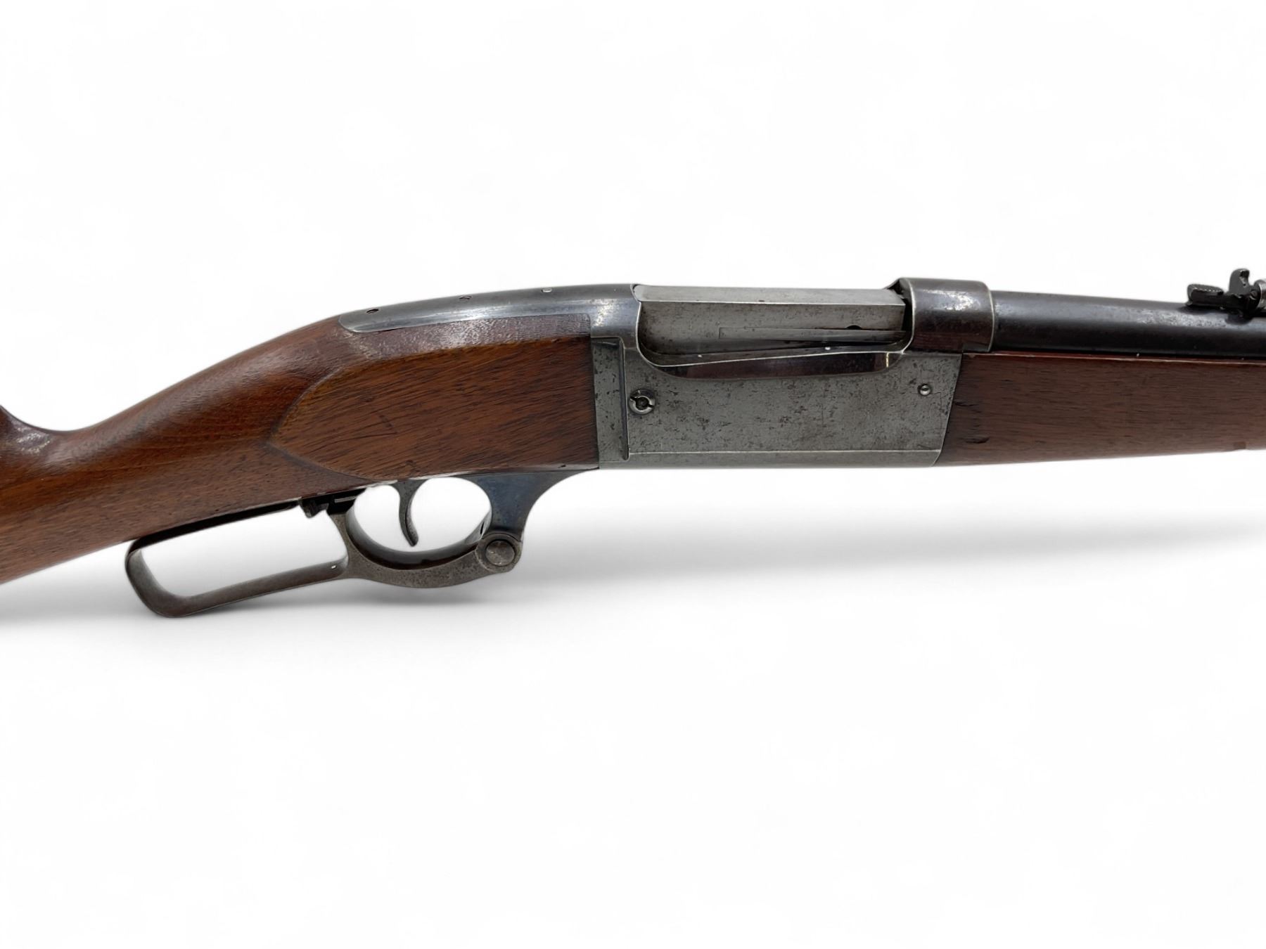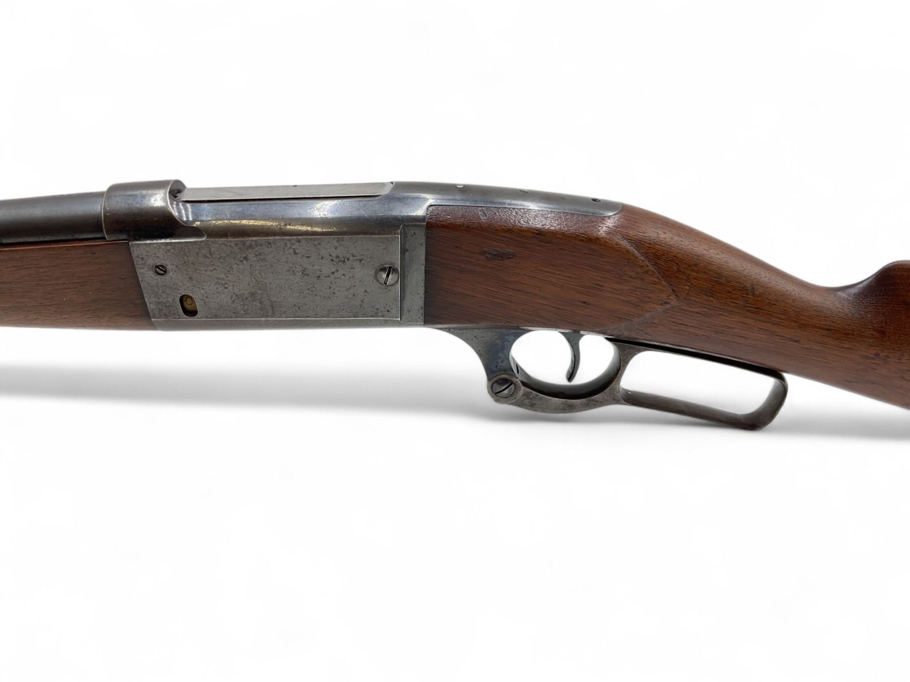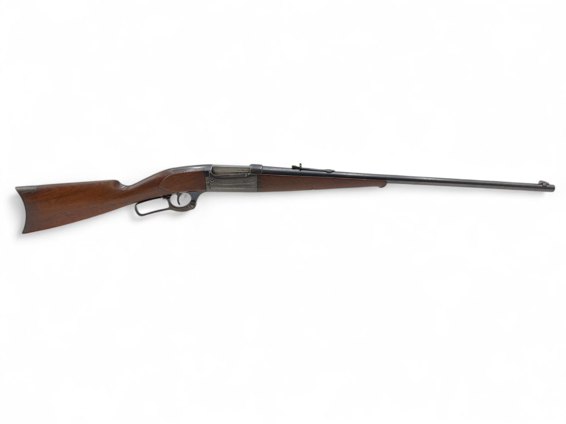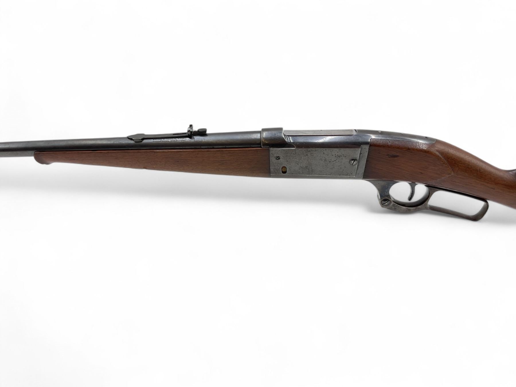 Savage Model 1899 Lever Action Rifle .303 Savage 26" Barrel Wood Stock. Front sight appears to have been replaced; adjustable rear sight. Internal magazine with counter; loaded chamber indicator. Schnabel forend has small crack. Serial number 92502. This is a non-restricted firearm.