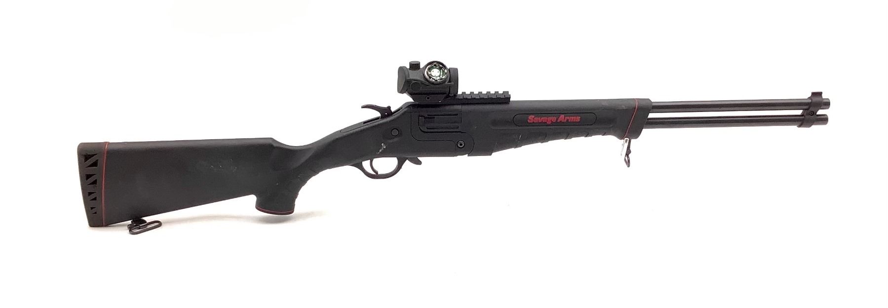 Savage Model 42 Over/Under Combination Gun 22 LR /410 3" Chamber 20" Barrel With Bushnell Red Dot. Synthetic stock with sling mounts. Rail on receiver, Bushnell Red Dot Scope missing battery cover and battery. Marks and scratches present on stock, metal finish shows some wear and scratches. This is a non-restricted firearm.