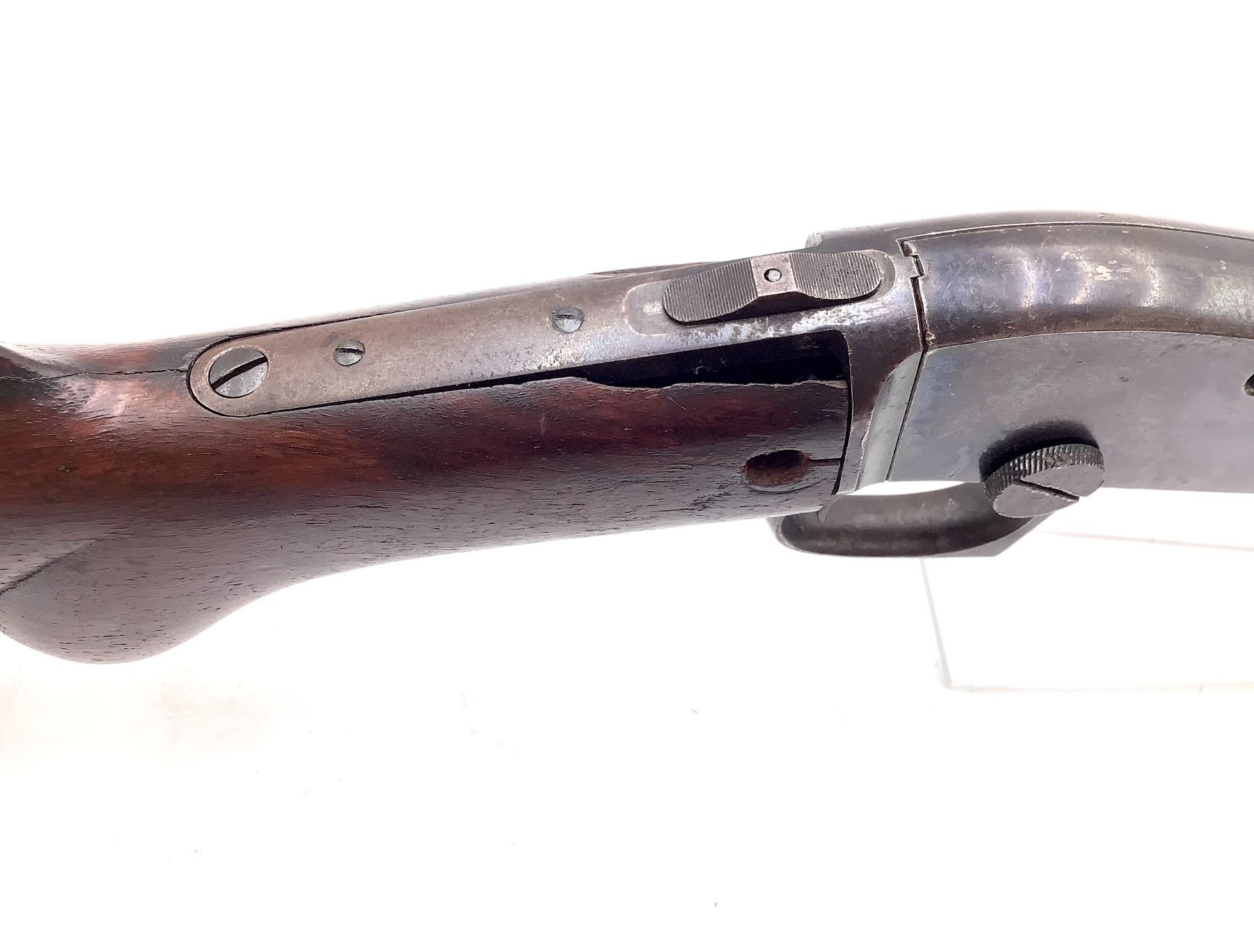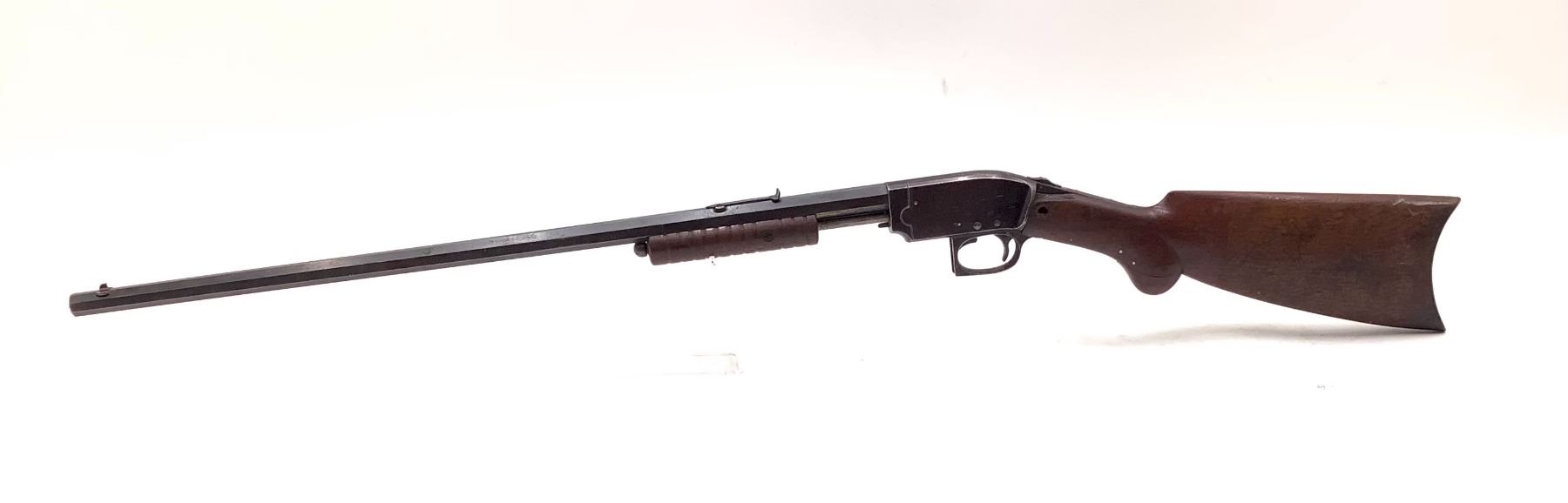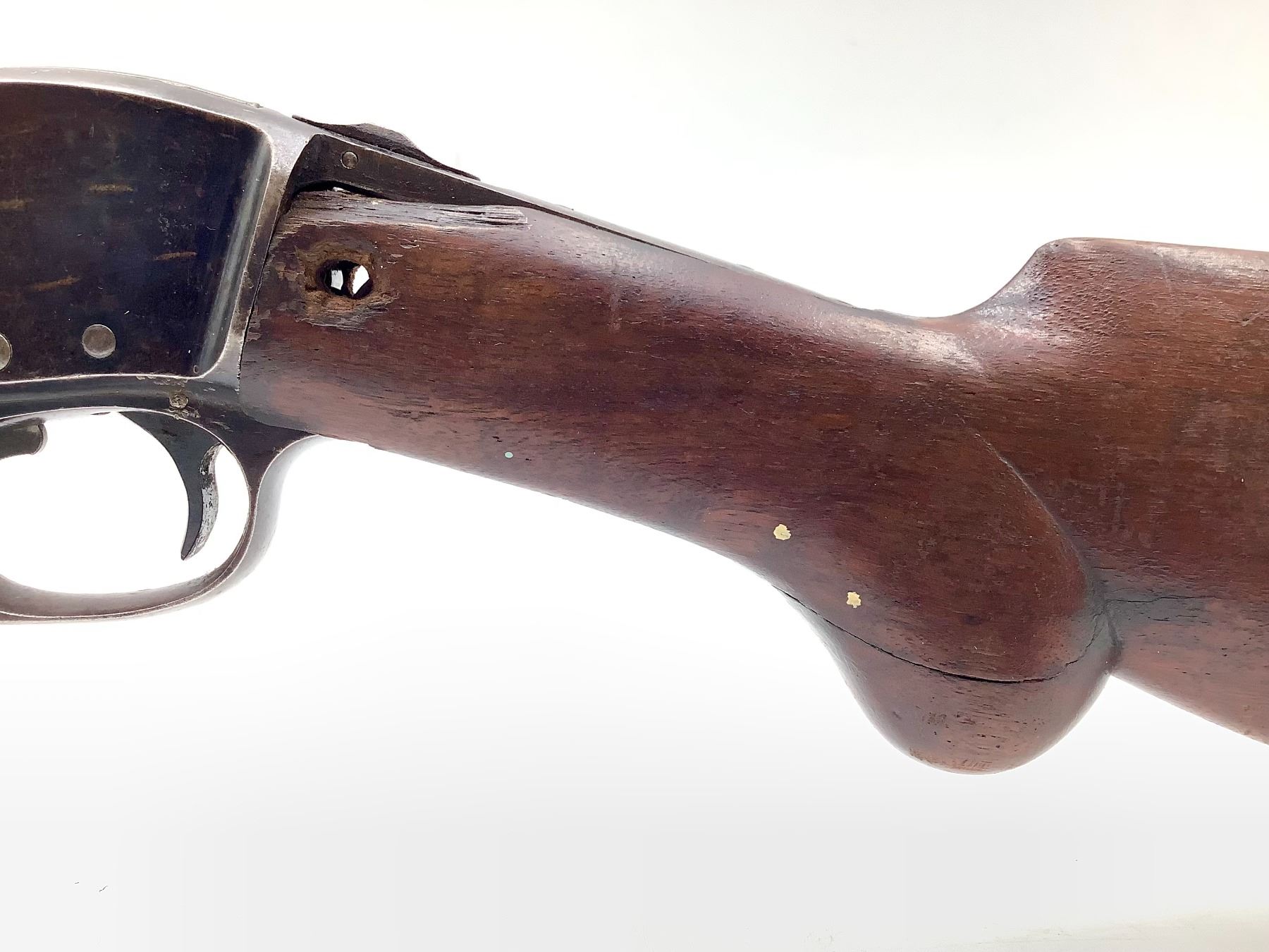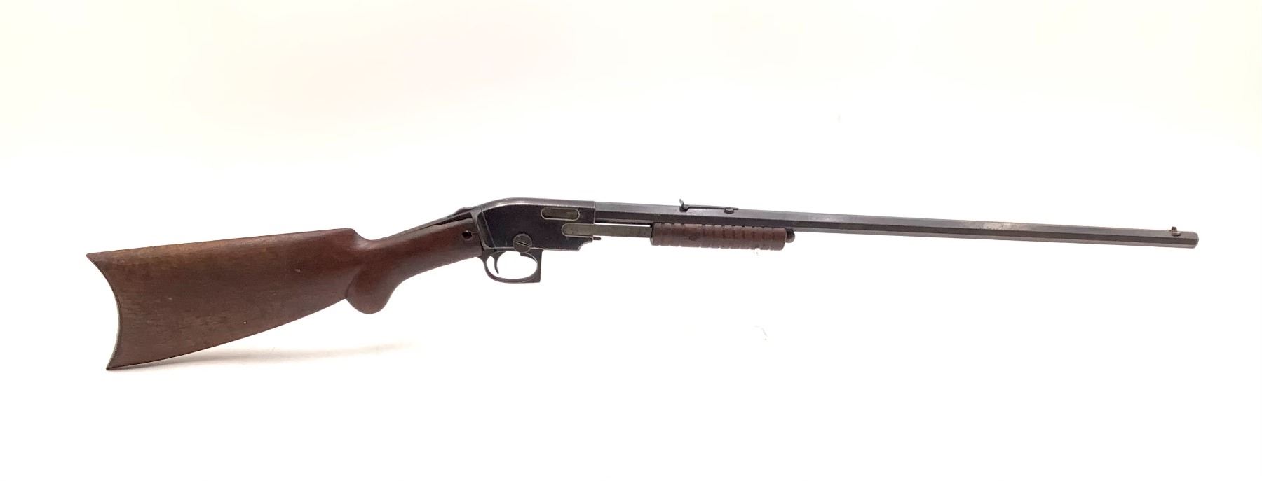 Savage Pump Action Rifle 22 S/L/LR 24" Octagon Barrel. Missing magazine, front and rear sight present. Rear wood stock broke and cracked, front stock scratched and nicked. Metal finish worn, scratched and has marks. This is a non-restricted firearms.