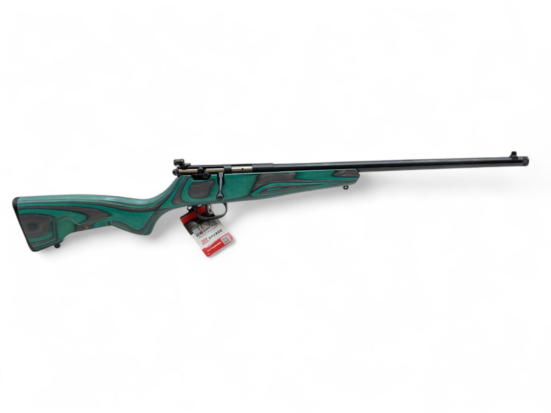 Savage Rascal Minimalist Single Shot Bolt Action Rifle 22LR 16.13" Threaded Barrel Teal And Grey Laminate, New. Accutrigger adjustable trigger. Fixed front sight, peep rear sight. This is a non-restricted firearm.