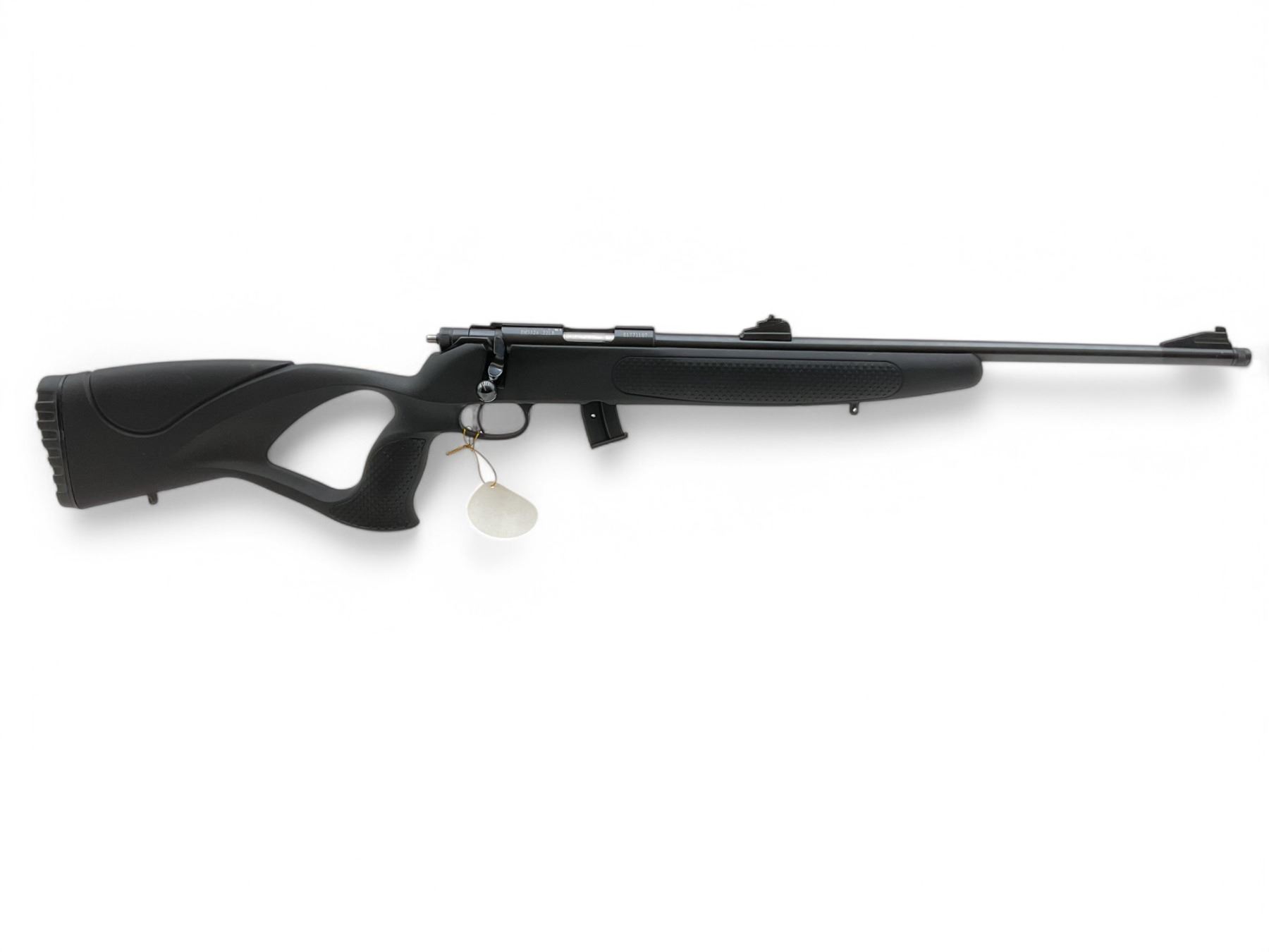 Scorpio EM332A Bolt Action Rifle 22LR 20" Threaded Barrel Black Synthetic Stock. Comes with 3 detachable magazines. Fixed front sight, adjustable rear sight. This is a non-restricted firearm.