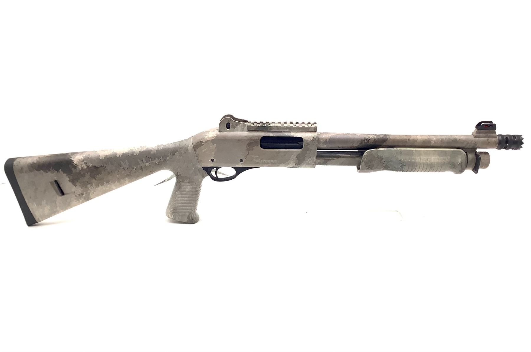 Scorpio Pump Action 12Ga Shotgun Desert Camo 12.75" Barrel Synthetic Stock, New. Removable choke, 3" chamber. This is a non-restricted firearm.
