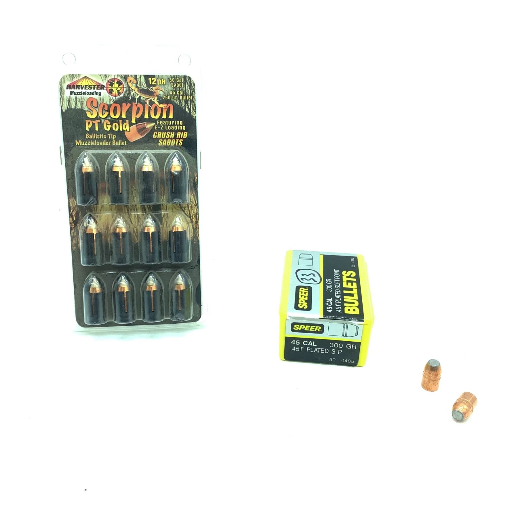 Scorpion PT Gold Muzzleloading 50 Cal Sabots and 45 Cal 260 Grain Projectiles, 12 Qty and Speer 45 Cal .451" 300 Grain Projectiles, 33 Qty