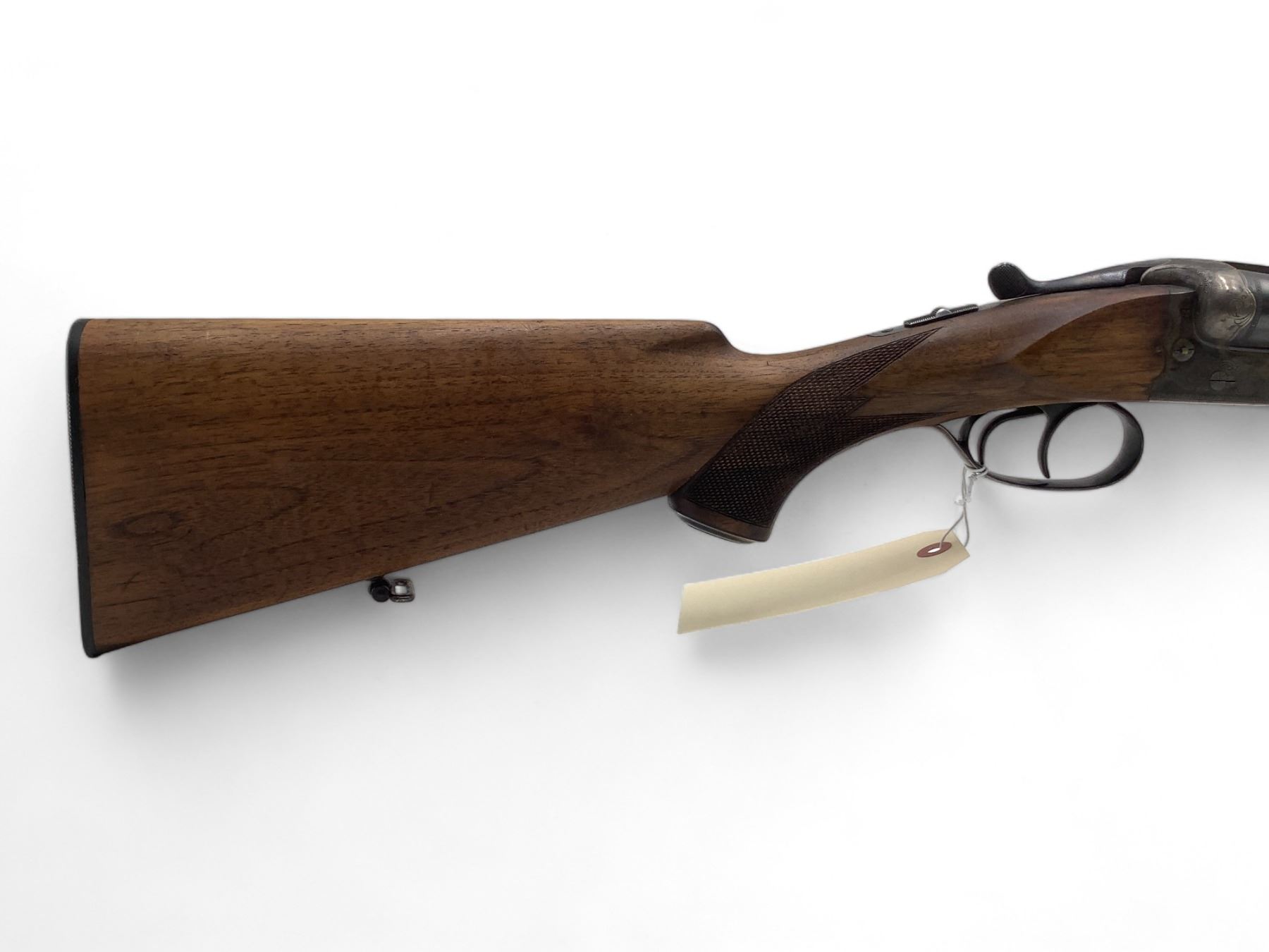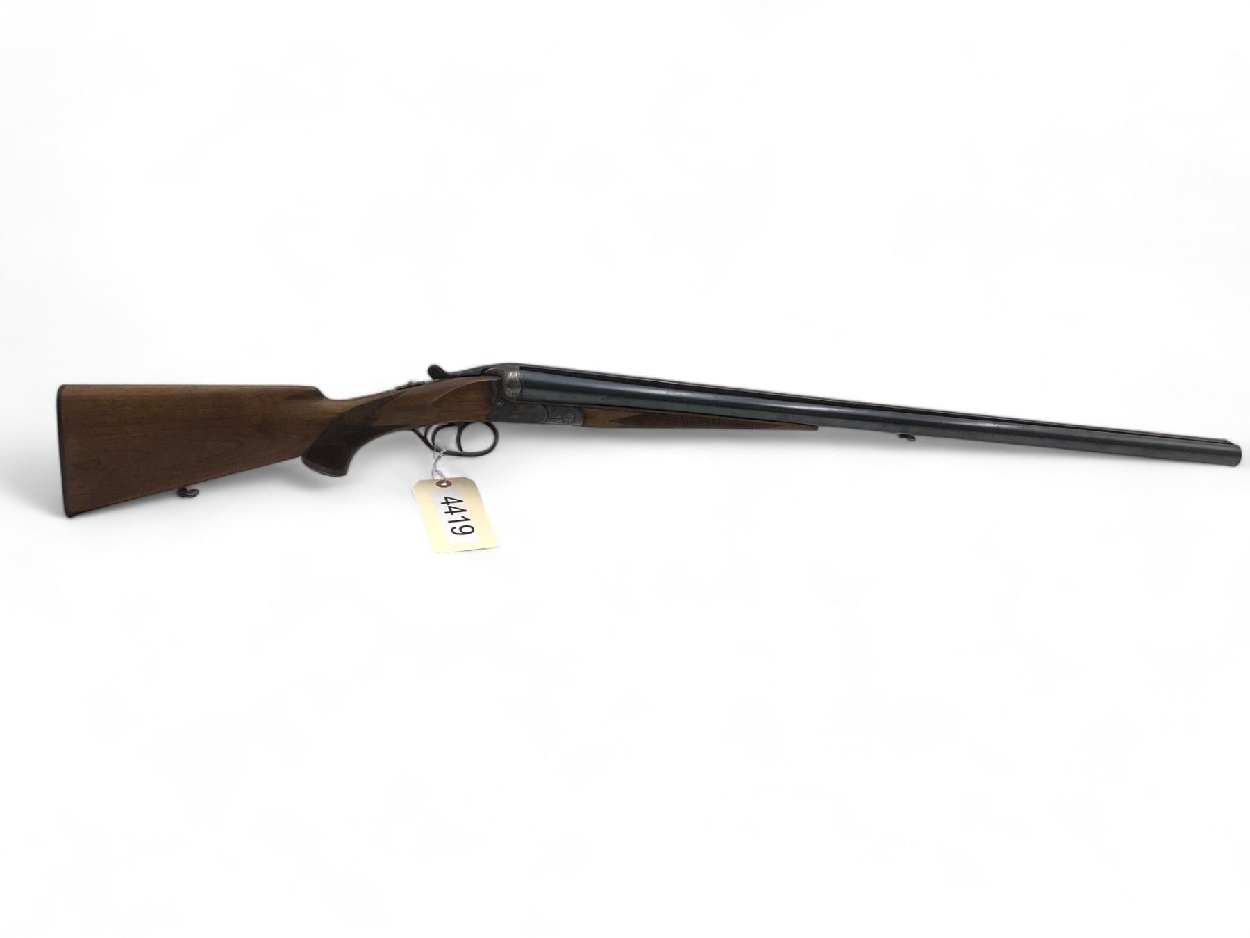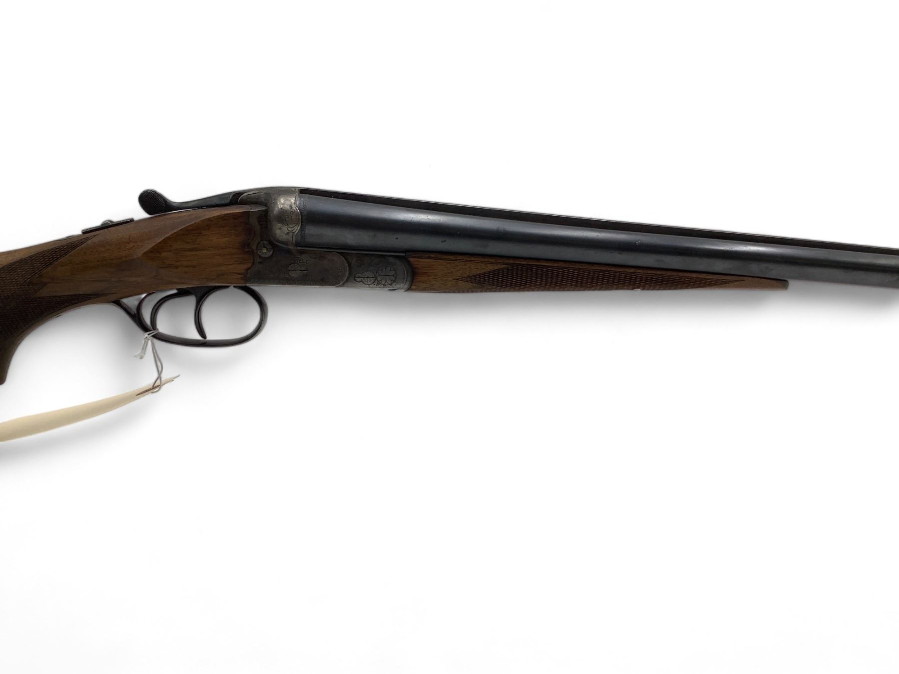 Simson Suhl Side By Side 12Ga Shotgun 27.5" Barrels Wood Stock. Bead sight, fixed choke. Double triggers, plastic butt pad. This is a non-restricted firearm.