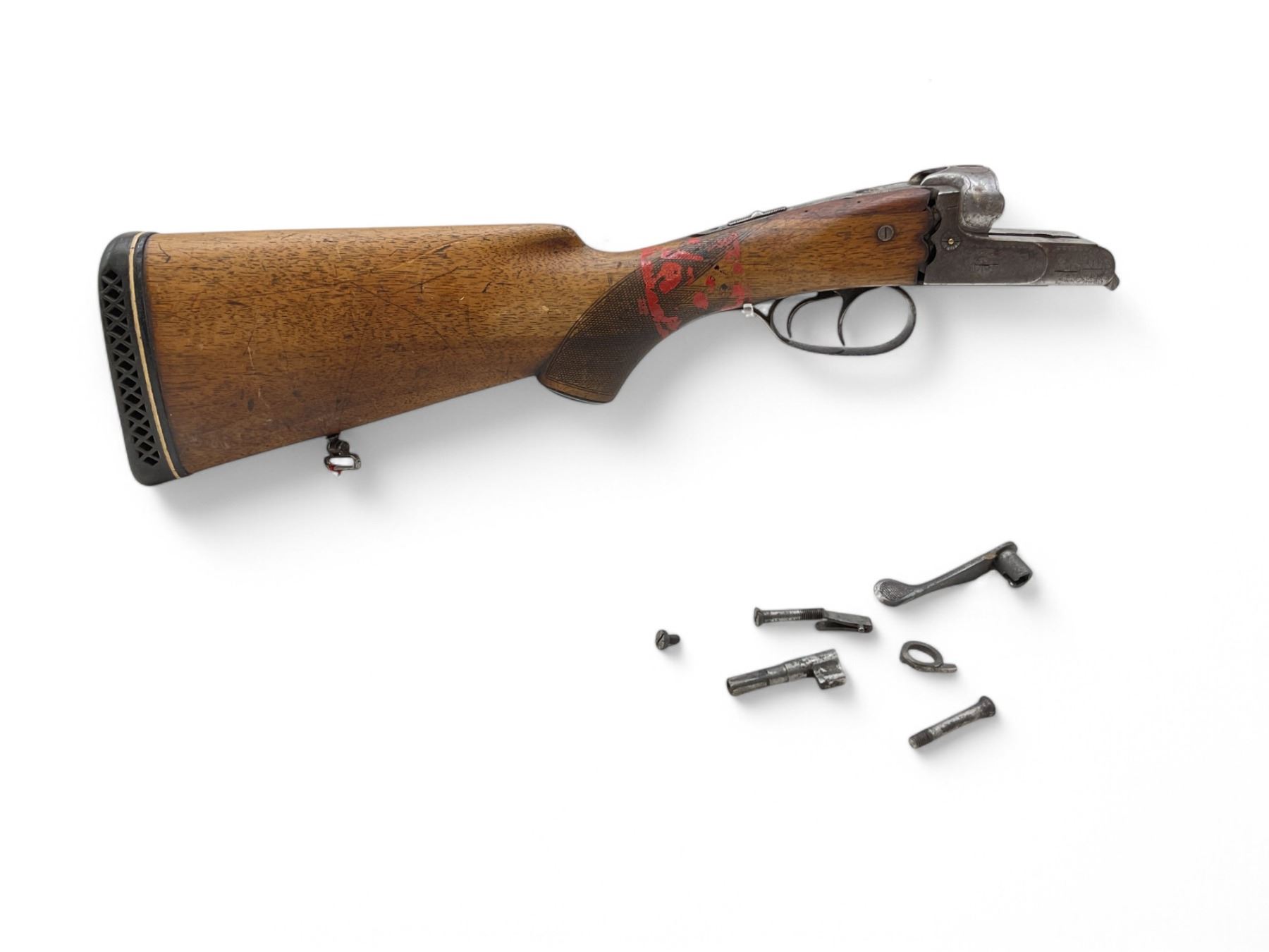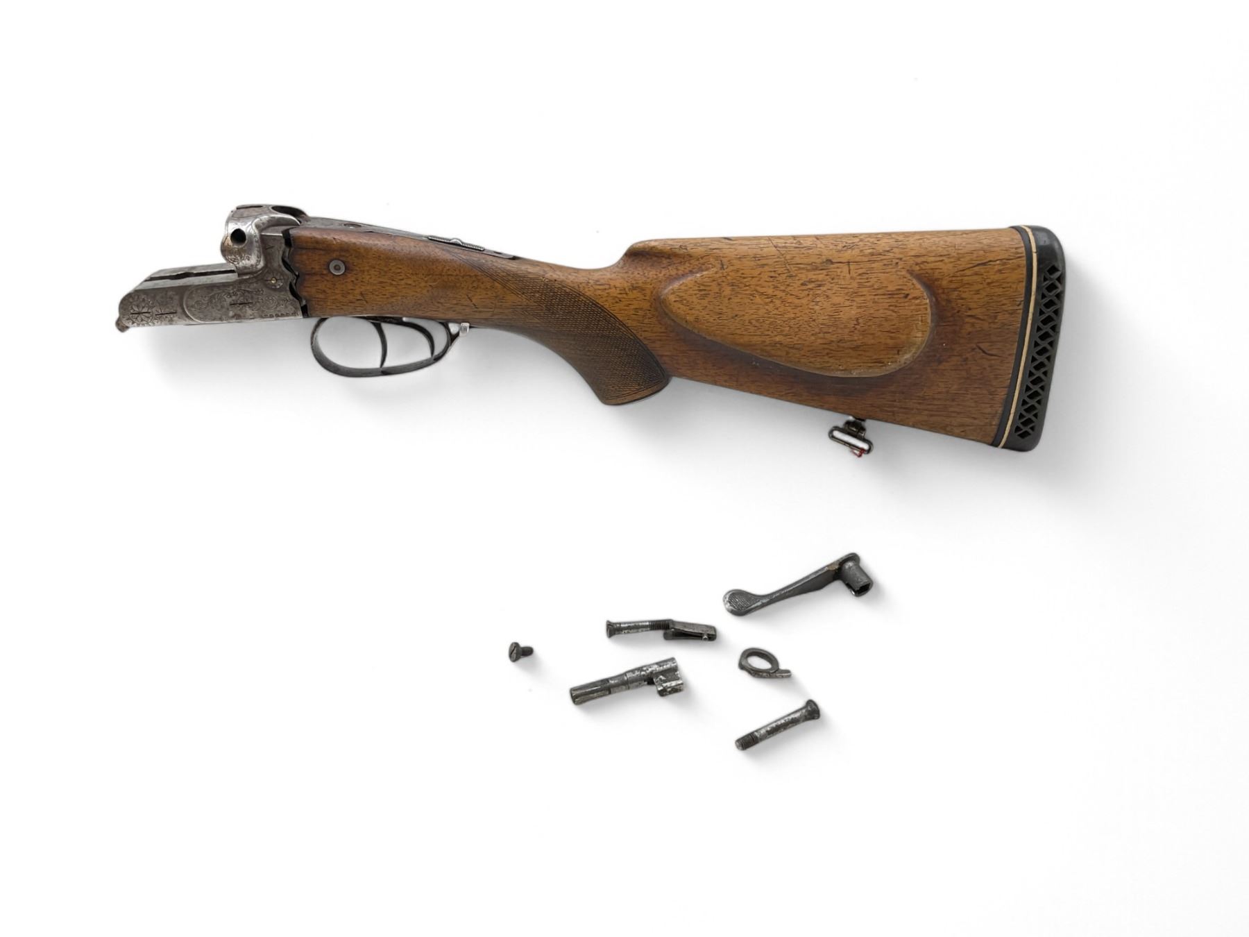 Simson Suhl Side By Side Shotgun Receiver With Stock. Dual triggers present, but many internal parts of receiver missing. Wood stock cracked near receiver on both sides. This is a non-restricted firearm.