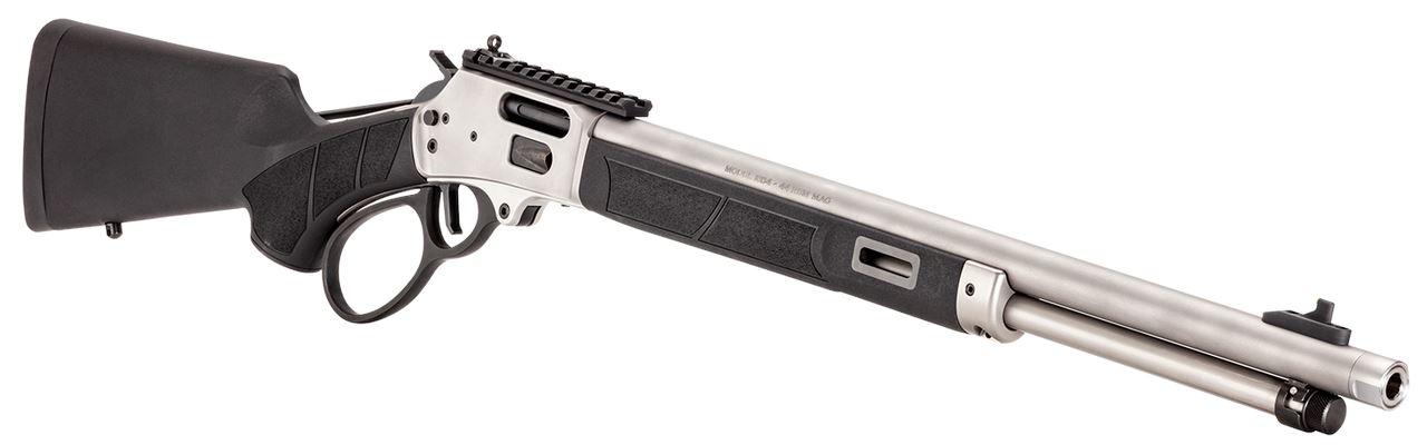 Smith & Wesson 1854 Stainless Lever Action Rifle .44 Magnum 19.25" Barrel With Black Synthetic Stock, New. Tubular magazine, threaded barrel. XS Sights ghost ring rear sight, fixed front sight. M-LOK® synthetic forend with textured grip panels. This is a non-restricted firearm.