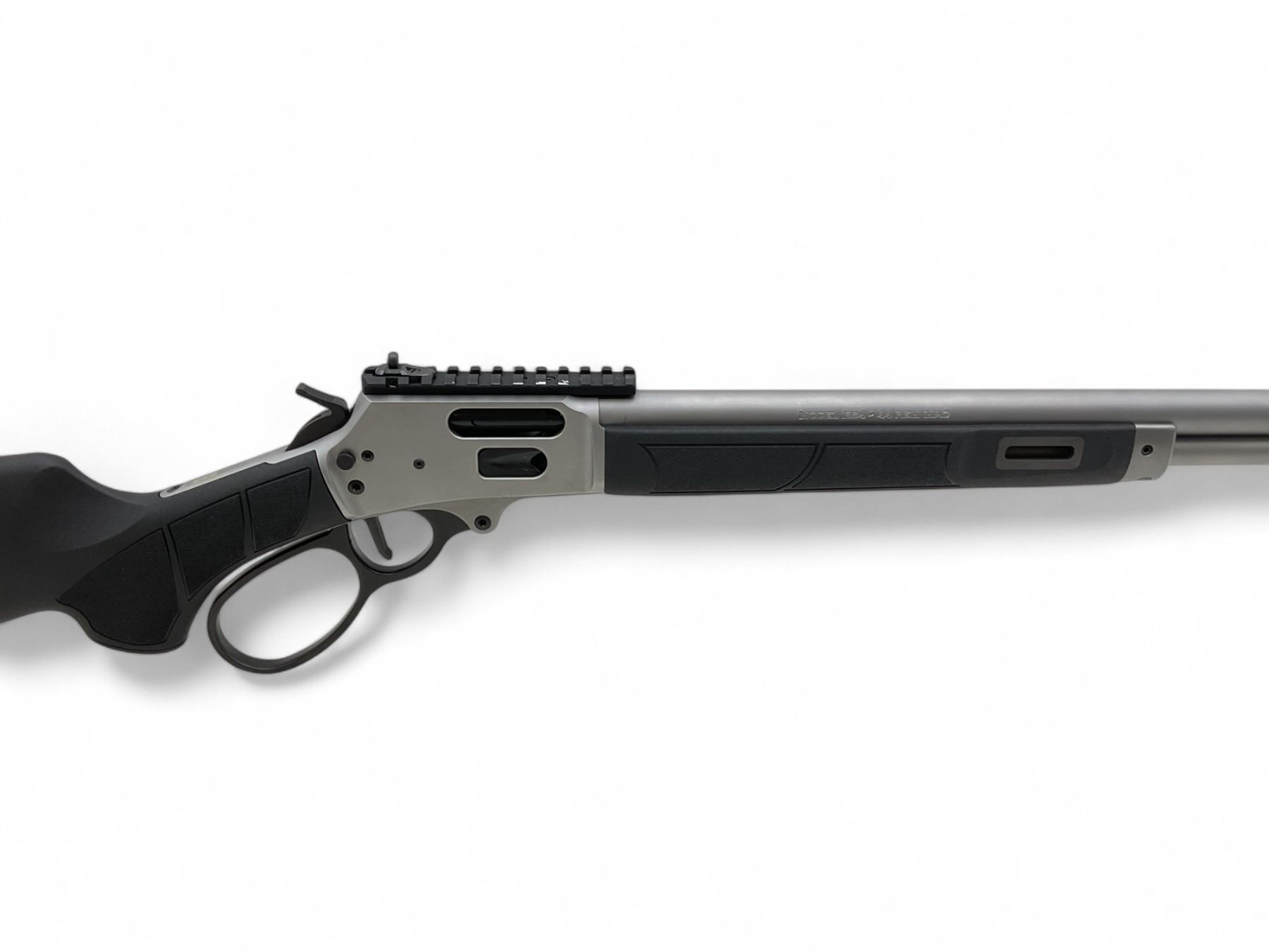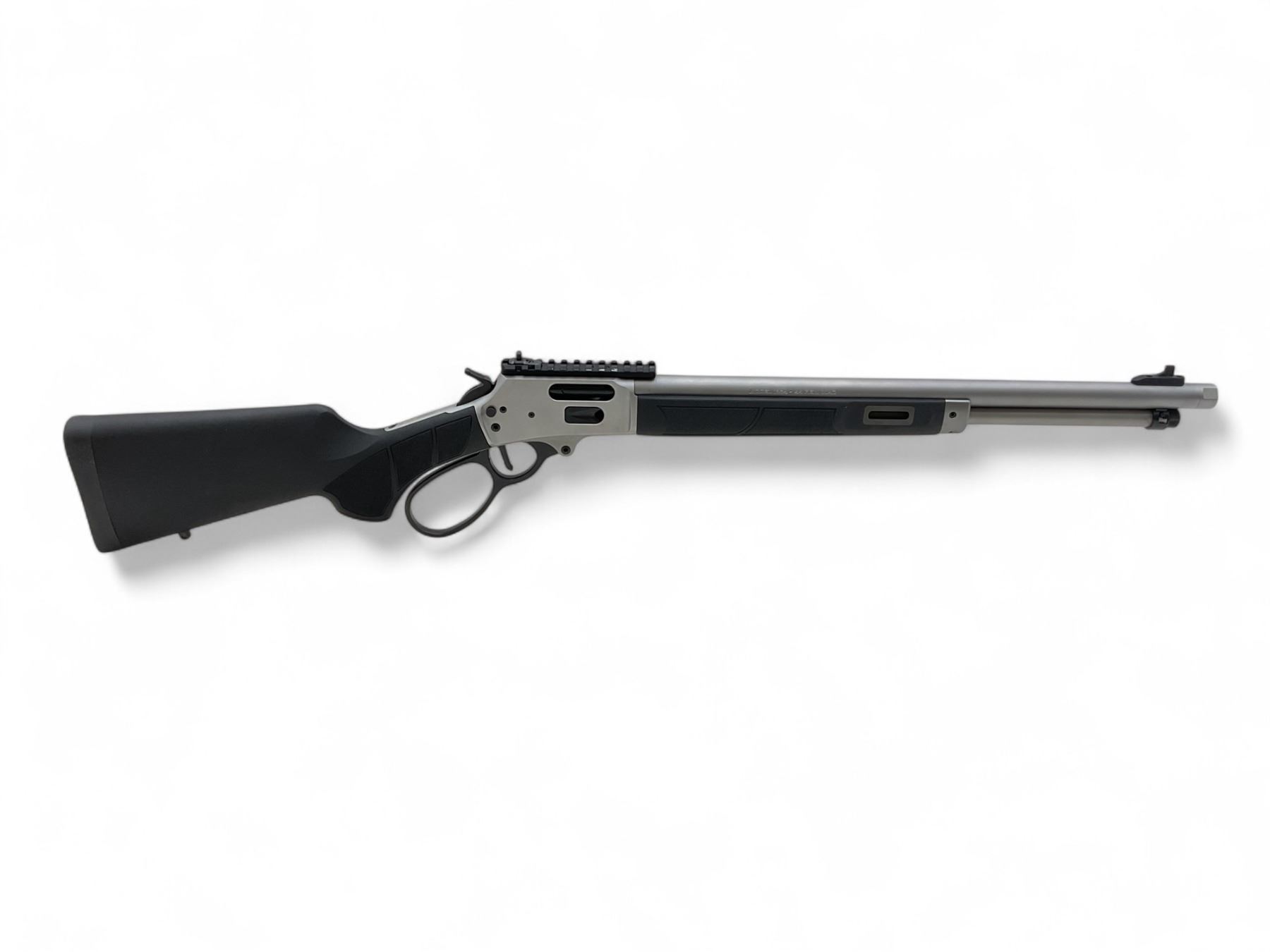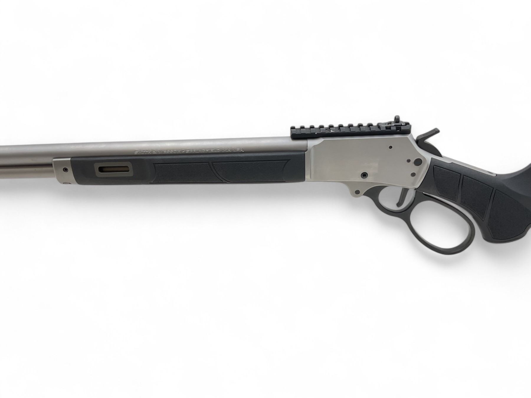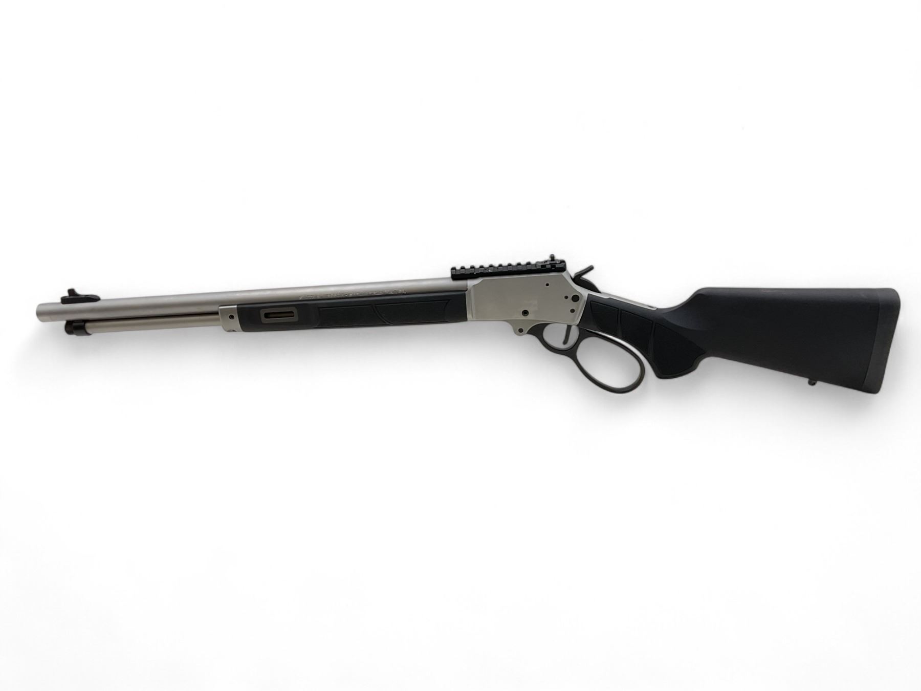 Smith & Wesson 1854 Stainless Lever Action Rifle .44 Magnum 19.25" Barrel With Black Synthetic Stock. Tubular magazine, threaded barrel. XS Sights ghost ring rear sight, fixed front sight. M-LOK® synthetic forend with textured grip panels. This is a non-restricted firearm.
