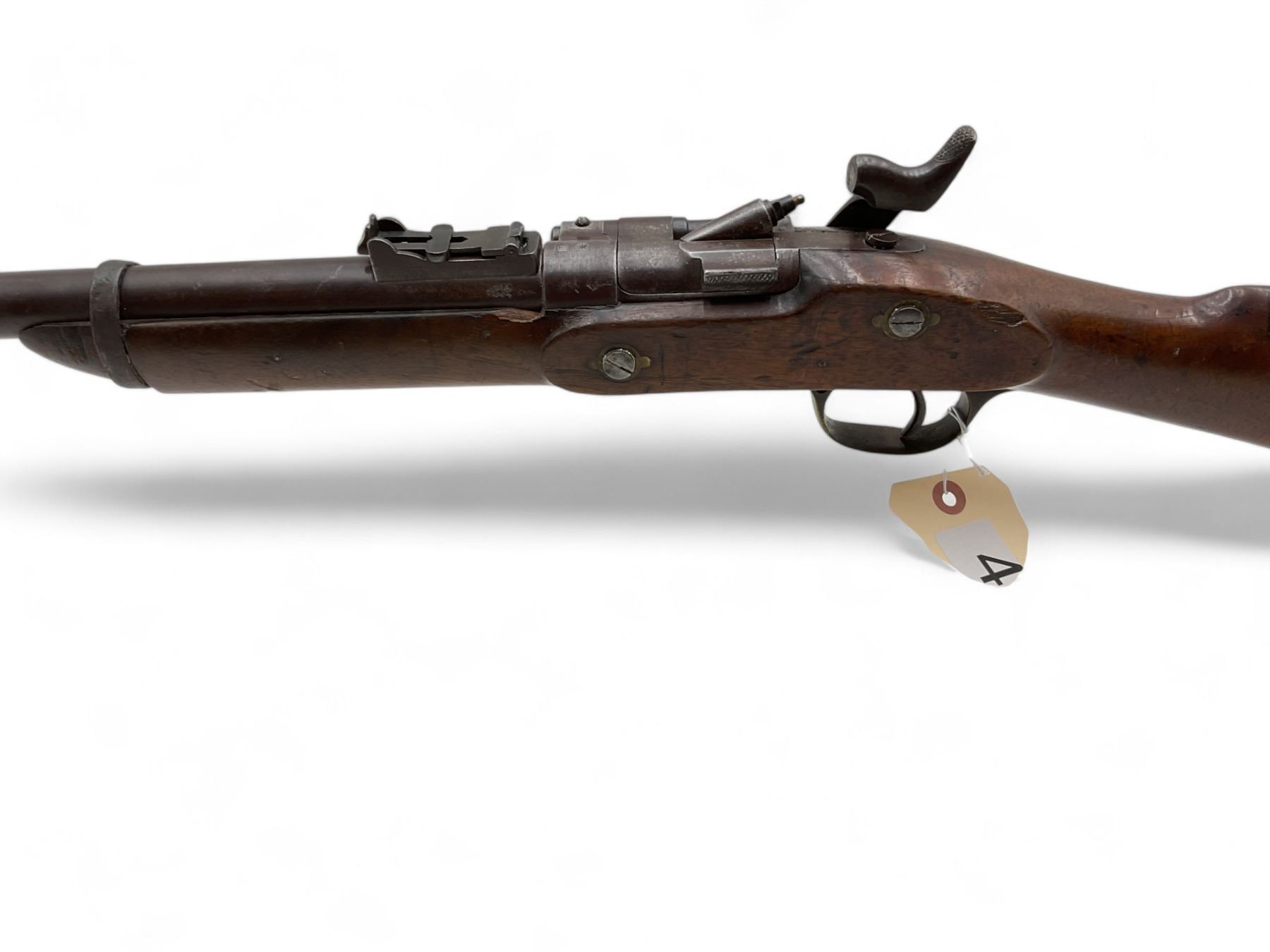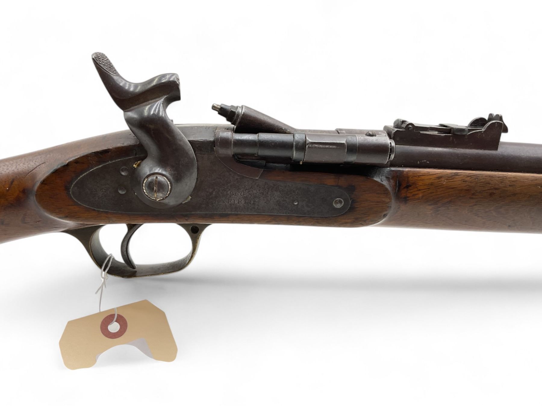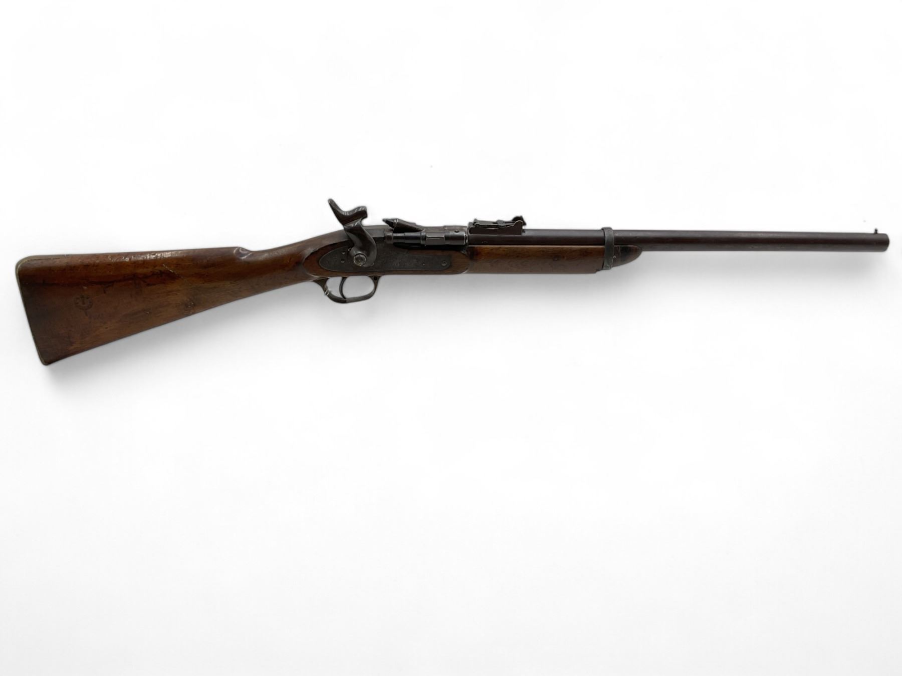 Snider-Enfield Cadet Carbine single-shot breech-loading carbine chambered in .577 Snider. 19" barrel with good black-powder bore. Wood Stock. Steel bead front sight, adjustable rear sight.