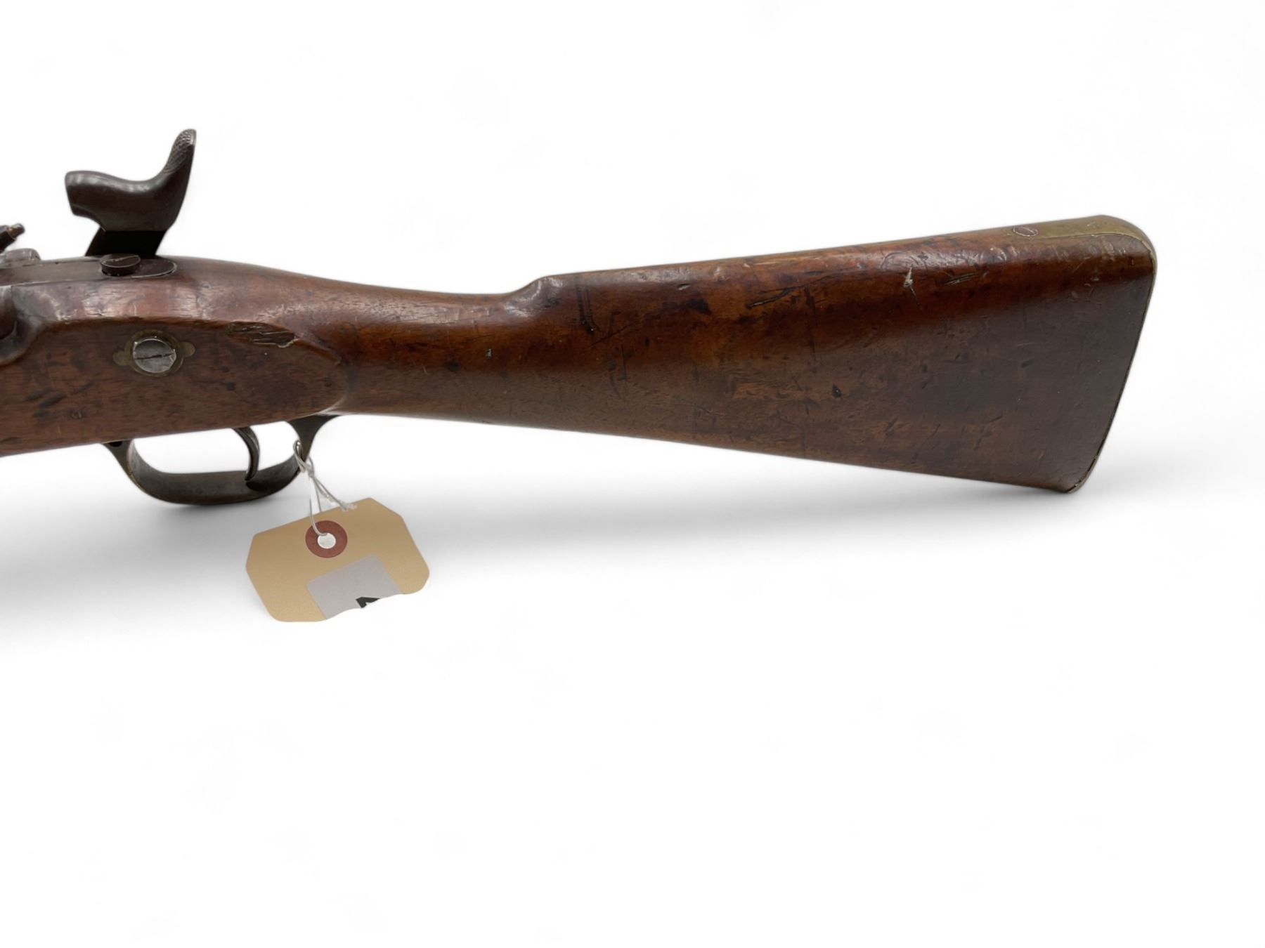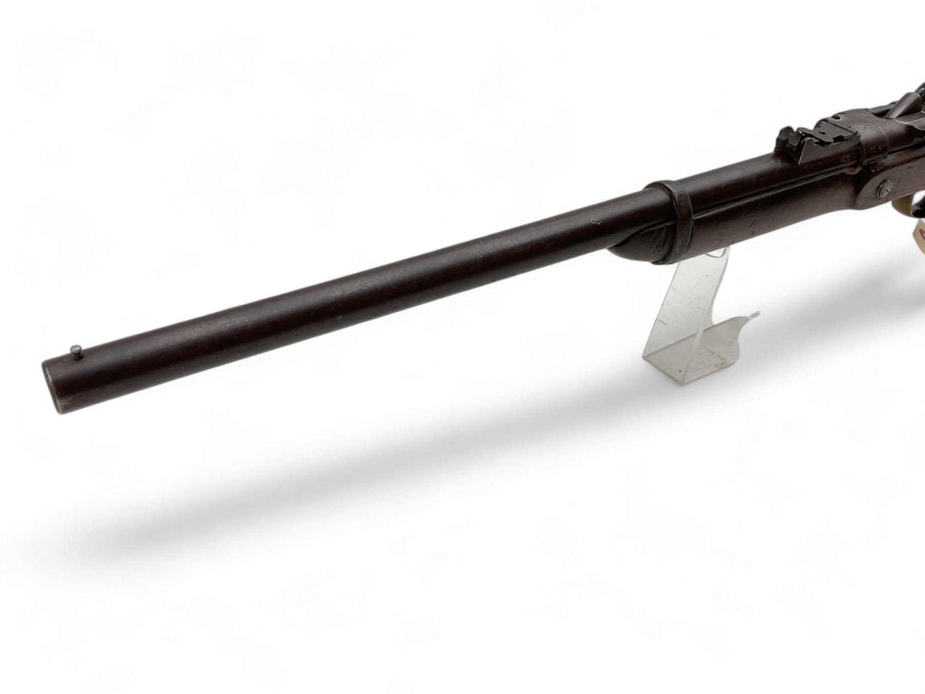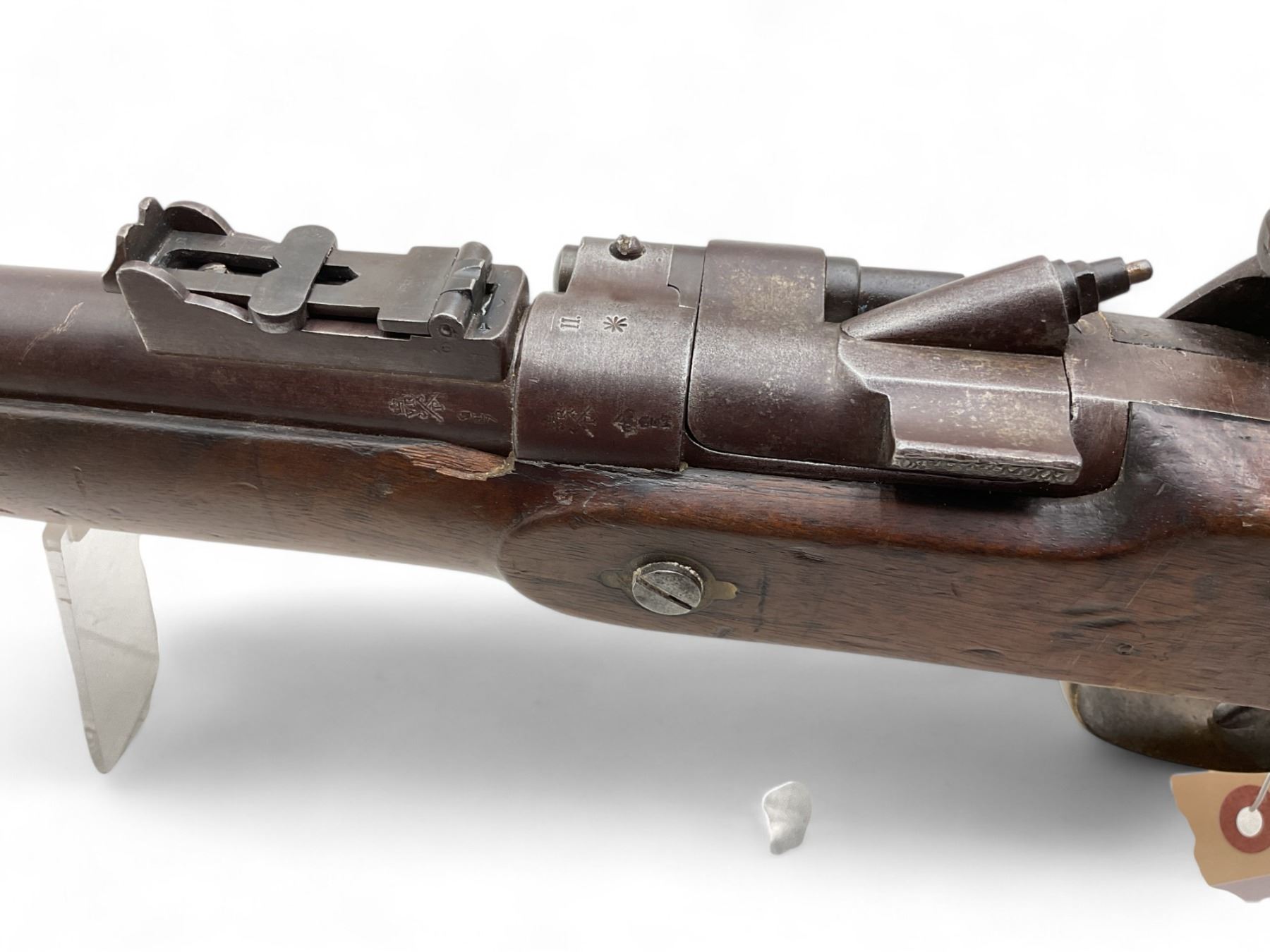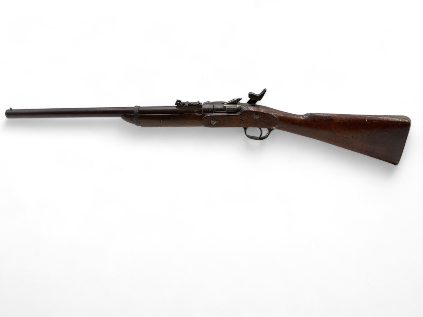 Snider-Enfield Cadet Carbine single-shot breech-loading carbine chambered in .577 Snider. 19" barrel with good black-powder bore. Wood Stock. Steel bead front sight, adjustable rear sight.