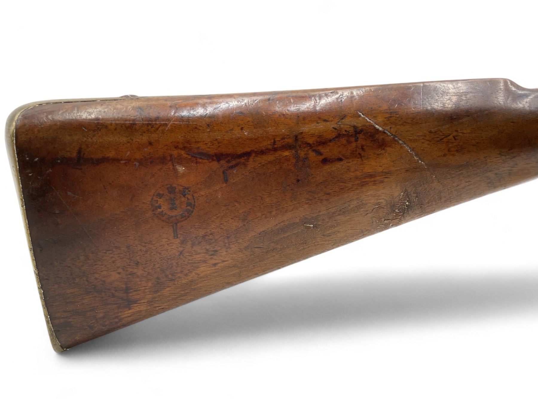A distinctly Canadian modification of the Snider-Enfield infantry rifle for use by Army Cadets. The barrel was cut down to 19" and a steel shotgun-style bead foresight was installed, the stock was cut down and the ramrod channels were filled. These Cadet Carbines were issued well into the last century. This example was a Mark II* rifle with an 1860 Enfield-marked lock plate that was originally issued to the 20th Battalion Lorne Rifles, now the Lorne Scots (Peel, Dufferin and Halton Regiment).