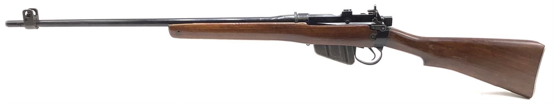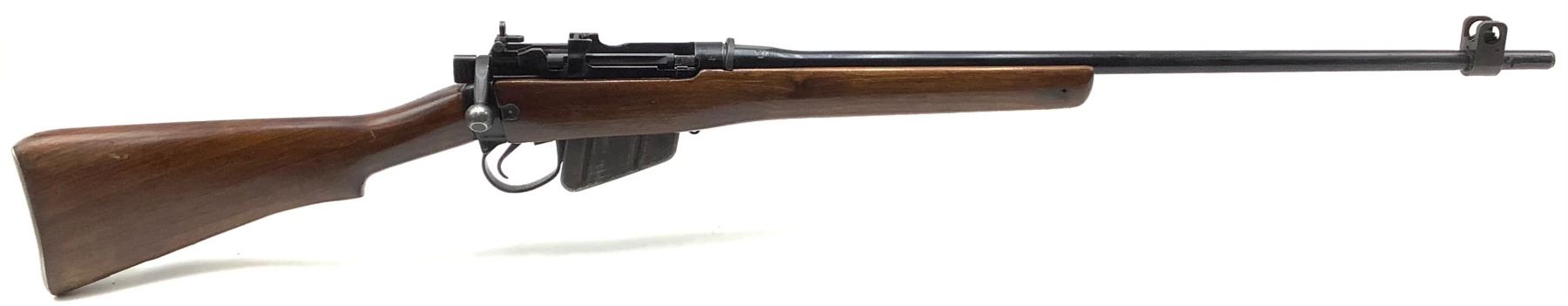 A sporterized 1944 Long Branch-manufactured Lee-Enfield No. 4 Mk. 1* bolt-action rifle chambered in .303 British. Barrel has frosted rifling, rear sight is Mark II 300/600-yard flip sight. Bolt and receiver serial numbers match. Black spray-paint finish.