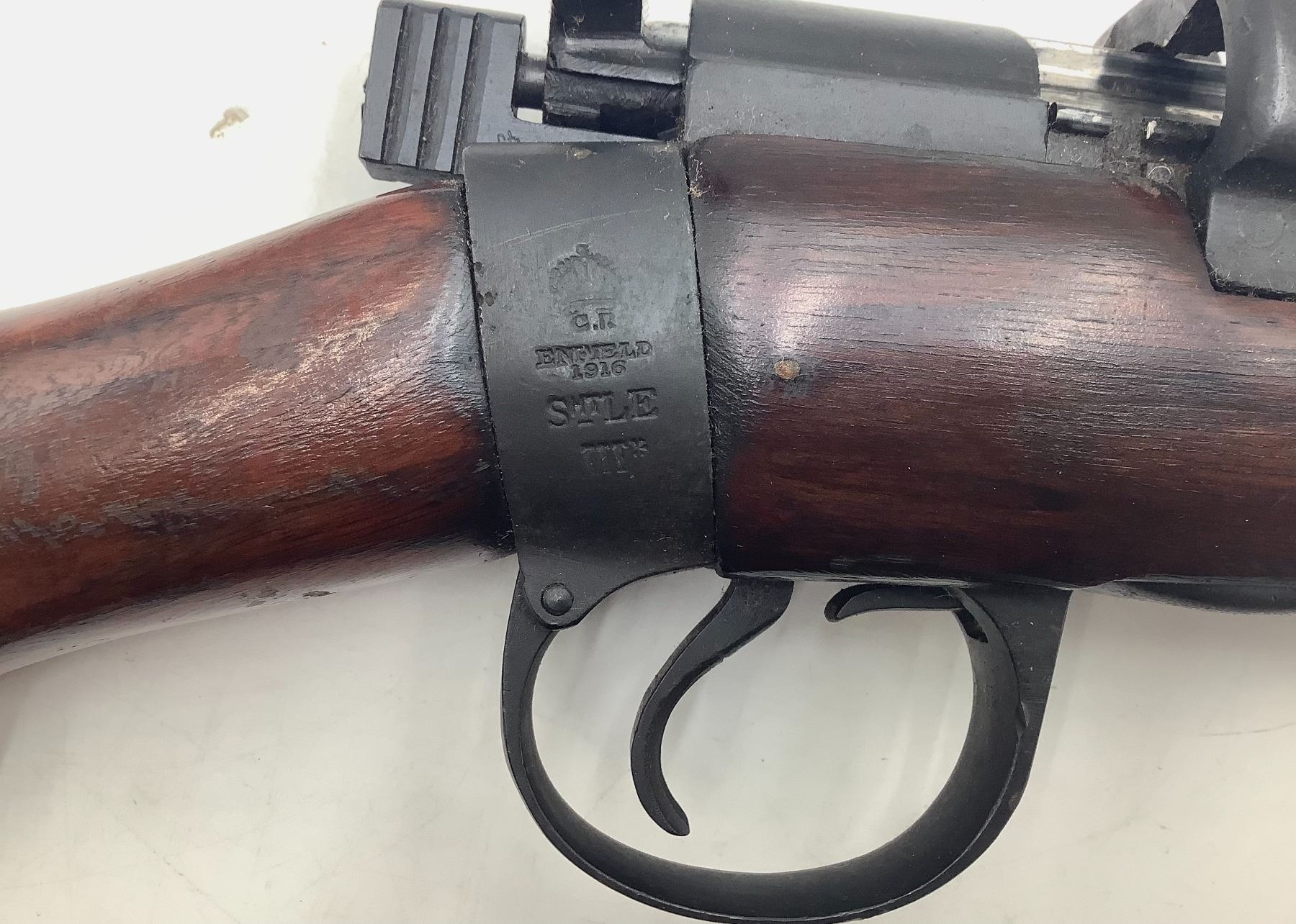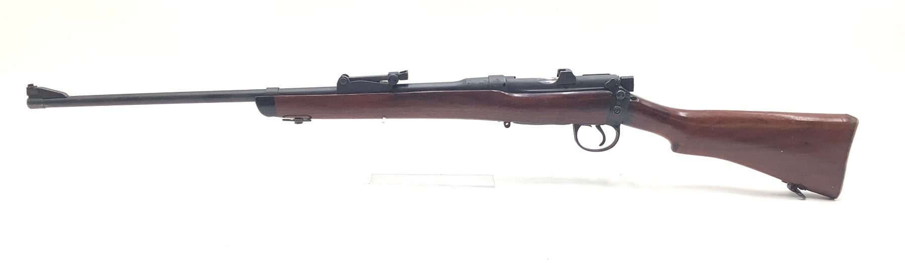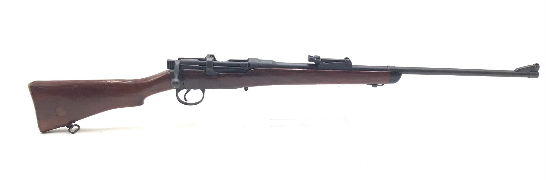 Sporterized Lee Enfield No1 MkIII* Bolt Action Rifle 303 British 24.75" Barrel Wood Stock. Removable magazine, factory open sights. Brass butt plate, sling mounts installed. This is a non-restricted firearm.
