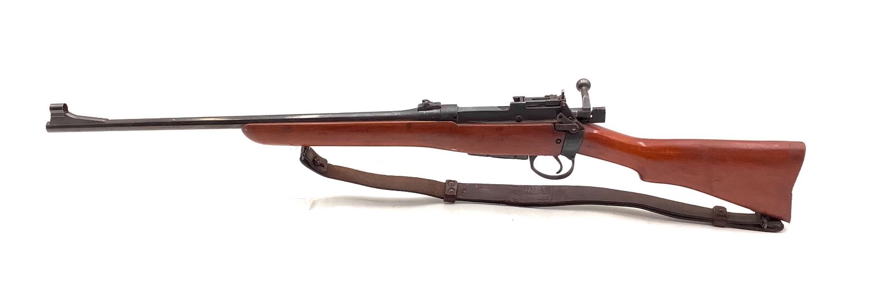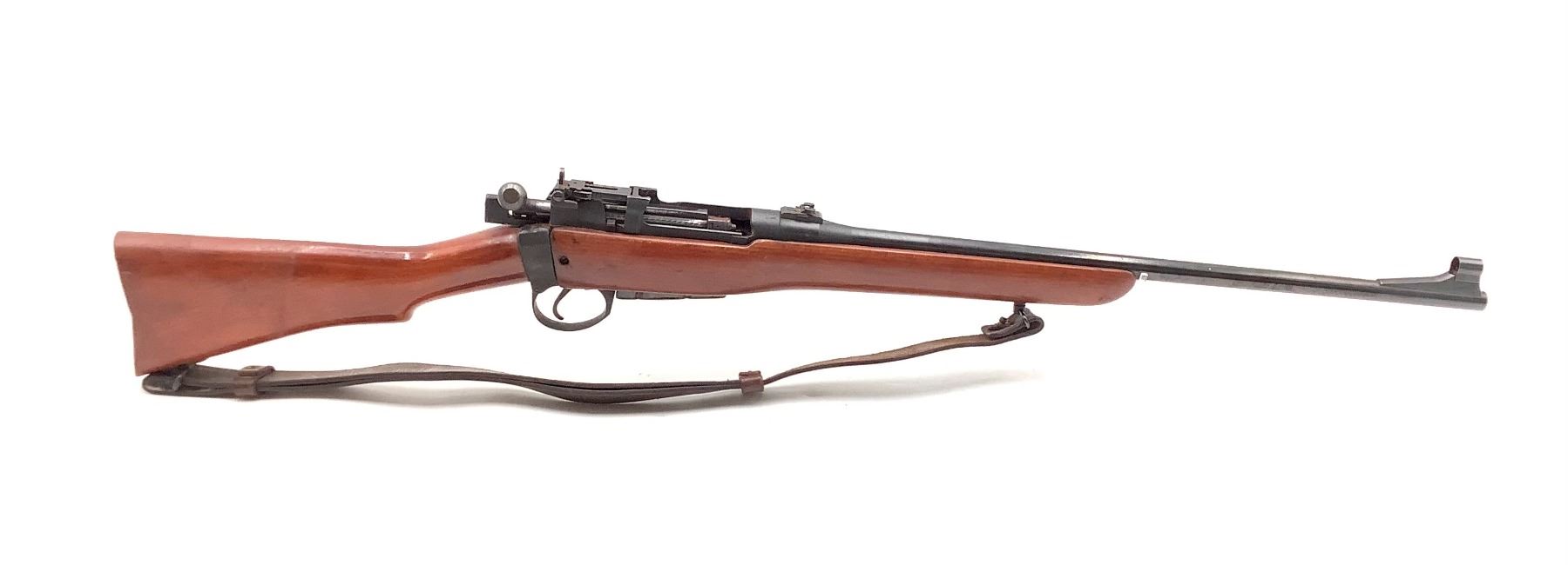 Sporterized Lee Enfield No4 Mk I Bolt Action Rifle 303 British 22" Barrel Canadian Marked Rear Sight. Includes leather sling, no butt pad present. Detachable short magazine. Wood stocks have scratches and nicks, metal finish has wear, rust and marks. This is a non-restricted firearm.
