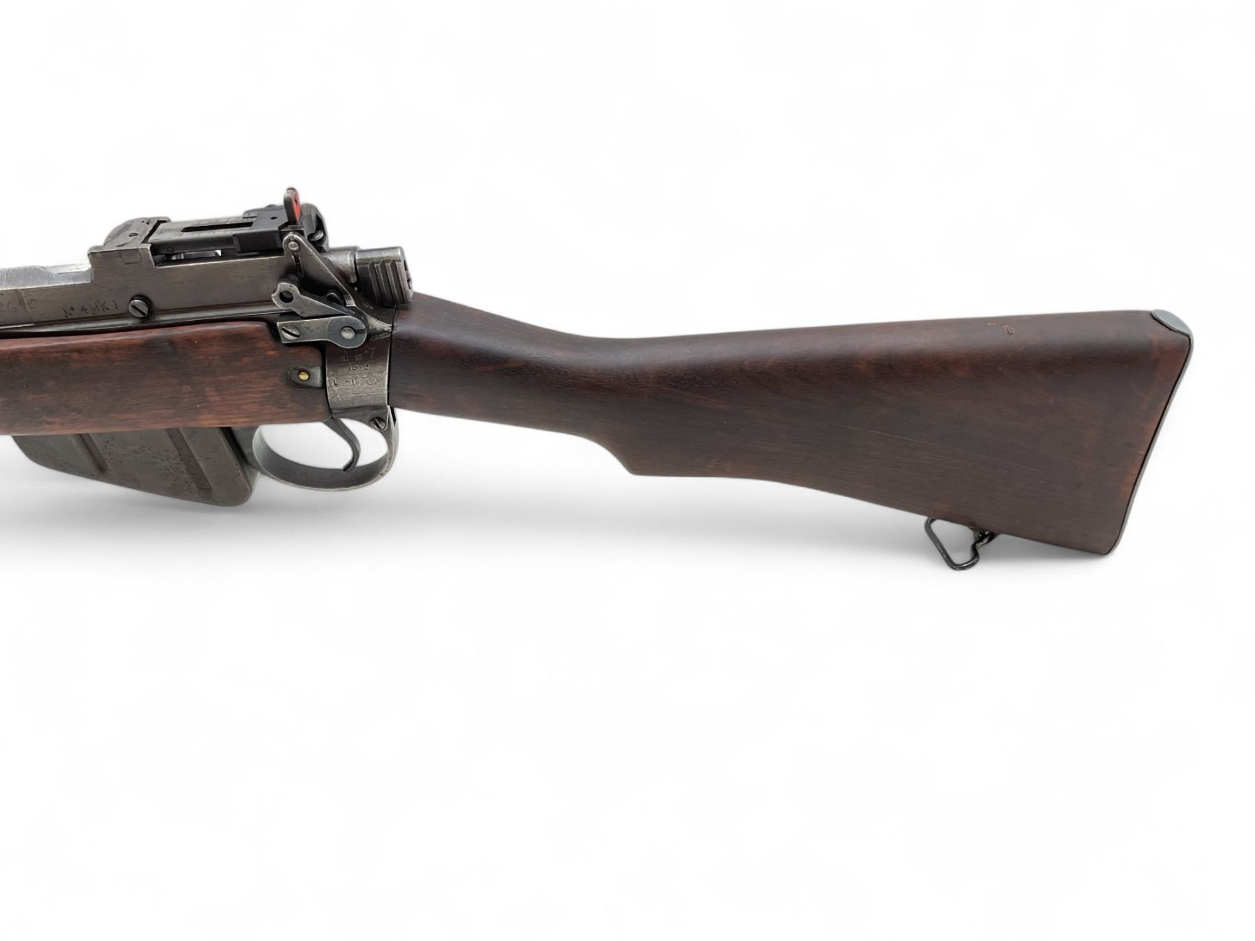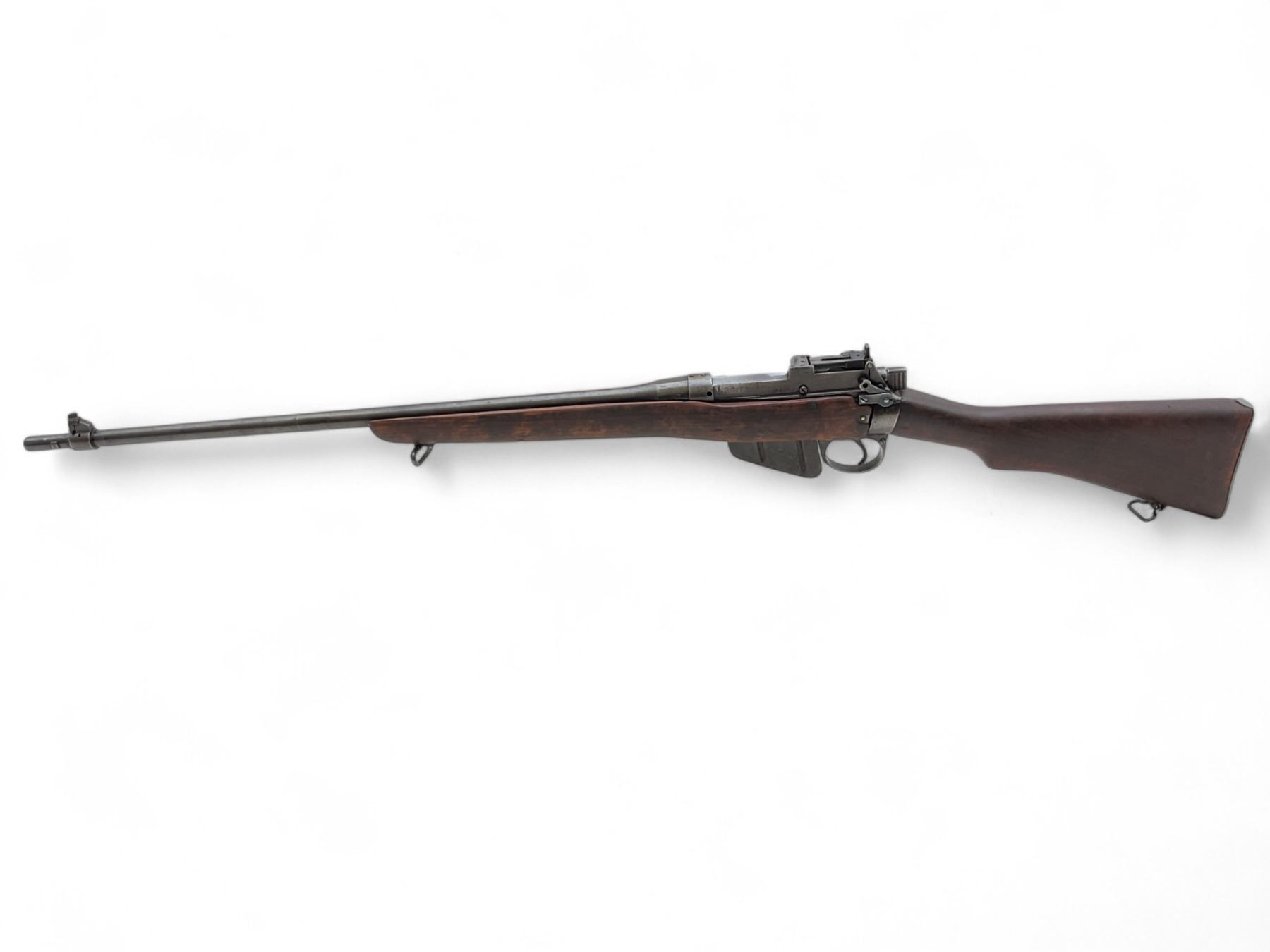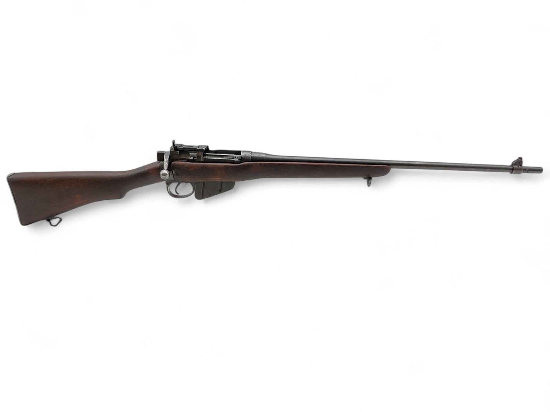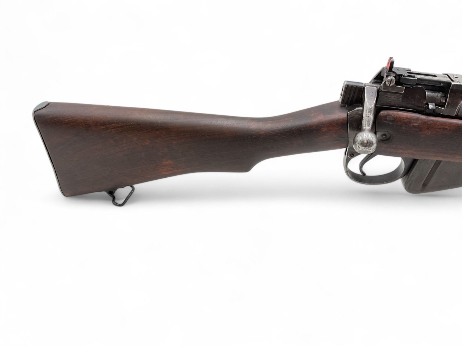 Sporterized Lee Enfield No4 Mk1 Bolt Action Rifle 303 British 25" Barrel Wood Stock. Receiver has been drilled and tapped but holes appear too deep; consignor indicated this gun best used as a parts gun. Comes with one detachable magazine. Fixed front sight, adjustable rear sight has been modified. This is a non-restricted firearm.