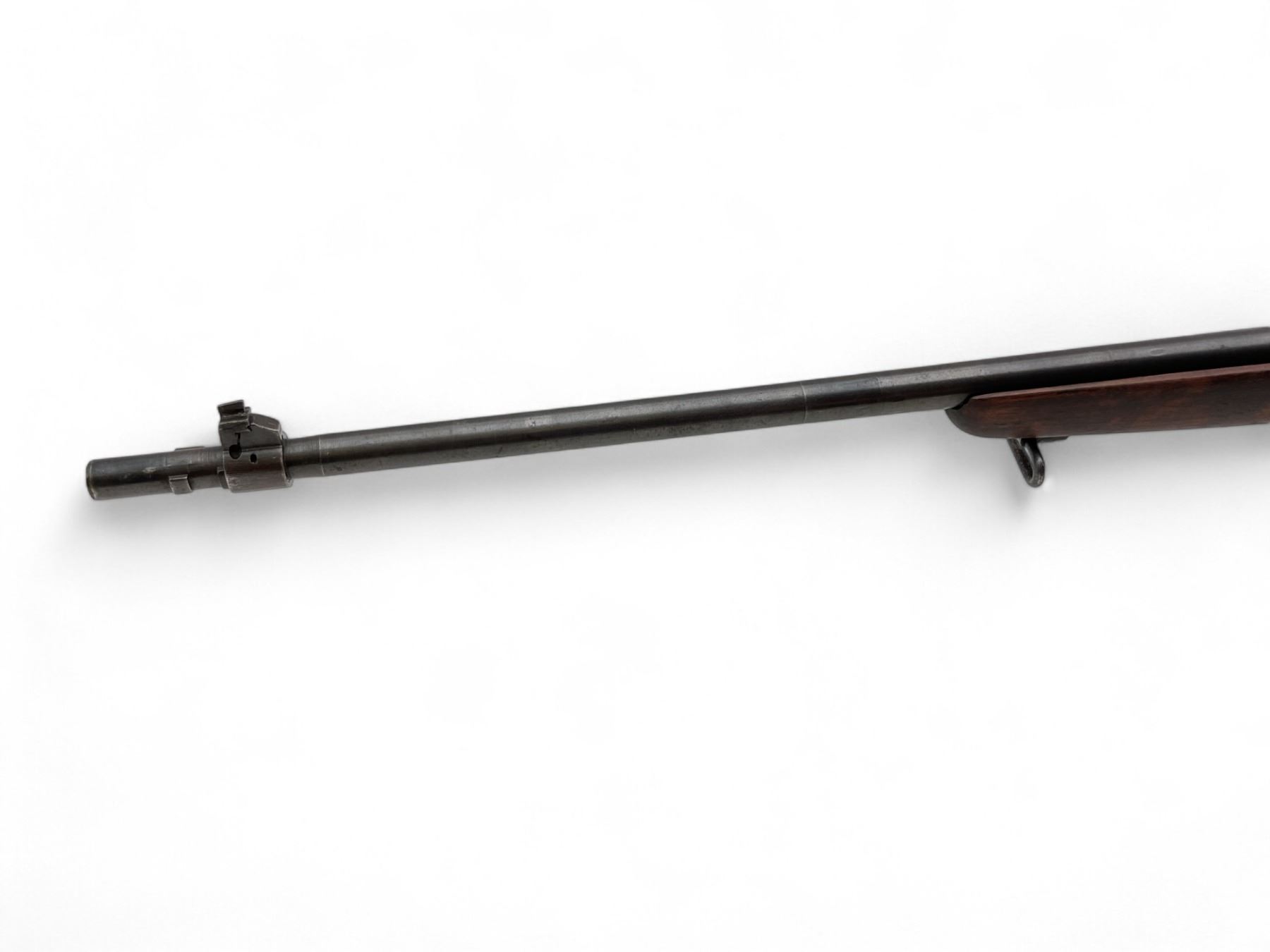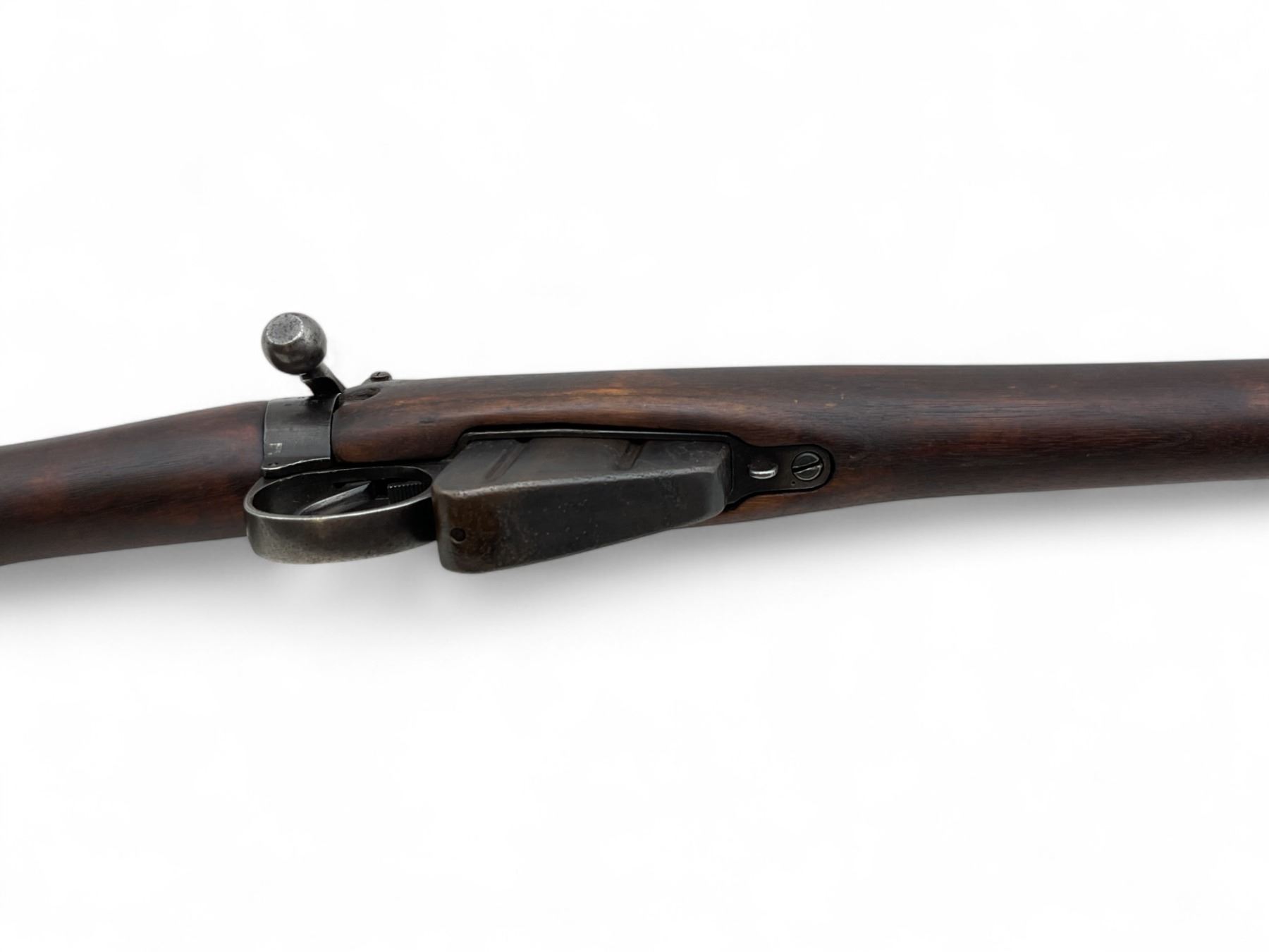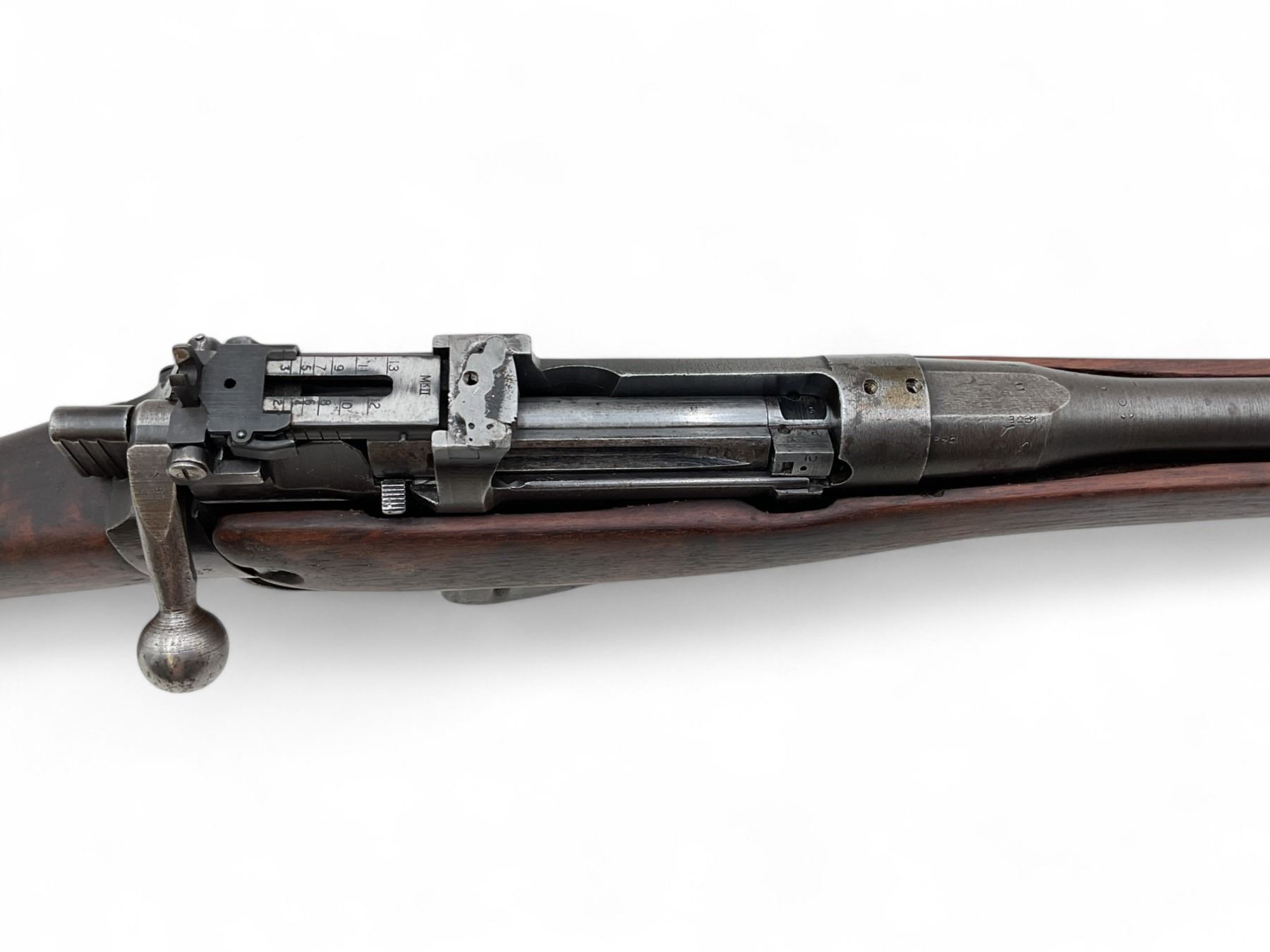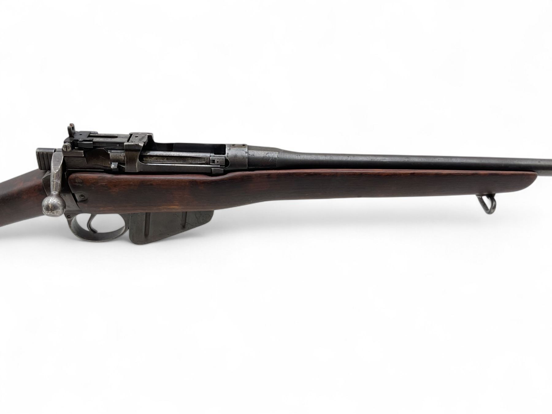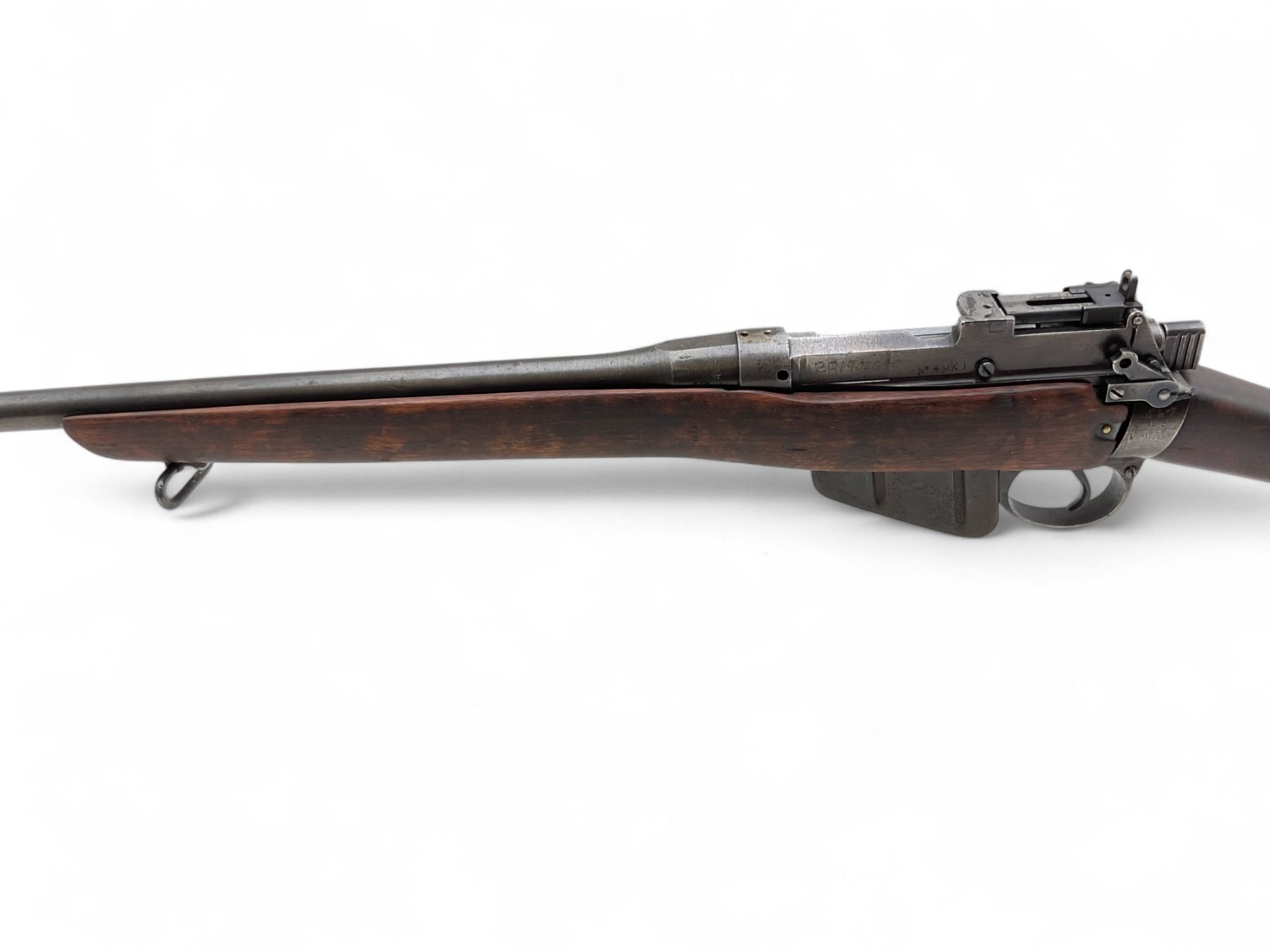 Sporterized Lee Enfield No4 Mk1 Bolt Action Rifle 303 British 25" Barrel Wood Stock. Receiver has been drilled and tapped but holes appear too deep; consignor indicated this gun best used as a parts gun. Comes with one detachable magazine. Fixed front sight, adjustable rear sight has been modified. This is a non-restricted firearm.