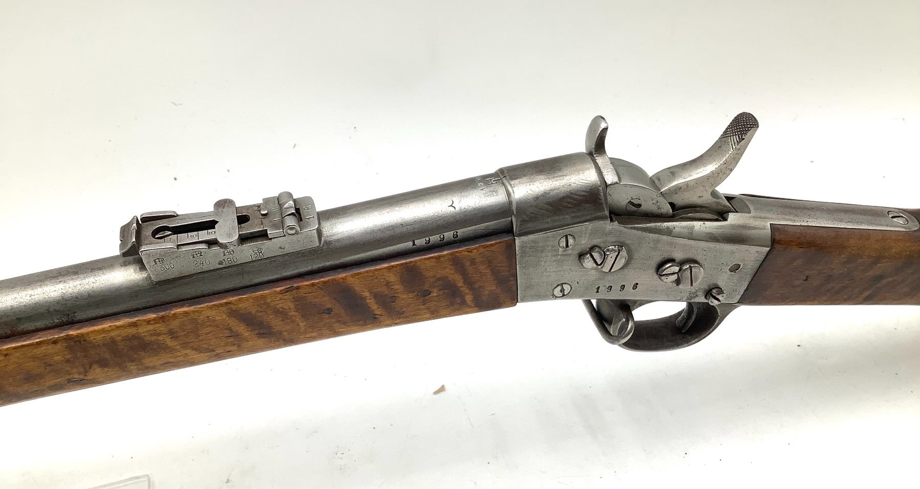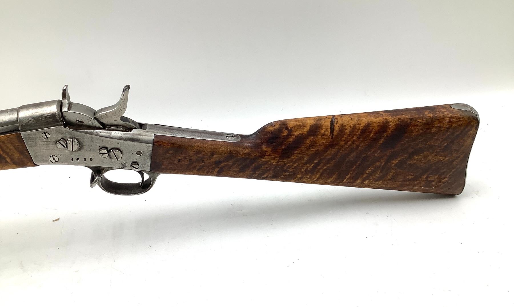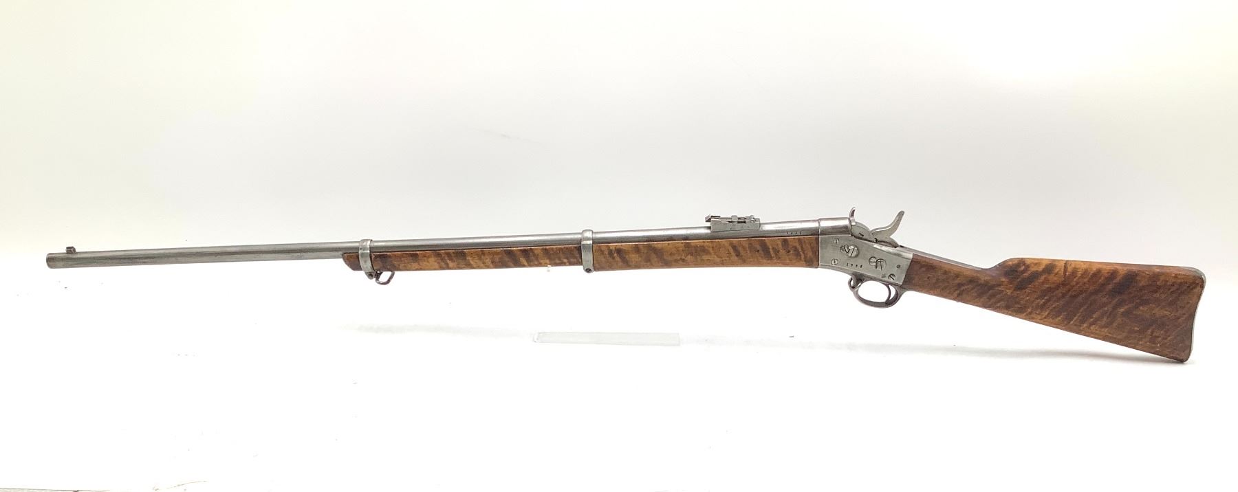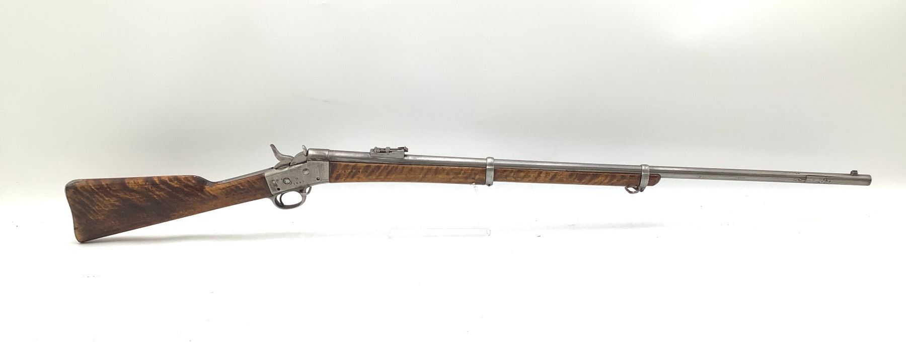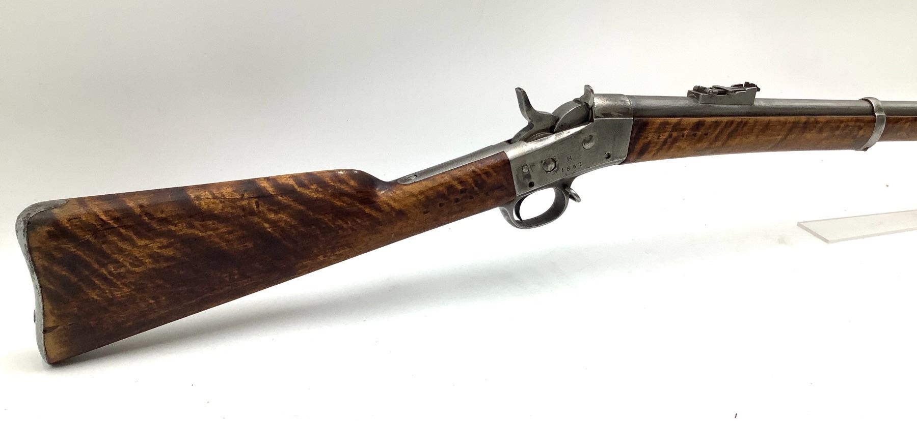 A sporterized Husqvarna-manufactured Remington Model 1867 rolling block single-shot service rifle. 37.5" barrel with black bore, chambered in 12.7X44R centrefire. Wood Stock. Factory open sights, metal butt plate.