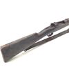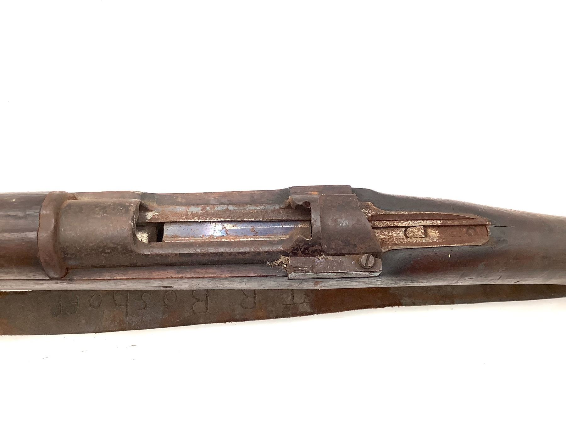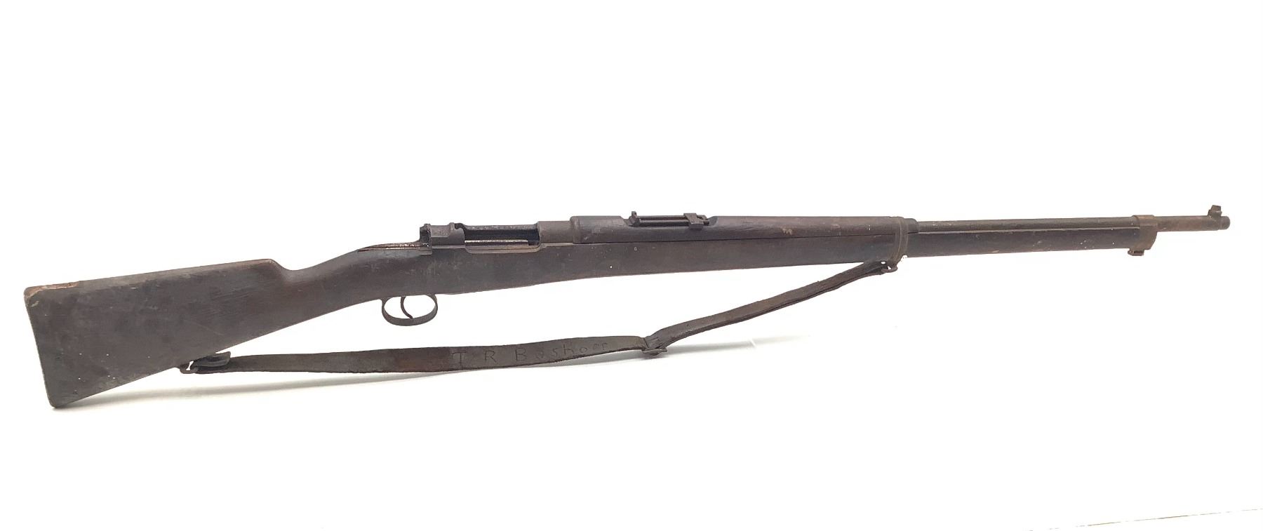 A surplus Mauser 1895 bolt-action service rifle chambered in 7X57 Mauser. Missing bolt. All metal surfaces and bore rusted. Stock is dry with cracks at the rear of the action inletting. Original leather sling with "T.R. Boshoff" carved into leather sling. This rifle was found in an attic.