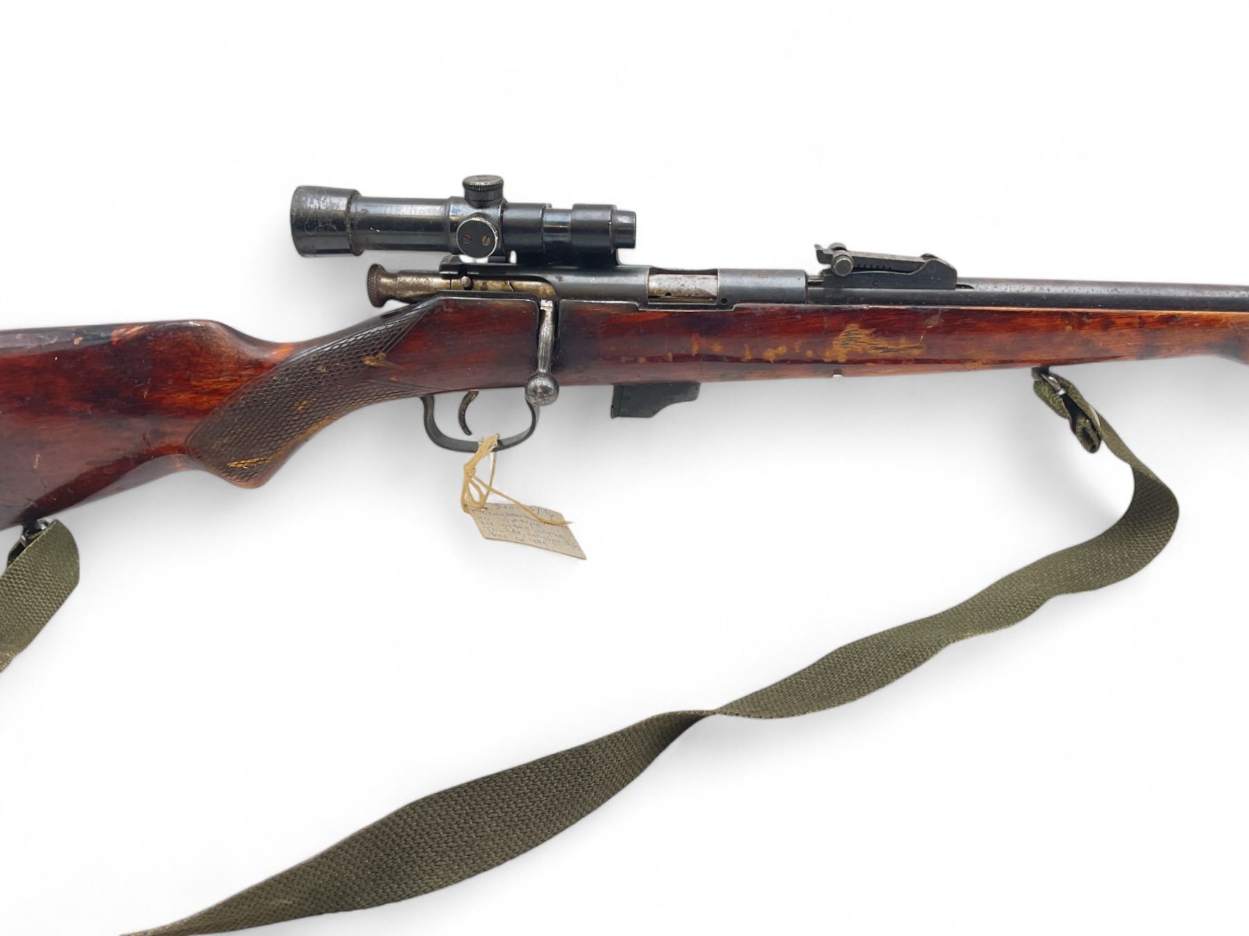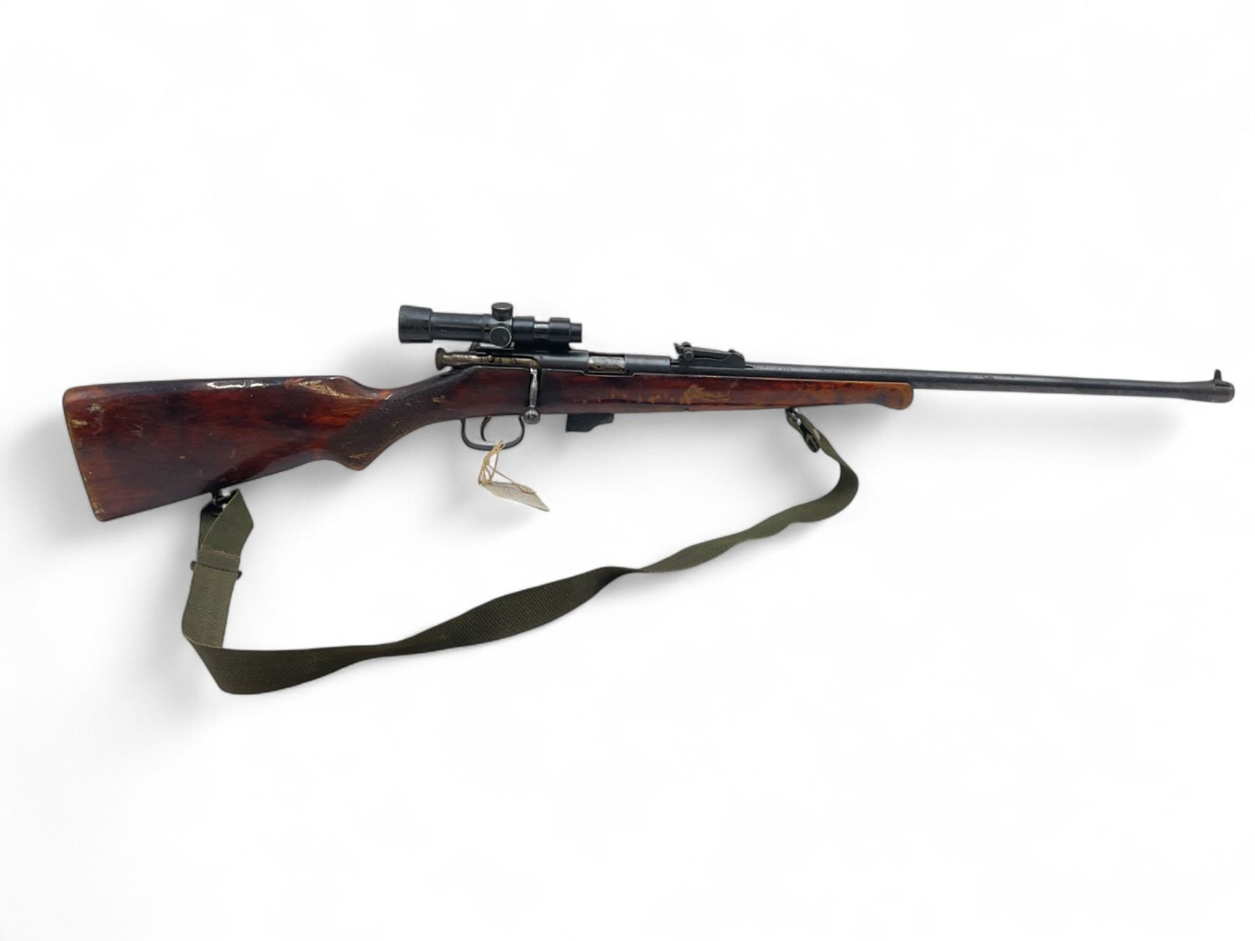 TOZ 18 Bolt Action Rifle 22LR 21" Barrel Wood Stock With Russian Scope. No magazine included. Fixed front sight, adjustable rear sight. Also includes sling. This is a non-restricted firearm.
