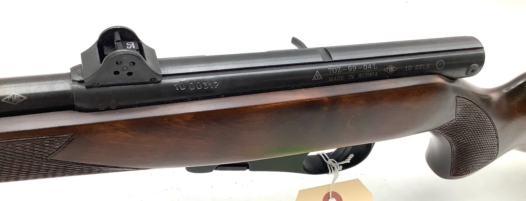 TOZ-99 Semi Auto Rifle 22LR 21" Threaded Barrel Wood Stock. Detachable magazine, comes with sling mounts. Hooded front sight, adjustable rear sight. This is a non-restricted firearm.