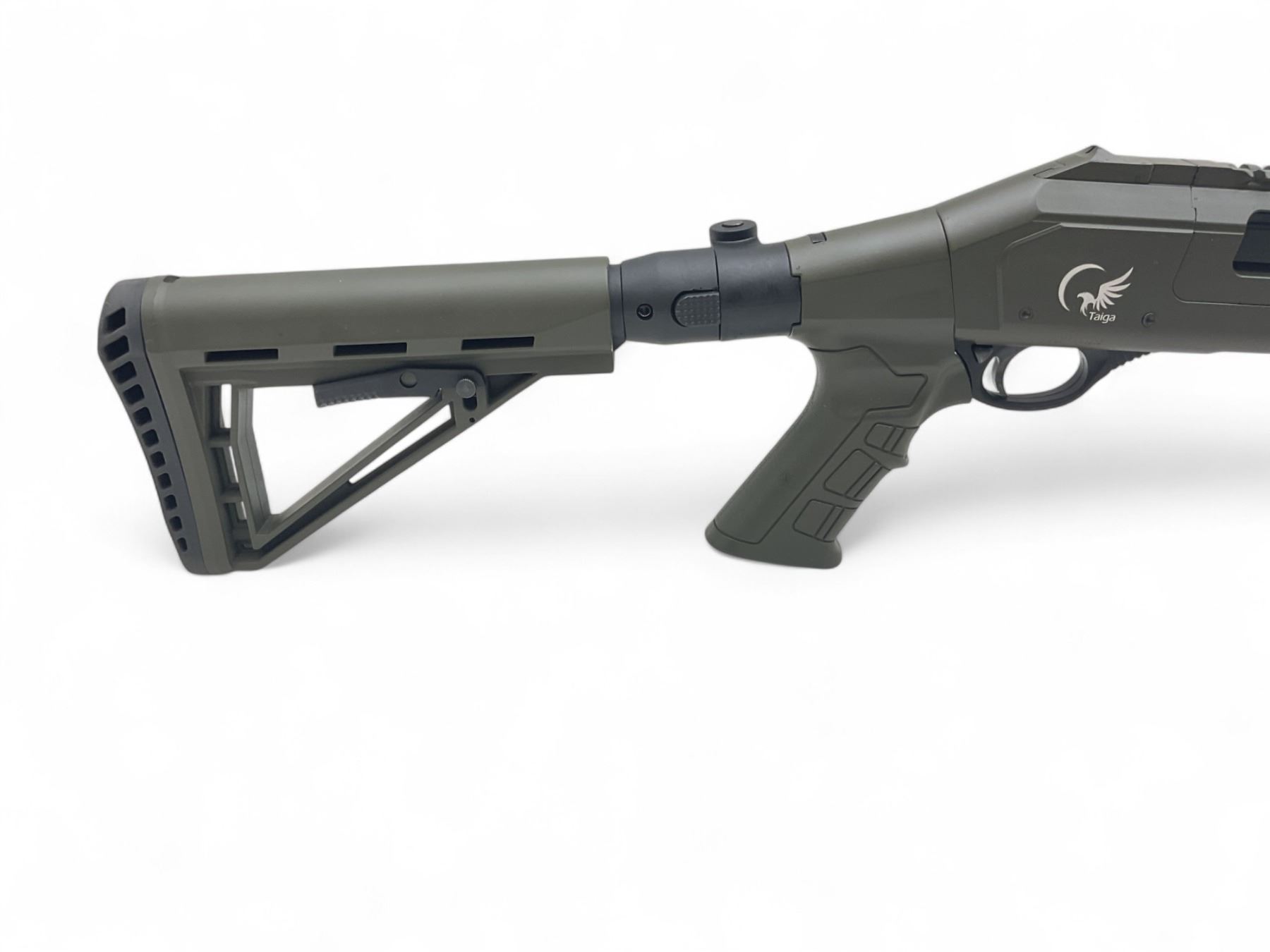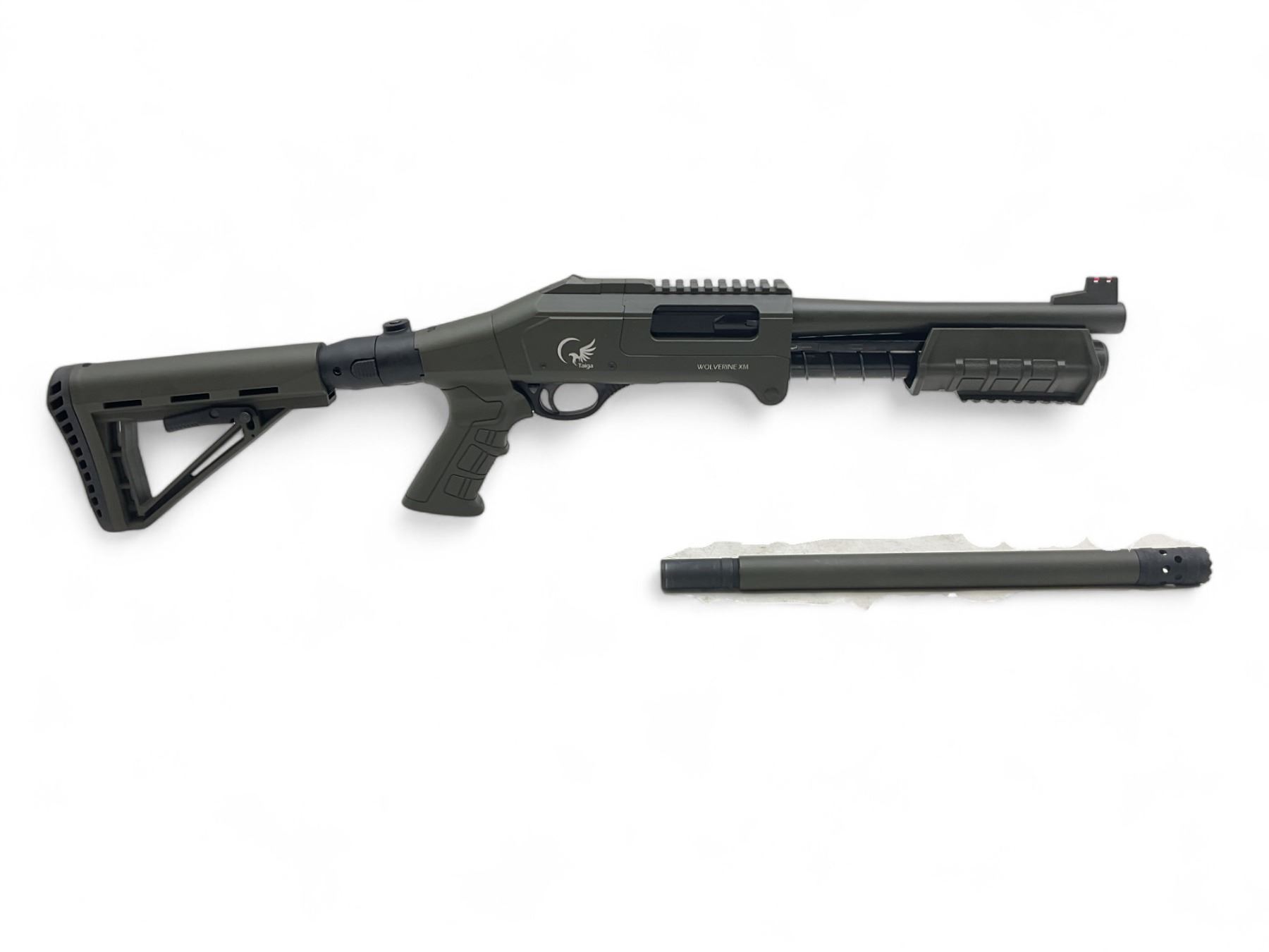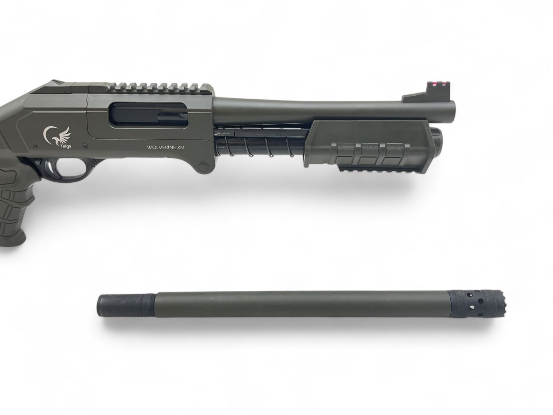Sulun Arms Taiga Wolverine XM Folding Pump Action Shotgun 12Ga 3" Chamber 10" Barrel Green With Folding Stock. Comes with a removable choke and a 10" Barrel extension with removable brake. Adjustable rear stock. This is a non-restricted firearm.