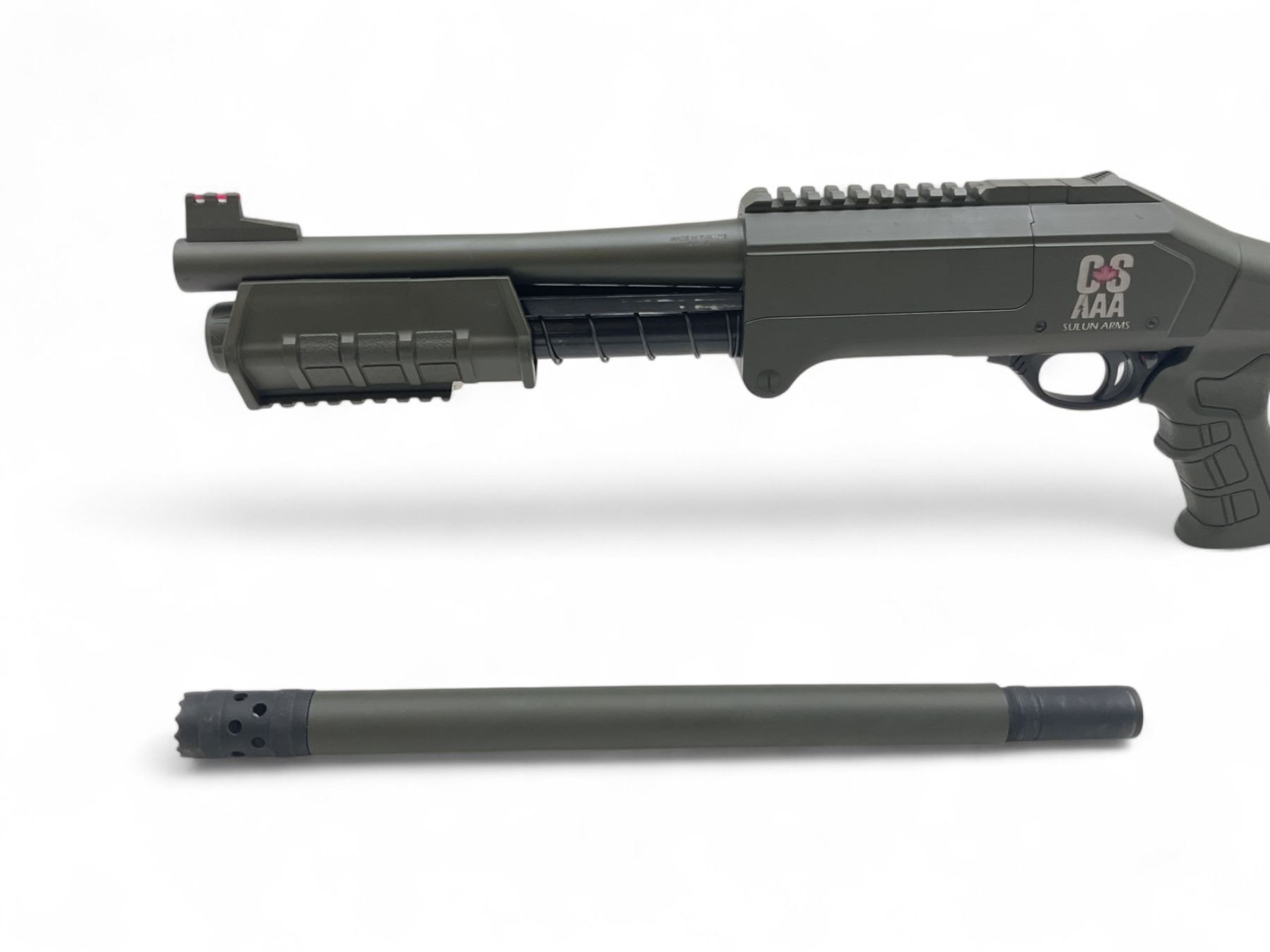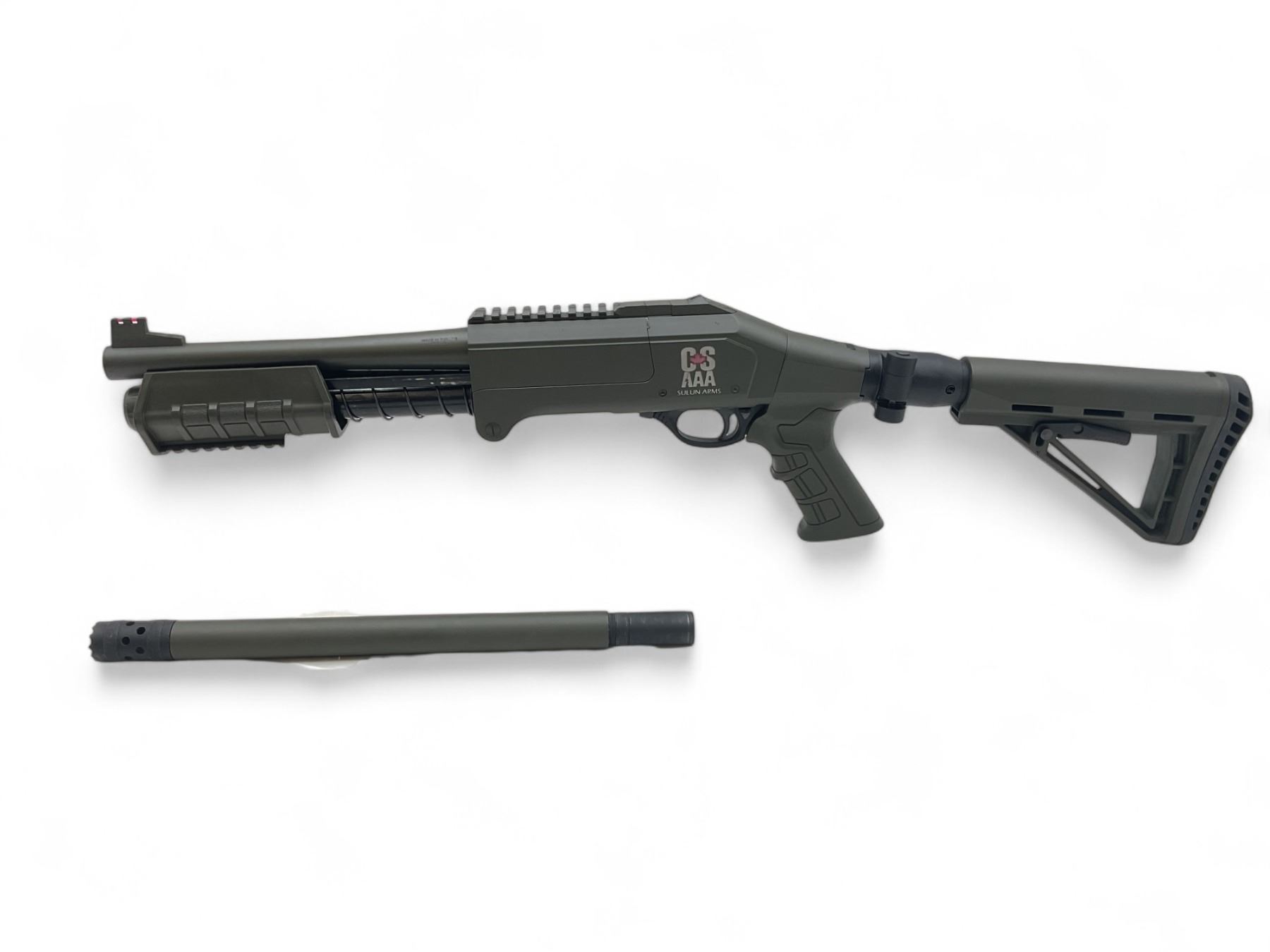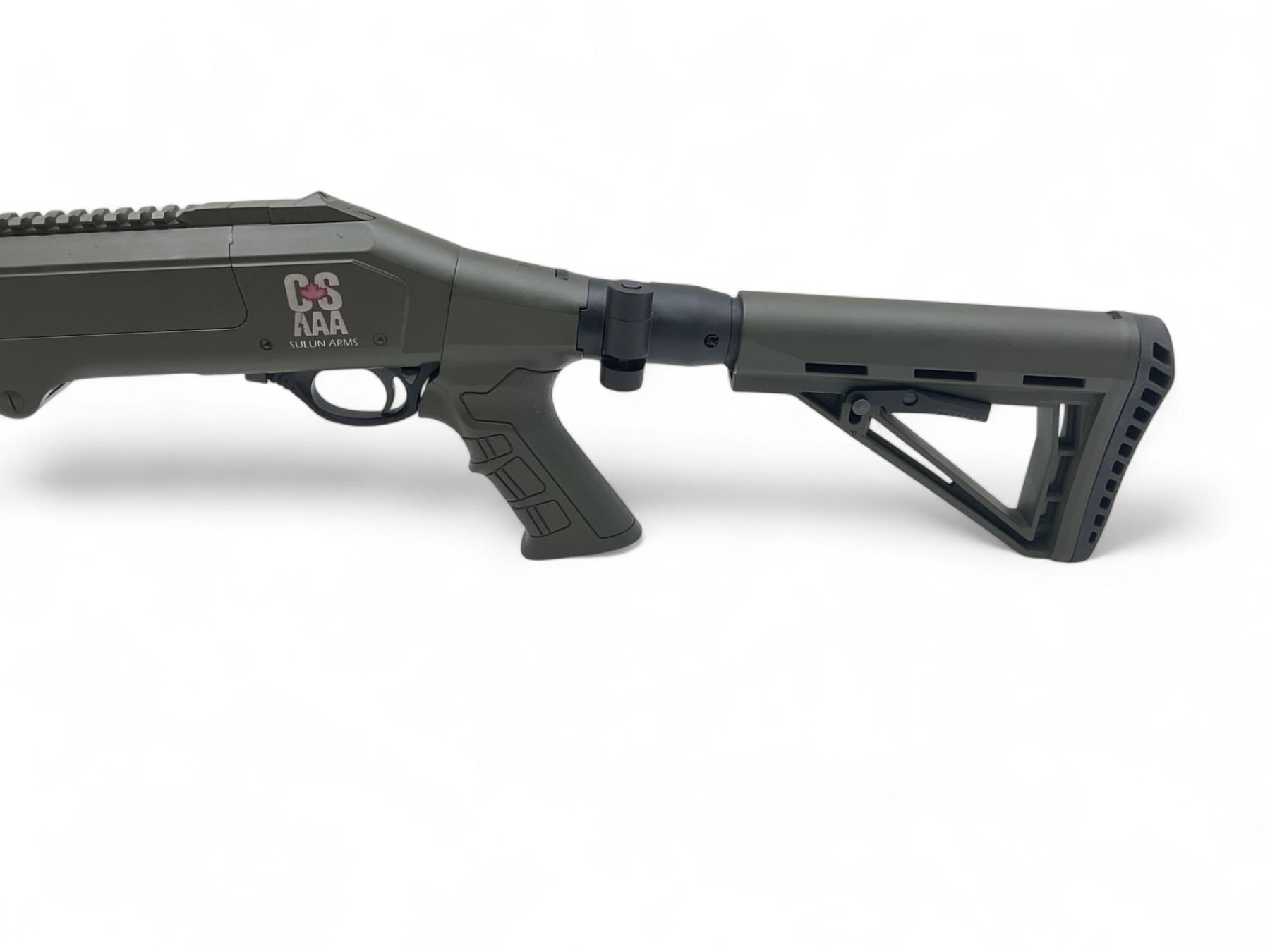 Sulun Arms Taiga Wolverine XM Folding Pump Action Shotgun 12Ga 3" Chamber 10" Barrel Green With Folding Stock. Comes with a removable choke and a 10" Barrel extension with removable brake. Adjustable rear stock. This is a non-restricted firearm.
