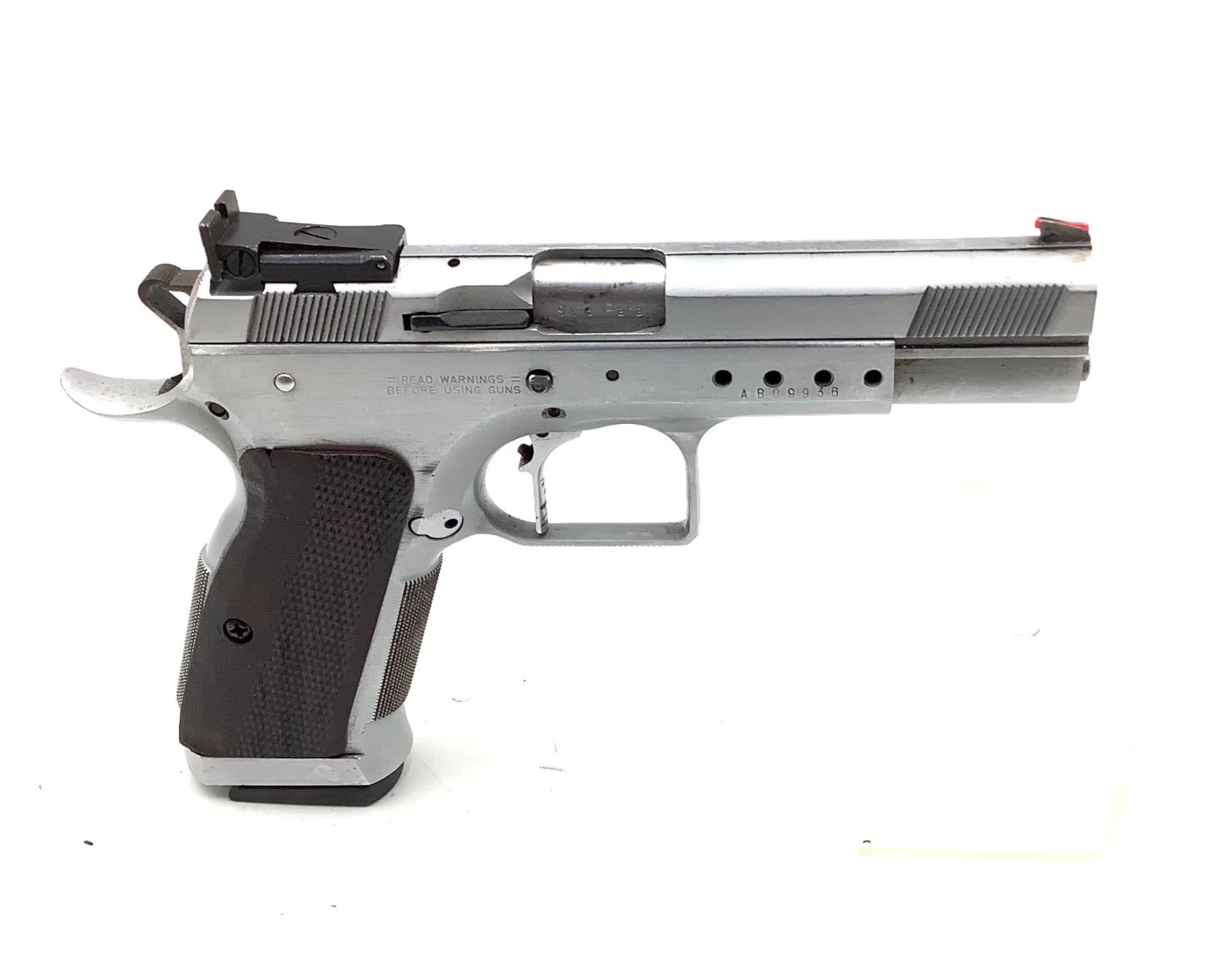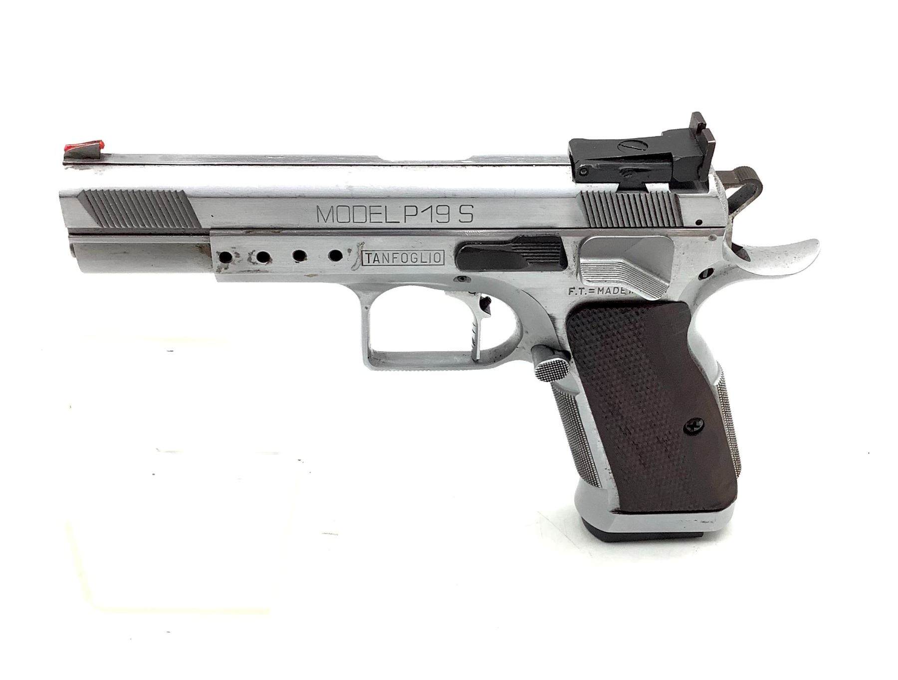Tanfoglio P19S Semi Auto Pistol 9mm 4.4" Barrel Stainless, Restricted. Includes one magazine. Adjustable rear sight, wood grips, extended controls. Frame has been drilled and tapped. This is a restricted firearm.
