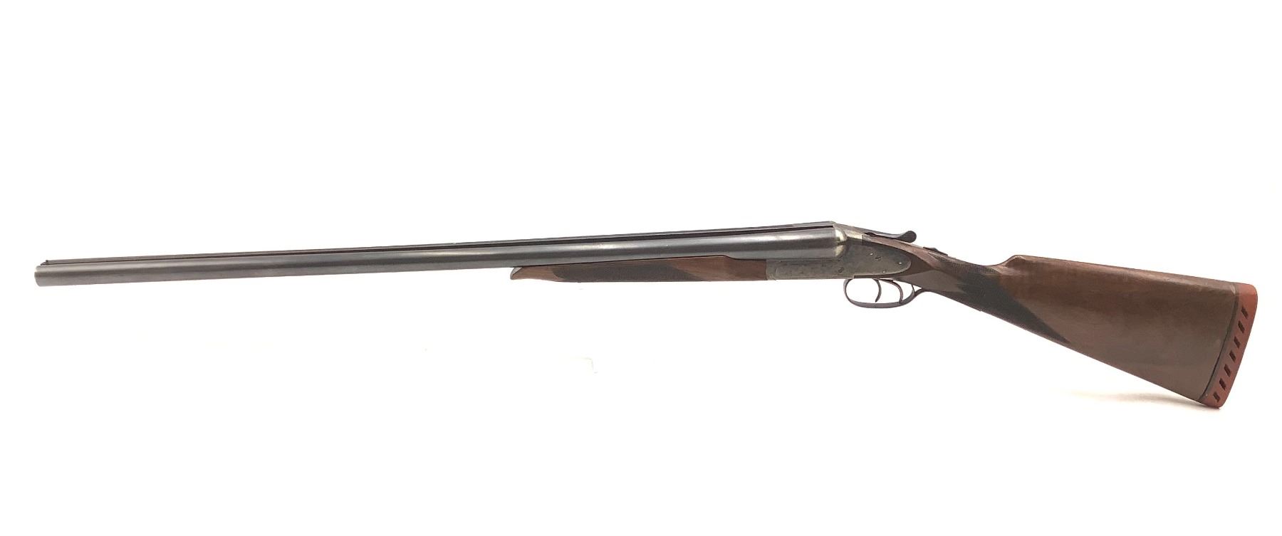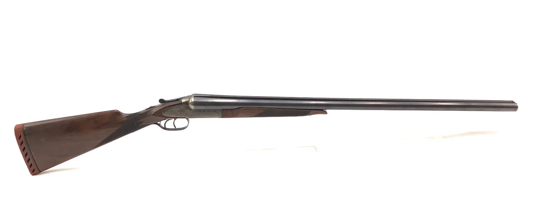 A used Tobin Arms side-by-side shotgun with 30" barrels chambered in 12 Gauge 2" (12 Gauge x 2 Inches), left barrel is FULL choke and the right barrel is IMPROVED MODIFIED. Bead sight, custom butt pad. Wood stock has cracks and scratches. Some case hardening on receiver, rest of metal finish is has scratches and some wear present.