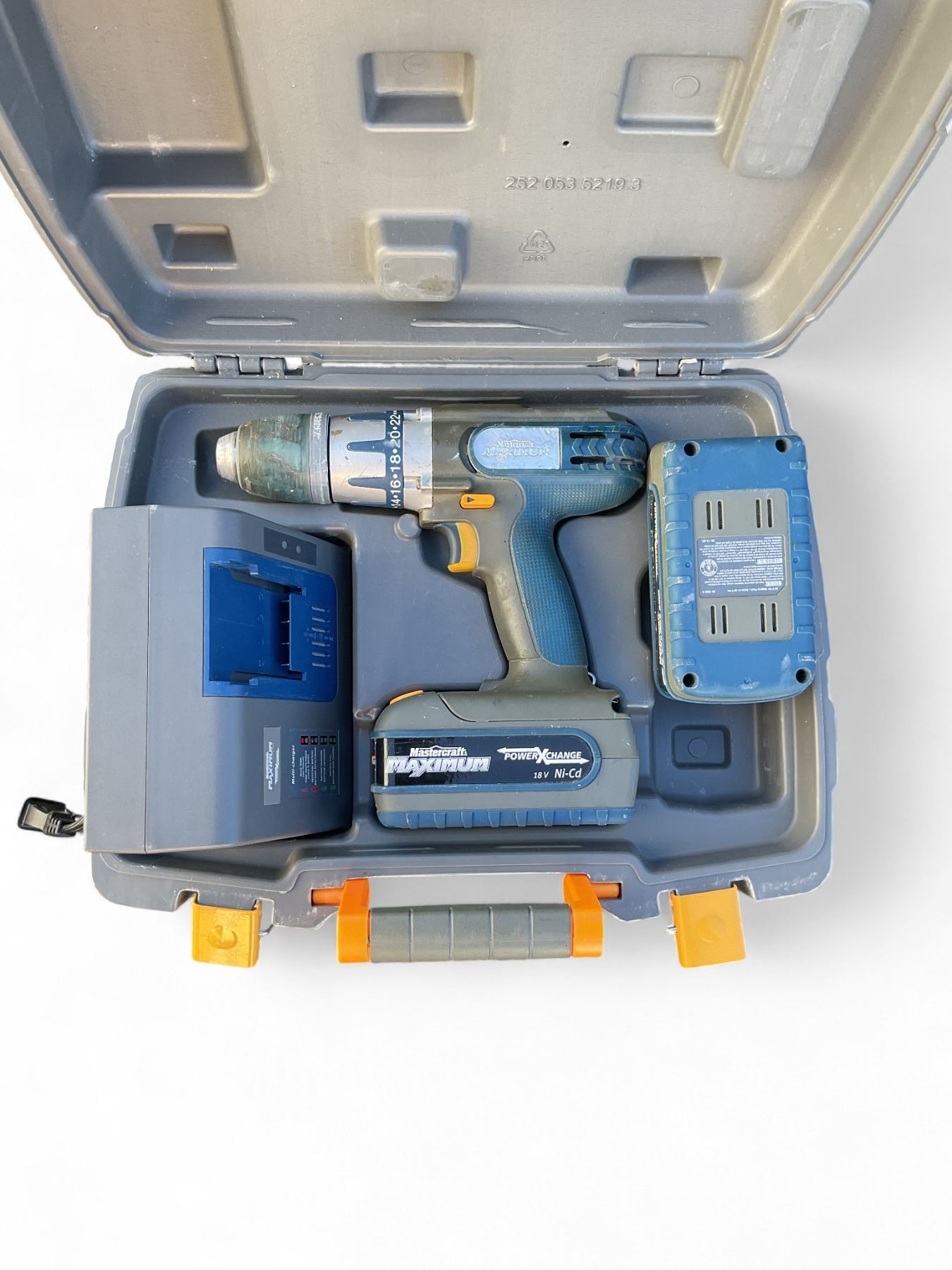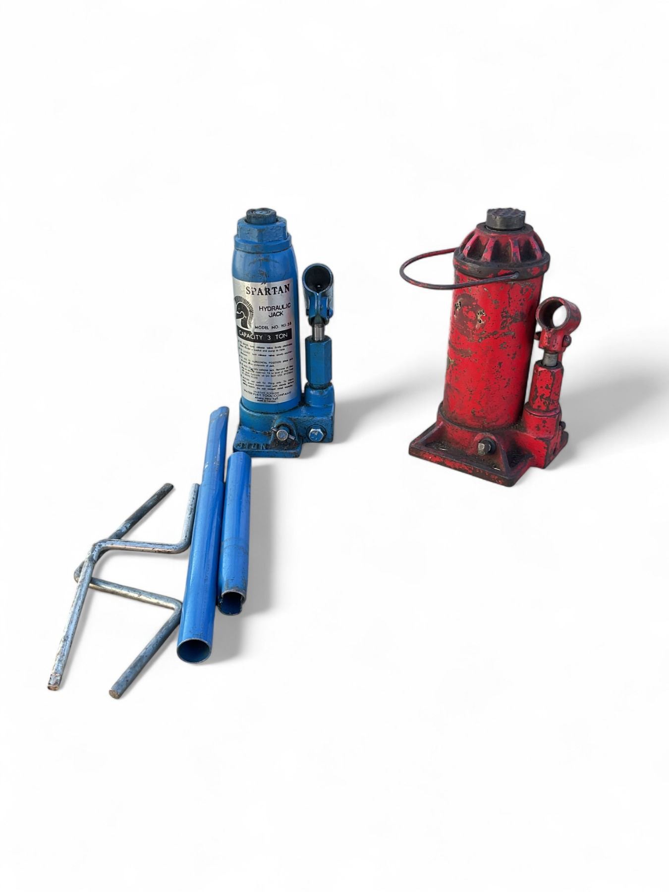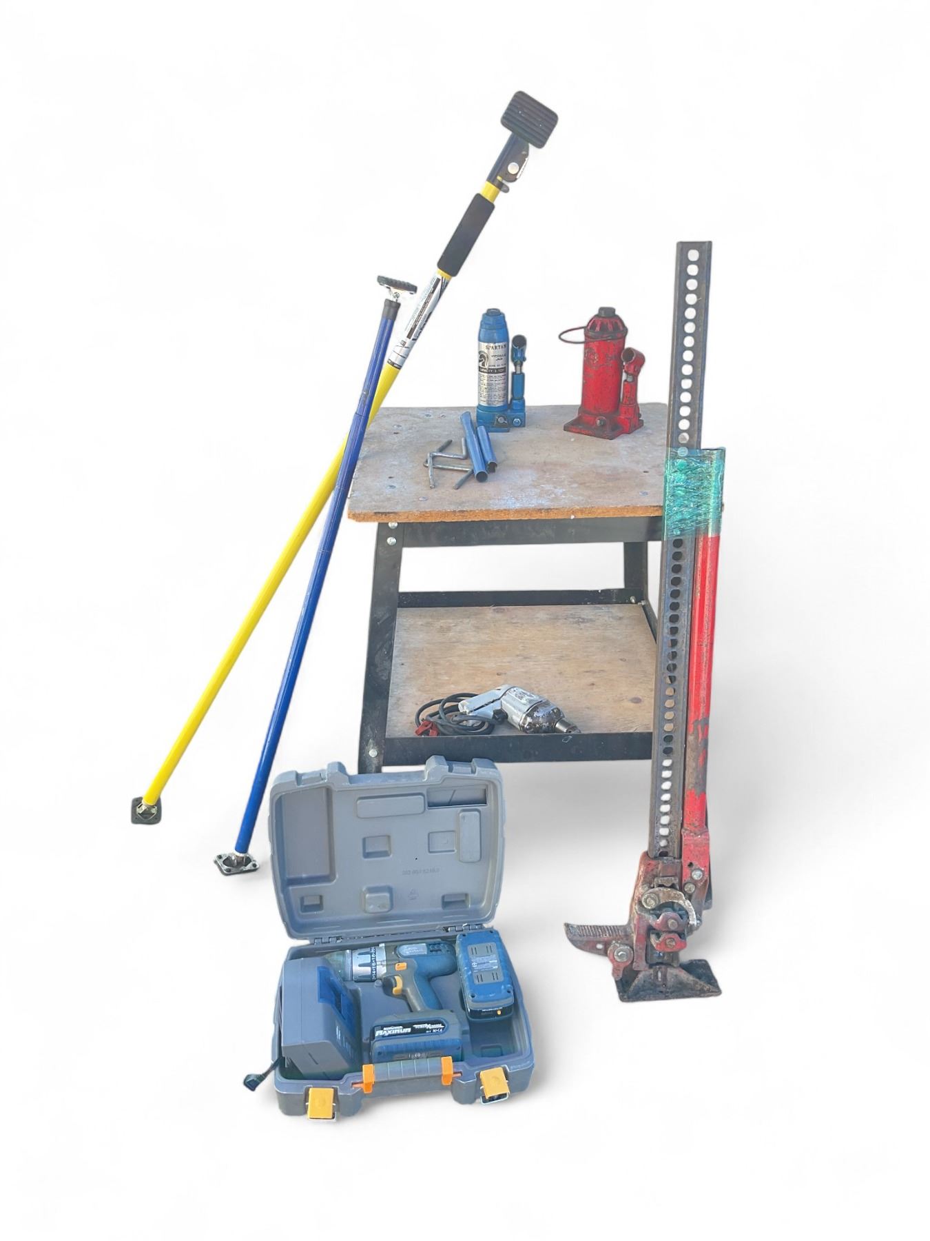 Tool Lot.. Table (Tool Stand) 32" X 21" X 21", 4' Farmer's Jack All, Hydraulic Jacks, Support Rods, MasterCraft 18 V 1/2" Cordless Drill with 2 Batteries (untested)