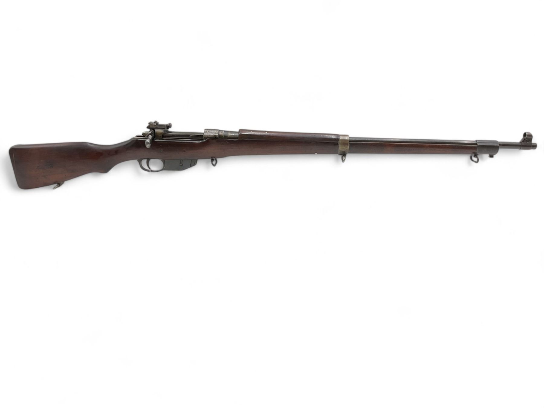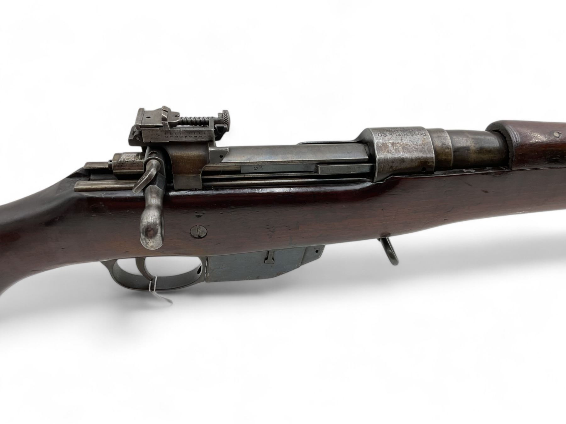 A Toronto Police- and Home Guard-marked M10 Ross straight-pull bolt-action rifle. 30" barrel with bright bore chambered in .303 British. Full wood stock. Fixed external magazine. Hooded front sight, adjustable rear sight. There is a Home Guard HG serial number stamped on the left side of the barrel "HG 12153." There are Home Guard "H.G." and Toronto Police Force rack number 28 marked on the right side of the buttstock.