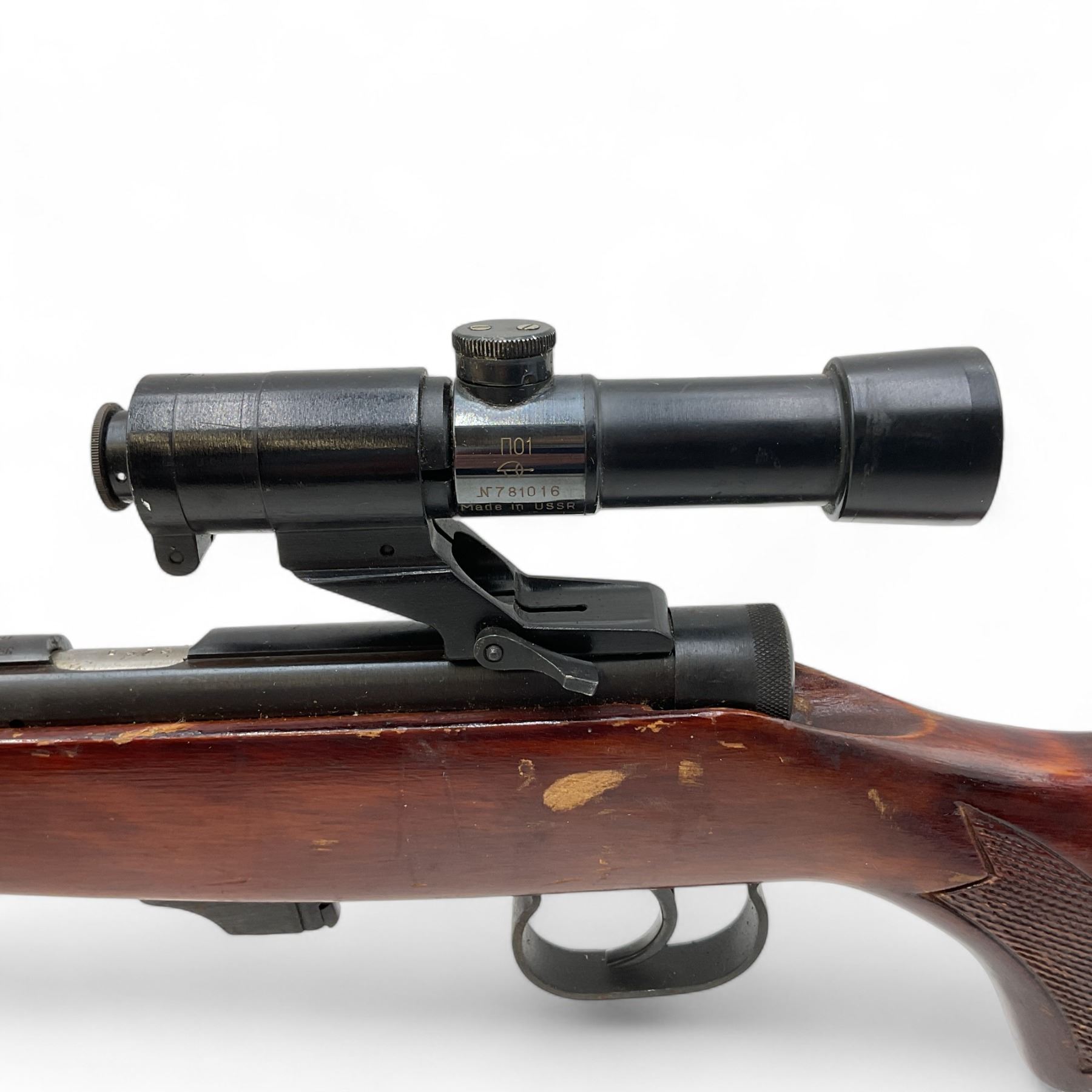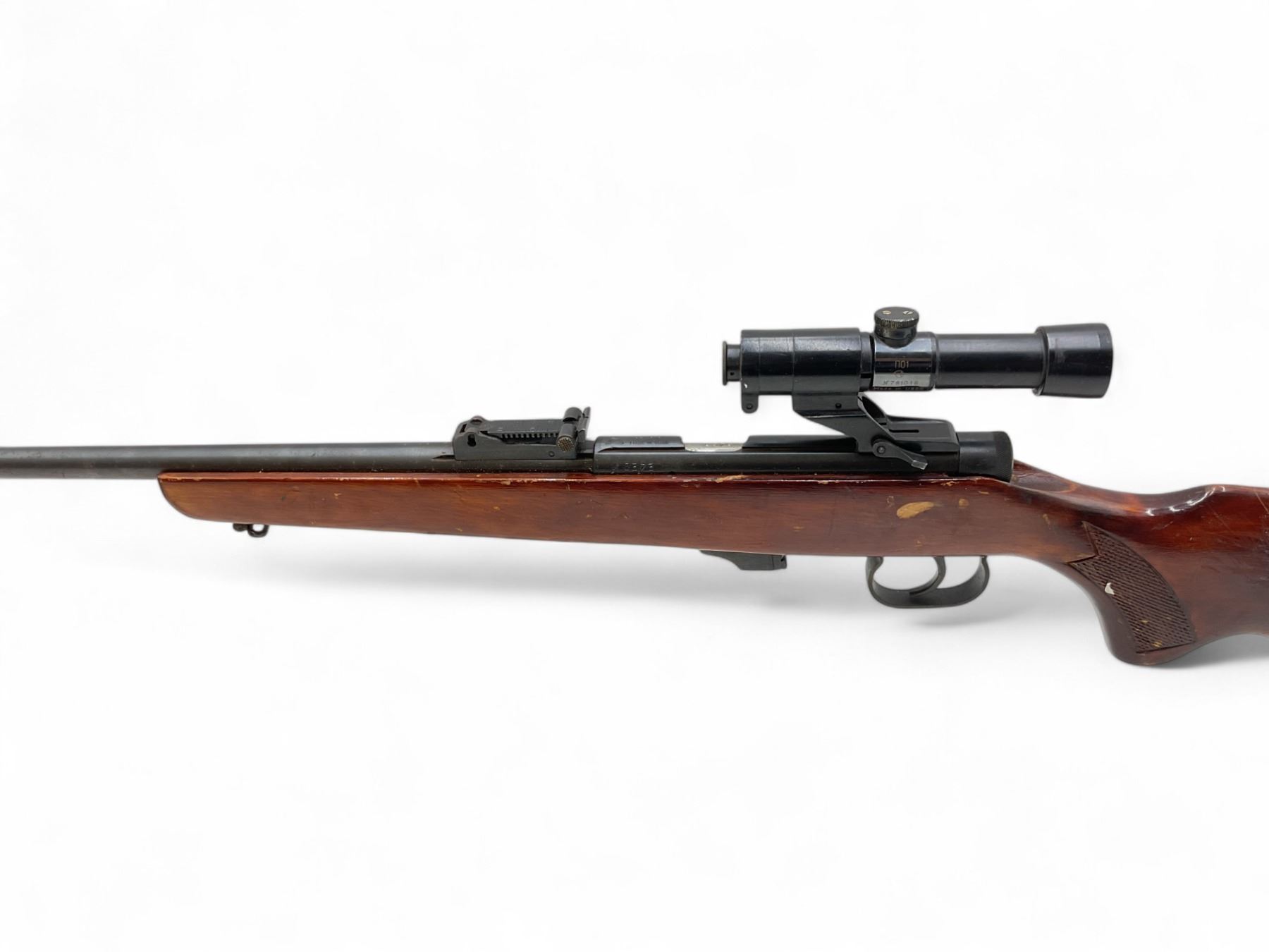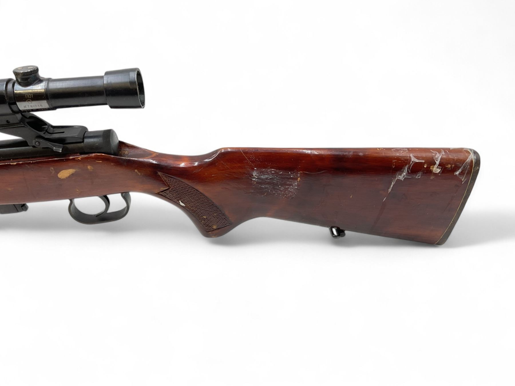 Toz 18-01 Bolt Action Rifle 22LR 21" Barrel Wood Stock With Russian Scope. No magazine included. Ramp front sight, adjustable rear sight. This is a non-restricted firearm.